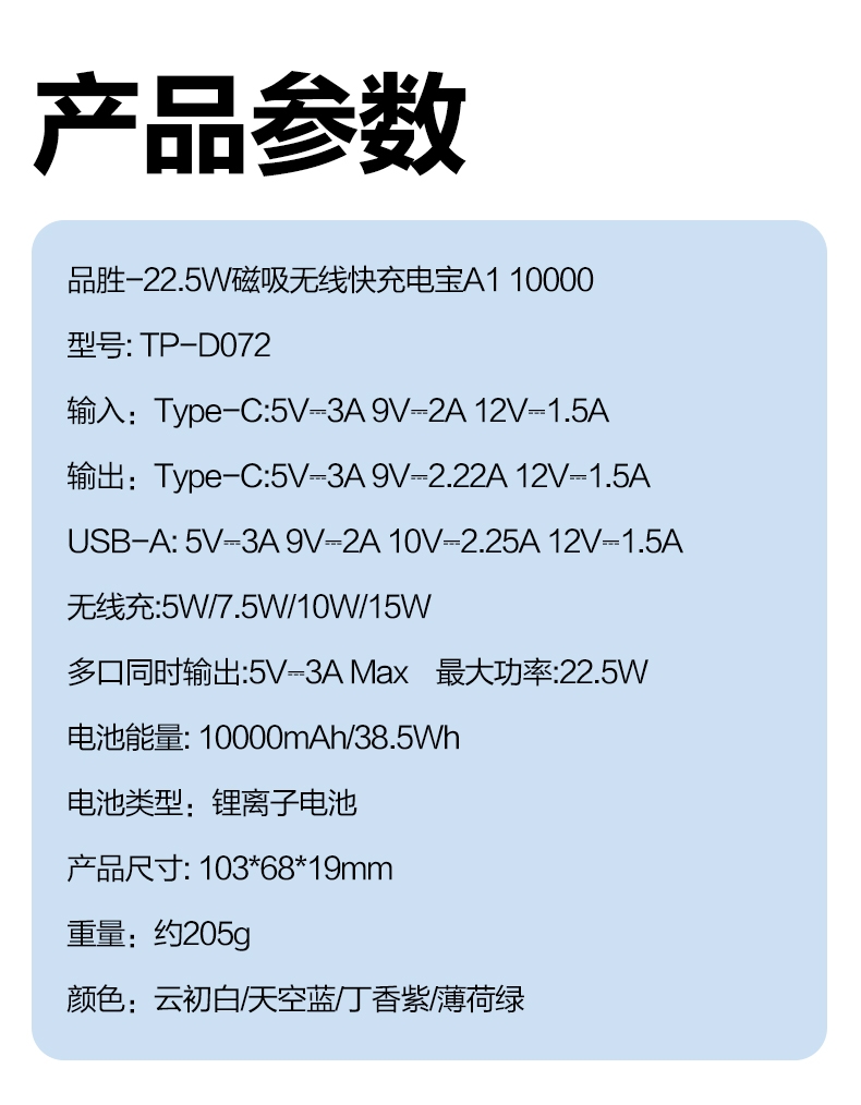 品胜 22.5W磁吸无线快充电宝TP-D072