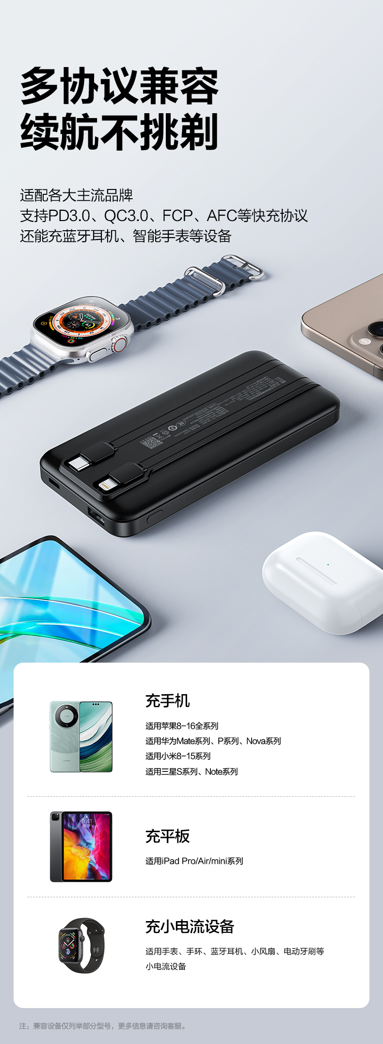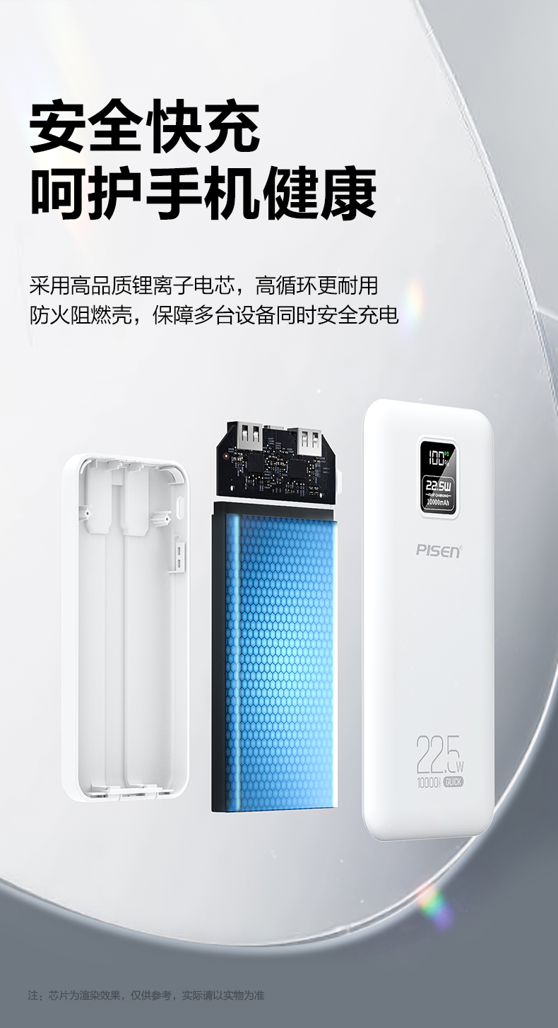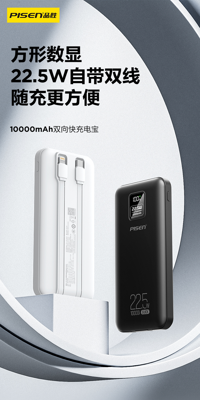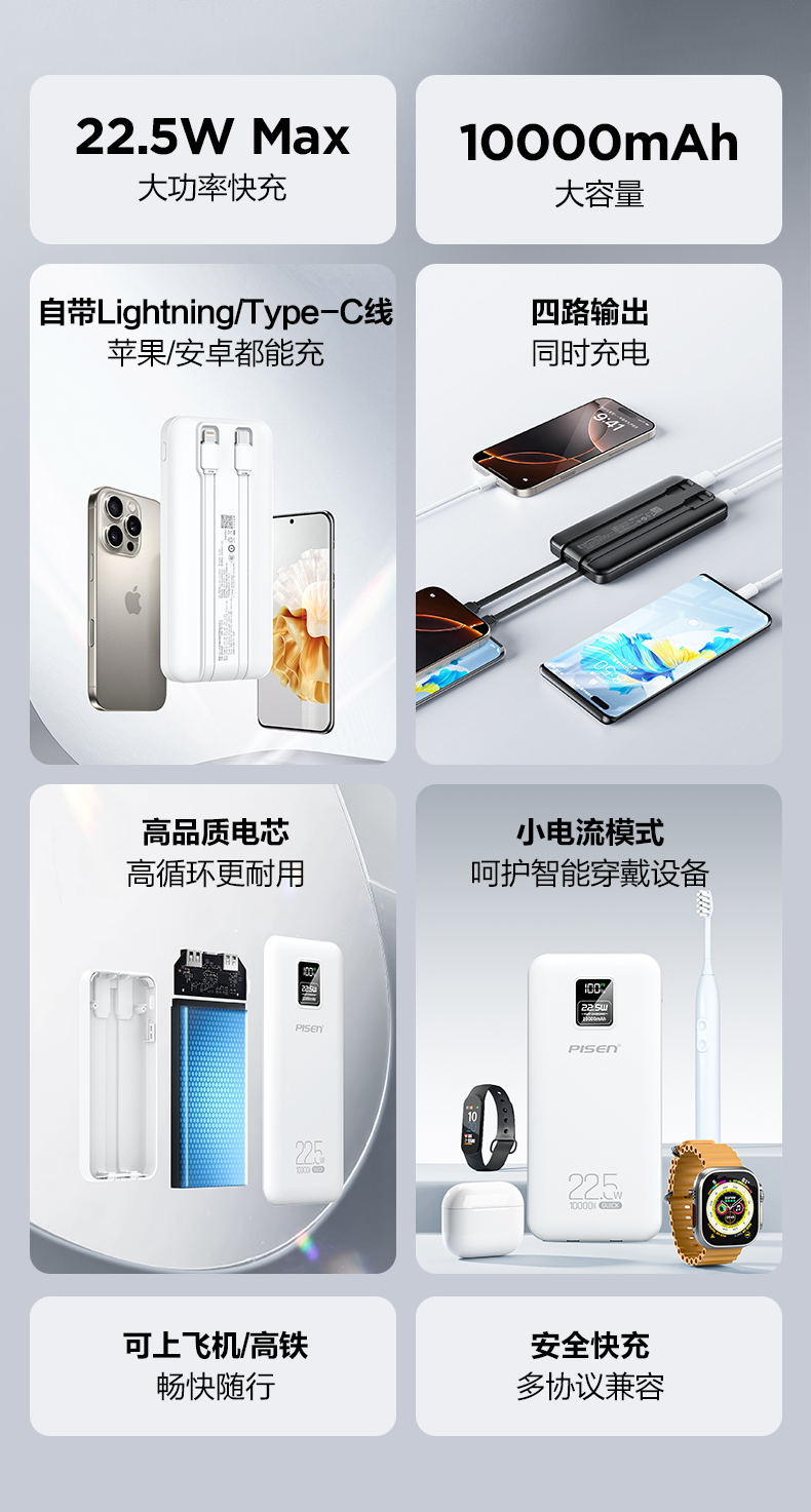 优质10000mAh聚合物锂电芯,大容量,不虚标;优质磨砂质感防火阻燃PC外壳,质感升级;更多快充协议兼容,最高输出22.5W,兼容苹果;自带双线+USB-A+TYPE-C最多支持四输出;LED显示屏实时精确显示剩余电量
