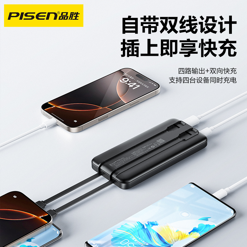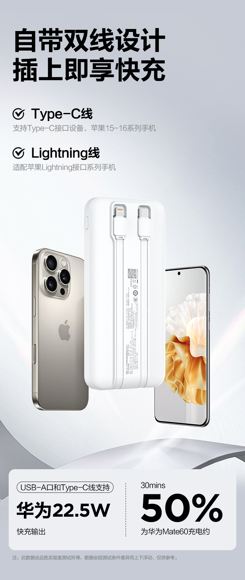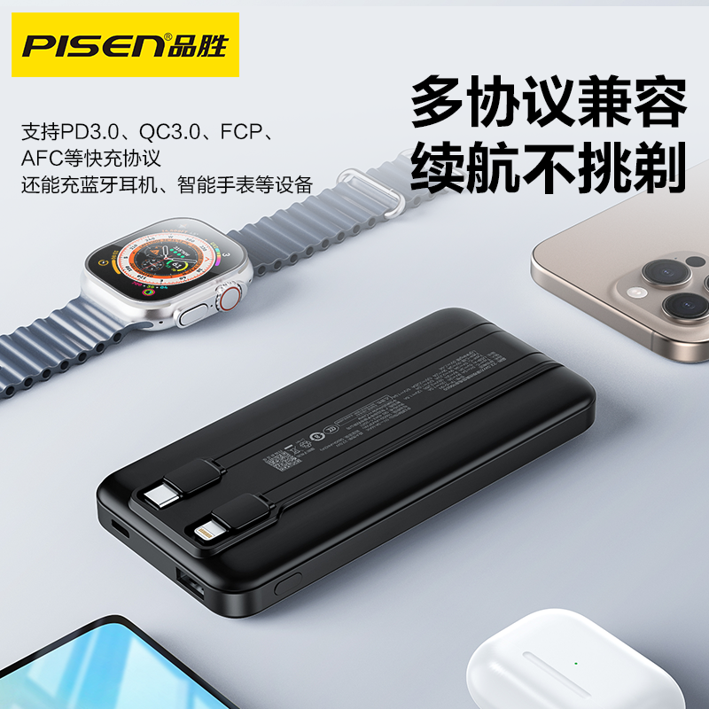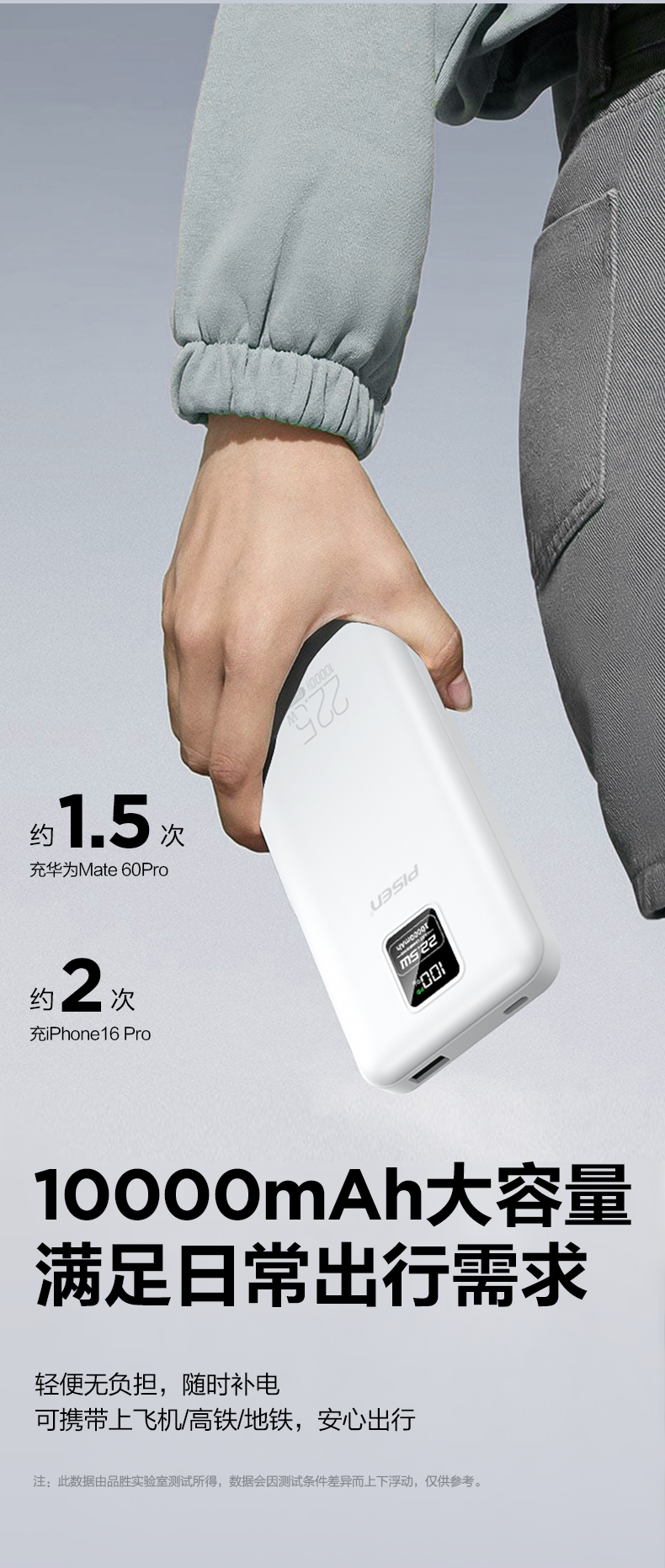 优质10000mAh聚合物锂电芯,大容量,不虚标;优质磨砂质感防火阻燃PC外壳,质感升级;更多快充协议兼容,最高输出22.5W,兼容苹果;自带双线+USB-A+TYPE-C最多支持四输出;LED显示屏实时精确显示剩余电量