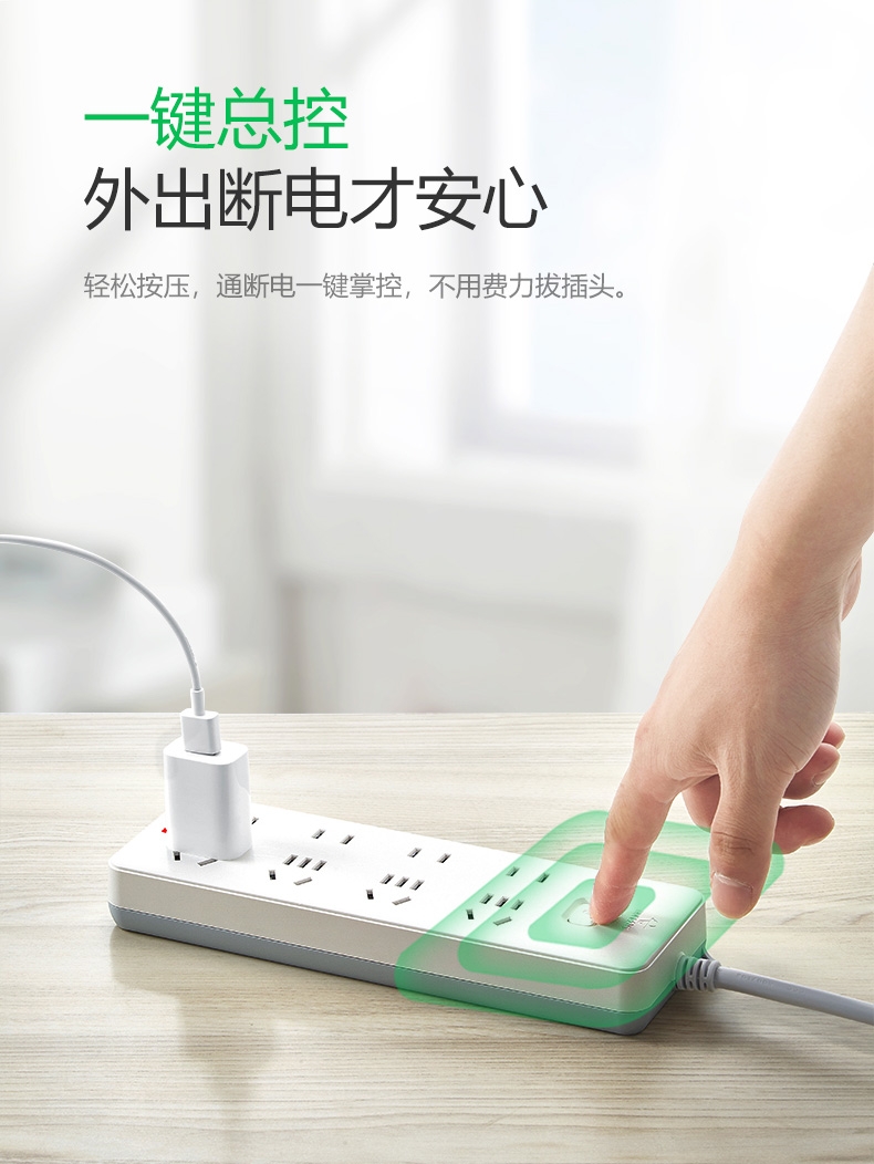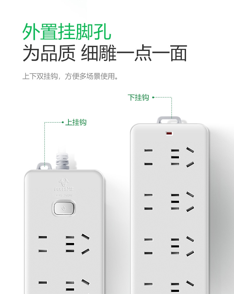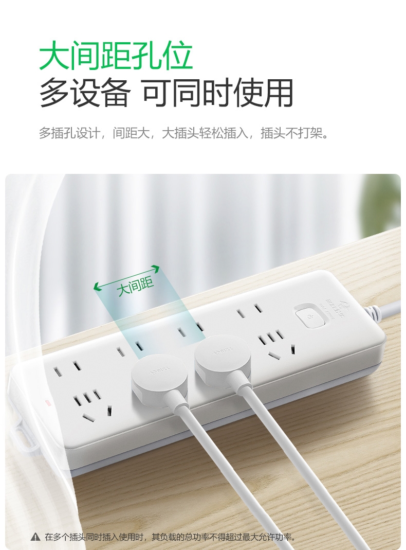 插孔全部新增防触电保护门避免手指或细小物件插入触电;插套铜带一体设计,强扭不变形,耐插拔,使用寿命长;专为大插头设计的大间距插孔,多电器同时使用插拔方便