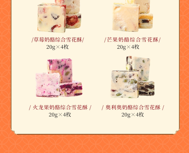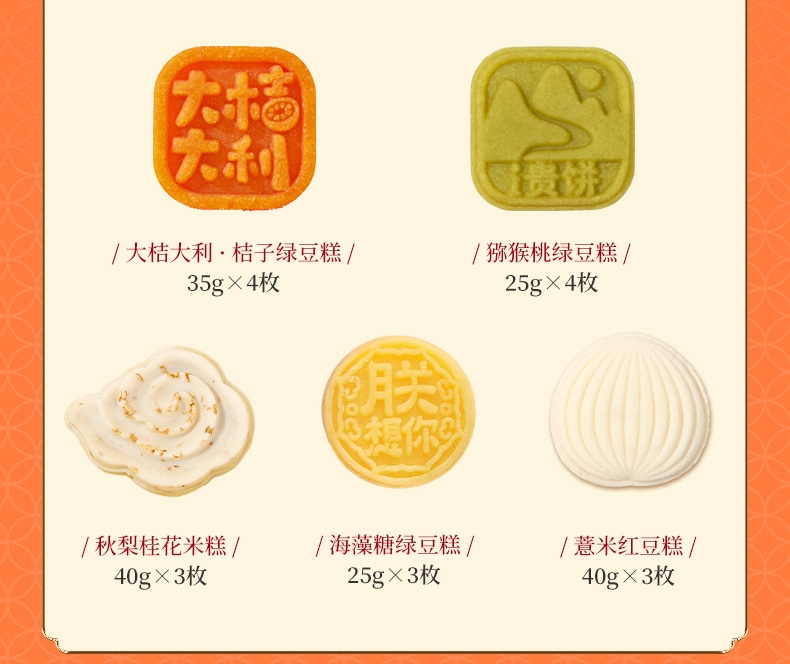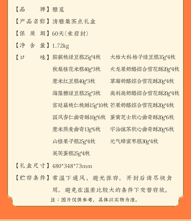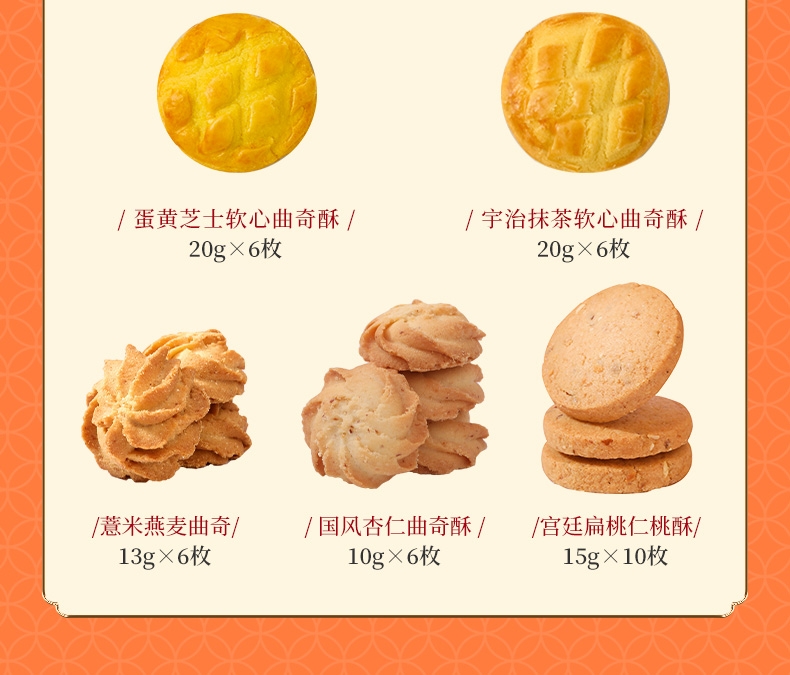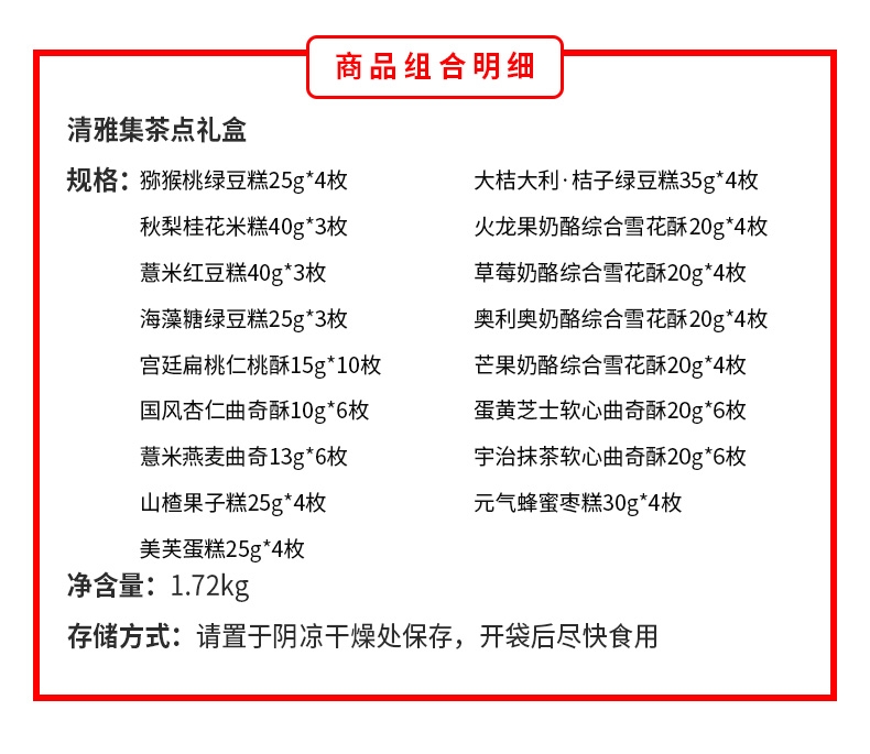 配置清单:猕猴桃绿豆糕25g*4 大桔大利·桔子绿豆糕35g*4 秋梨桂花米糕40g*3 薏米红豆糕40g*3 海藻糖绿豆糕25g*3 蛋黄芝士软心曲奇酥20g*6 宇治抹茶软心曲奇酥20g*6 薏米燕麦曲奇13g*6 国风杏仁曲奇酥10g*6 草莓奶酪综合雪花酥20g*4 芒果奶酪综合雪花酥20g*4 火龙果奶酪综合雪花酥20g*4 奥利奥奶酪综合雪花酥20g*4 宫廷扁桃仁桃酥15g*10 元气蜂蜜枣糕30g*4 山楂果子糕25g*4 美芙蛋糕25g*4