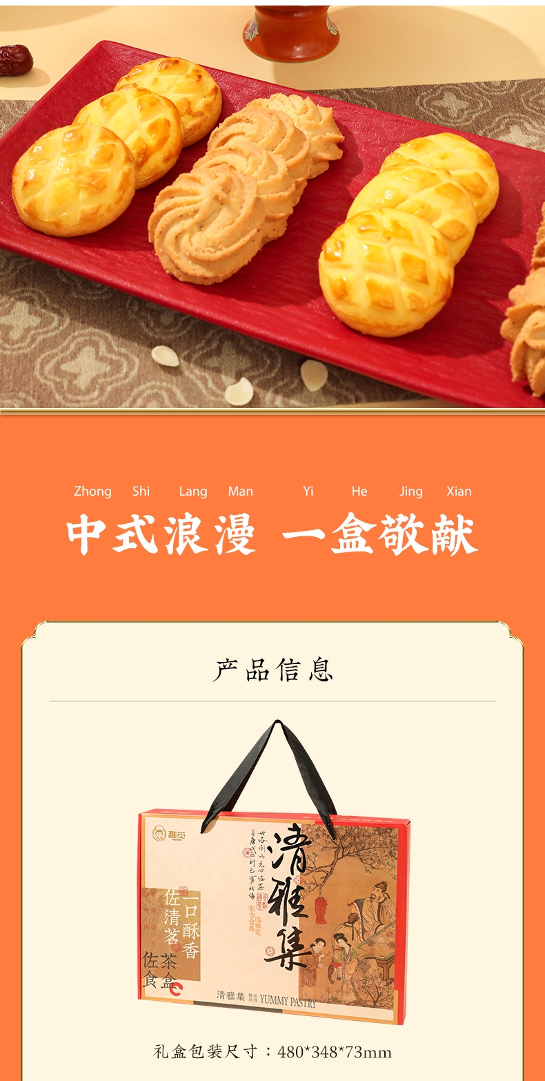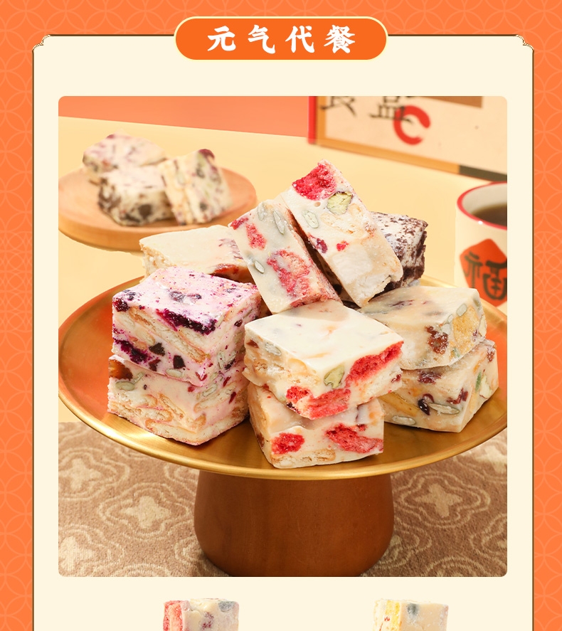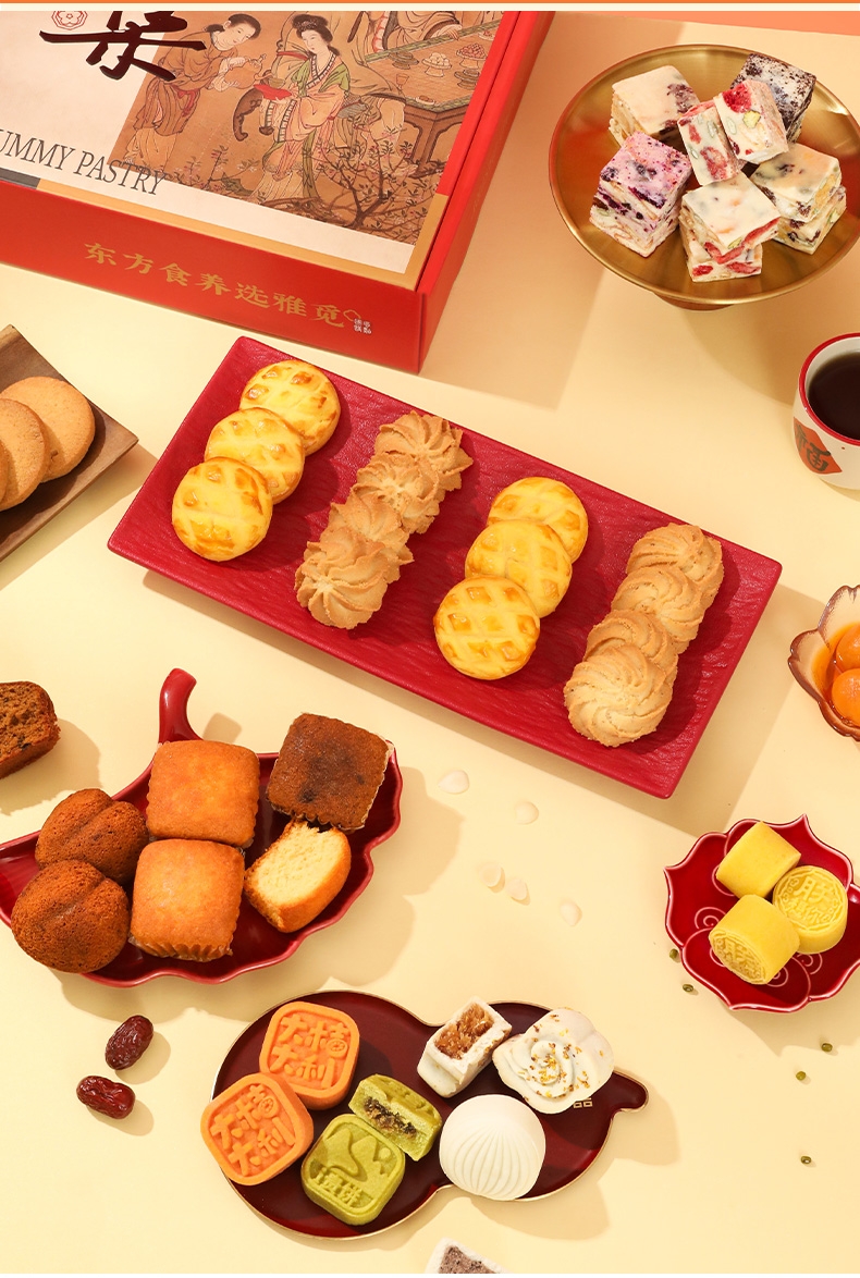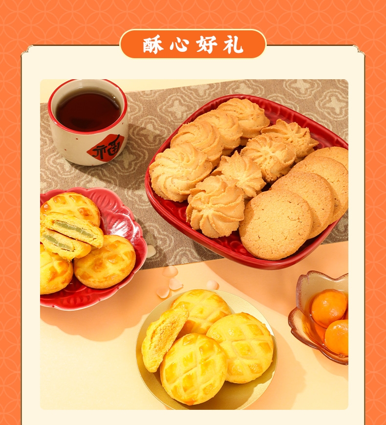 配置清单:猕猴桃绿豆糕25g*4 大桔大利·桔子绿豆糕35g*4 秋梨桂花米糕40g*3 薏米红豆糕40g*3 海藻糖绿豆糕25g*3 蛋黄芝士软心曲奇酥20g*6 宇治抹茶软心曲奇酥20g*6 薏米燕麦曲奇13g*6 国风杏仁曲奇酥10g*6 草莓奶酪综合雪花酥20g*4 芒果奶酪综合雪花酥20g*4 火龙果奶酪综合雪花酥20g*4 奥利奥奶酪综合雪花酥20g*4 宫廷扁桃仁桃酥15g*10 元气蜂蜜枣糕30g*4 山楂果子糕25g*4 美芙蛋糕25g*4