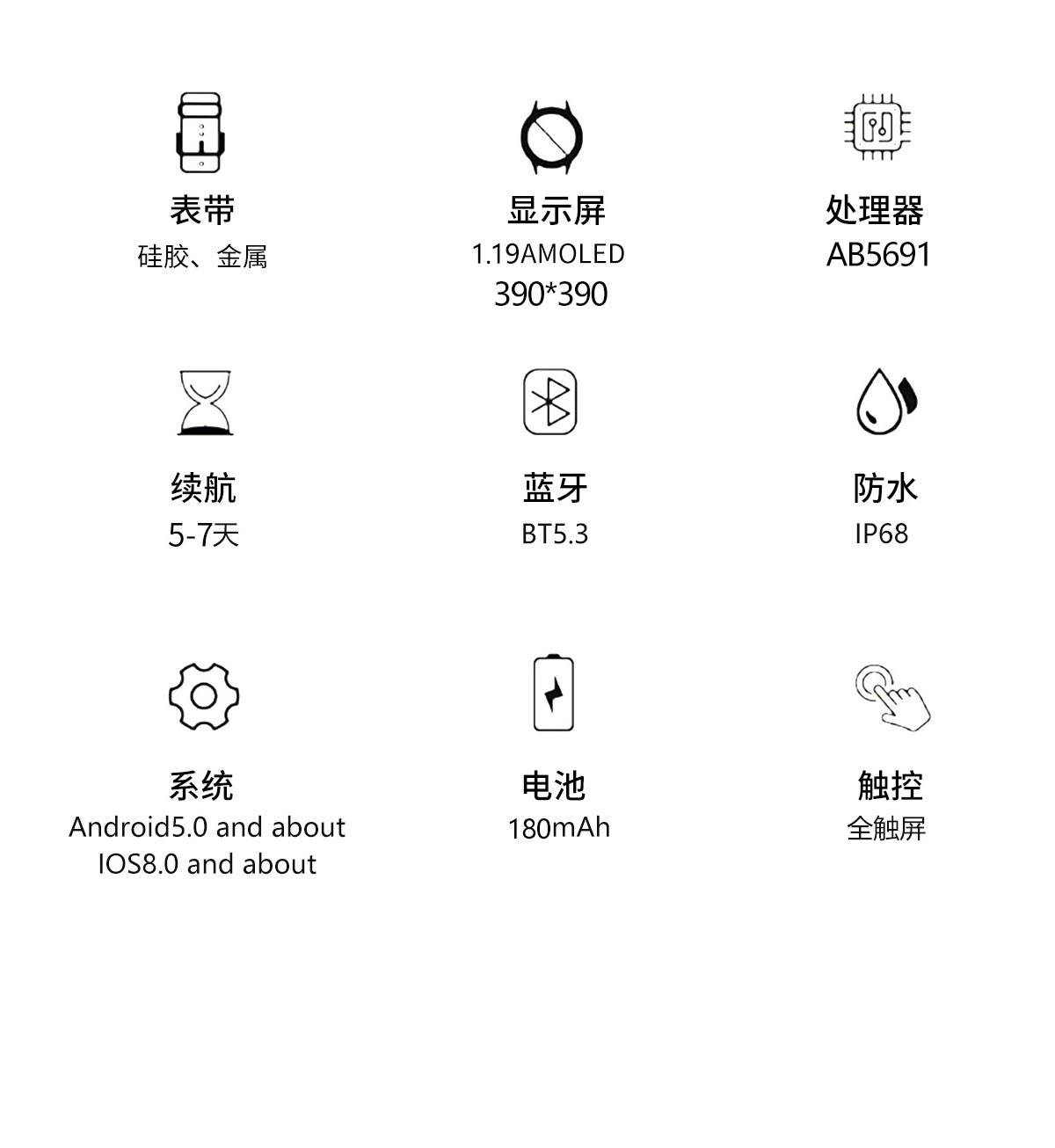 蓝牙通话、NFC门禁、AI语音助手、支付宝离线支付;自定义表盘、信息查看、消息提醒、女性健康、天气预报;百种运动模式、心率监测、睡眠监测、血氧监测、血压监