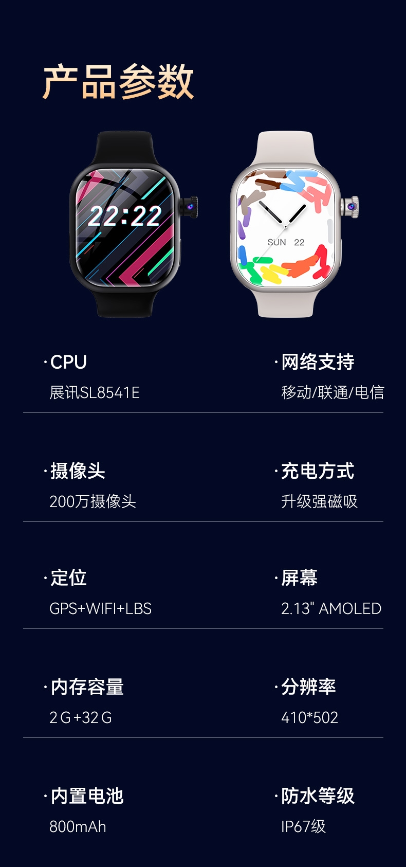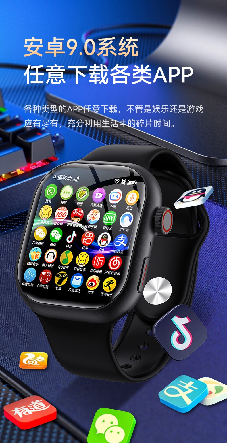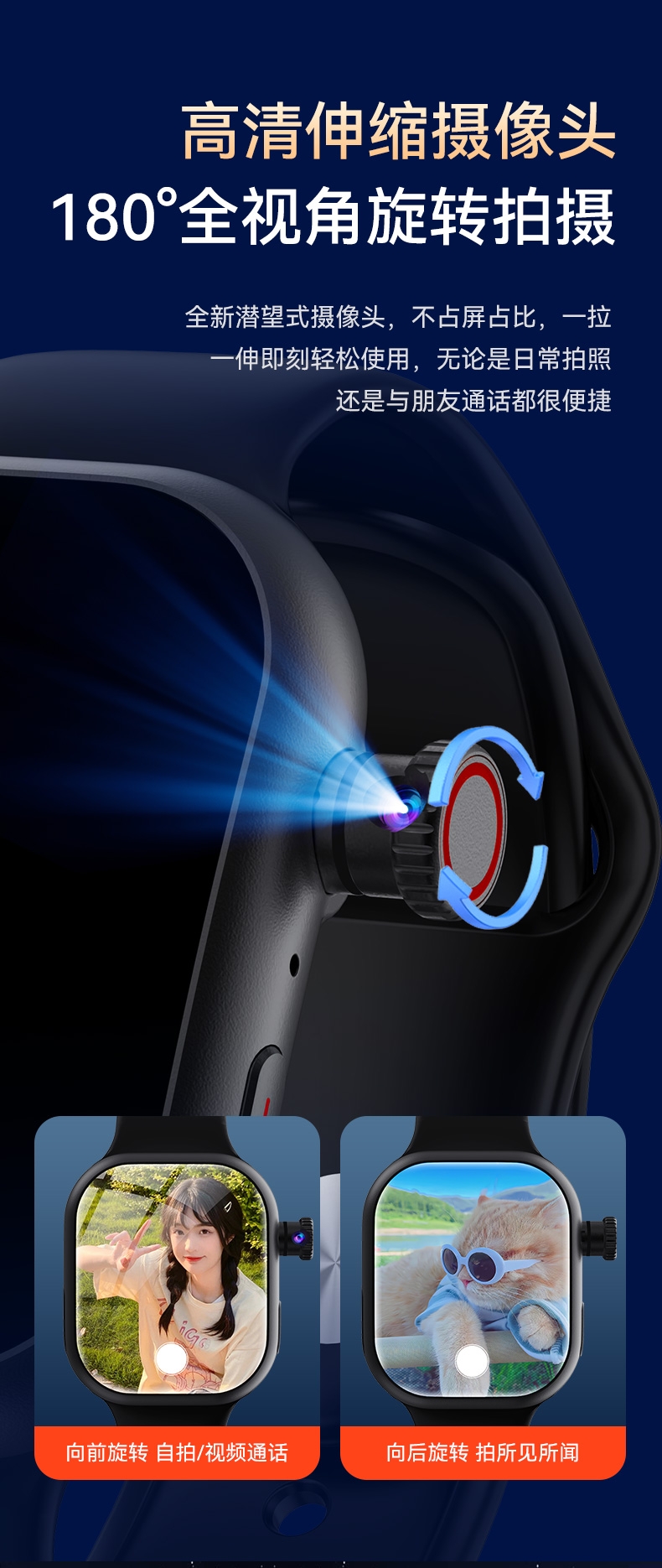 4G通话、视频通话、伸缩旋转摄像头、;NFC门禁、应用下载、多运动模式、心率检测、;血氧检测、科大讯飞AI语音、可看小说、抖音、微信、