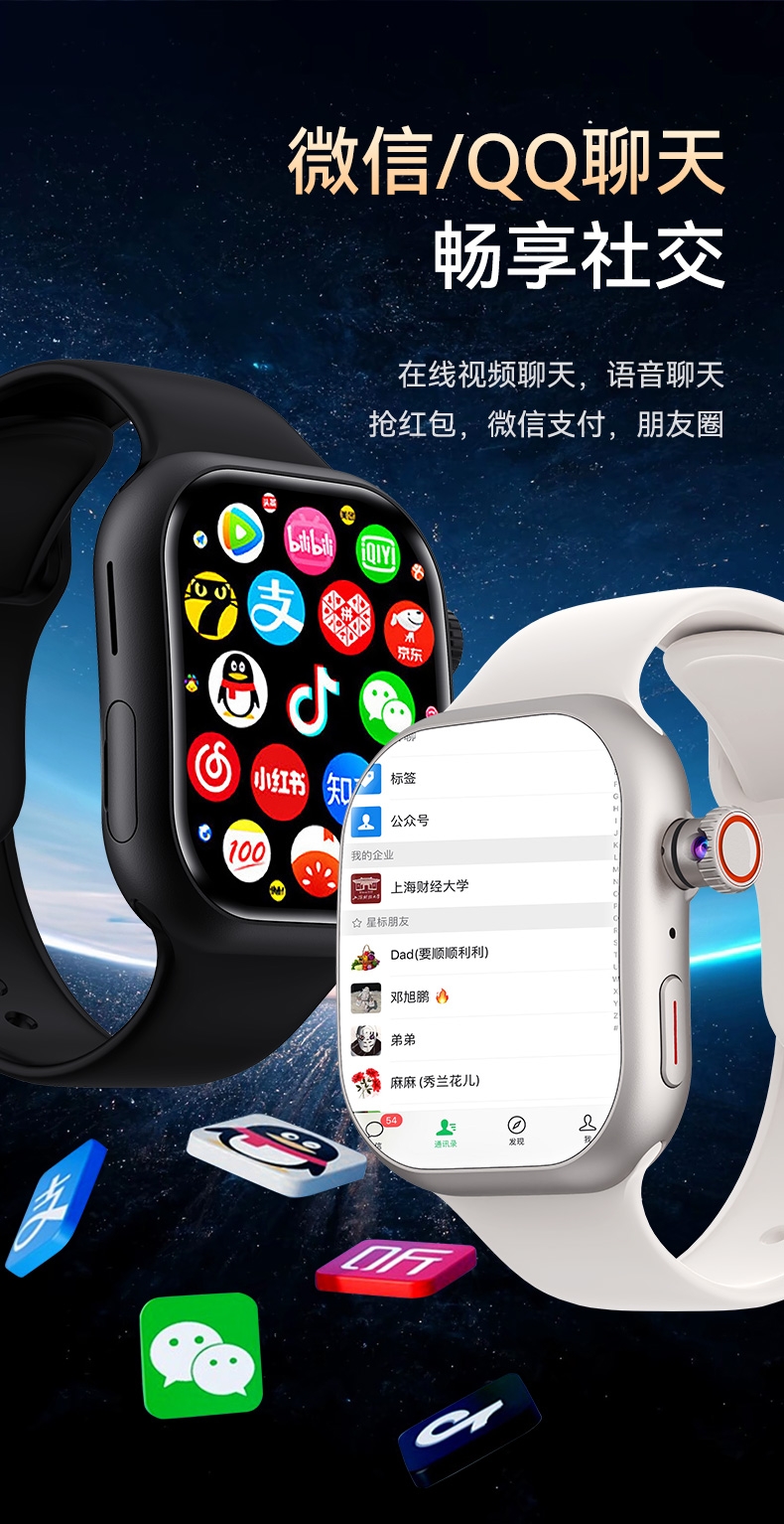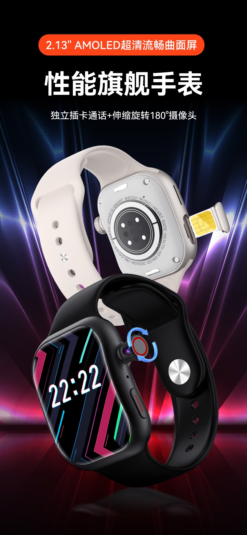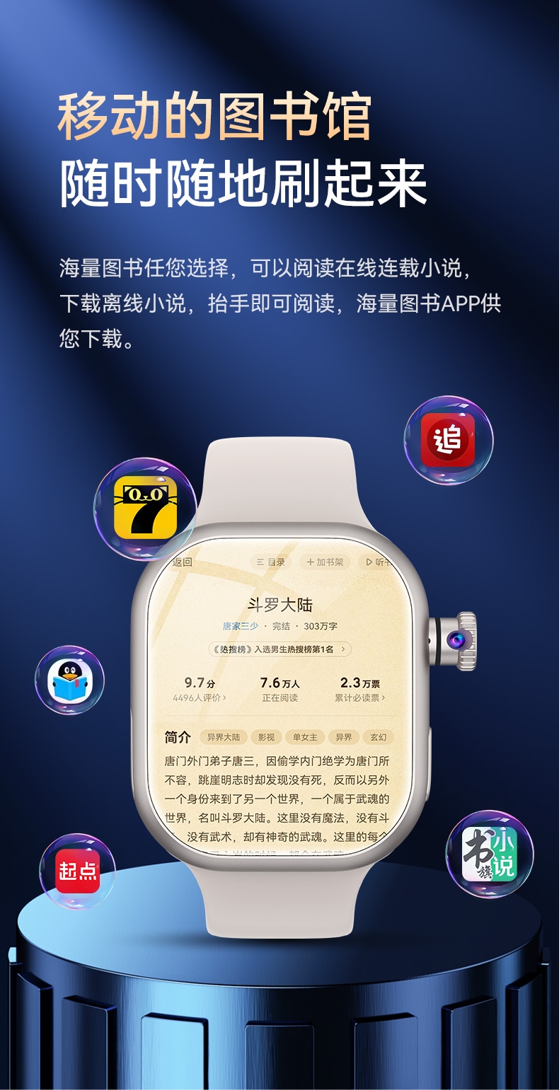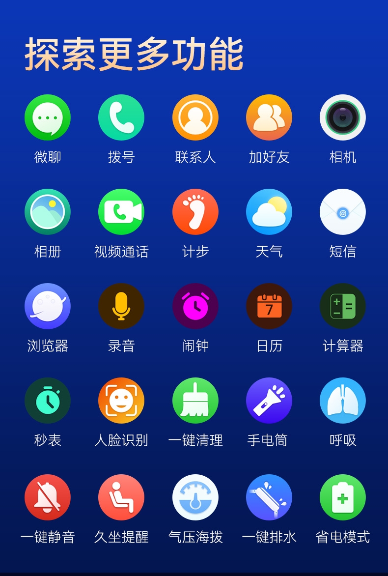 4G通话、视频通话、伸缩旋转摄像头、;NFC门禁、应用下载、多运动模式、心率检测、;血氧检测、科大讯飞AI语音、可看小说、抖音、微信、