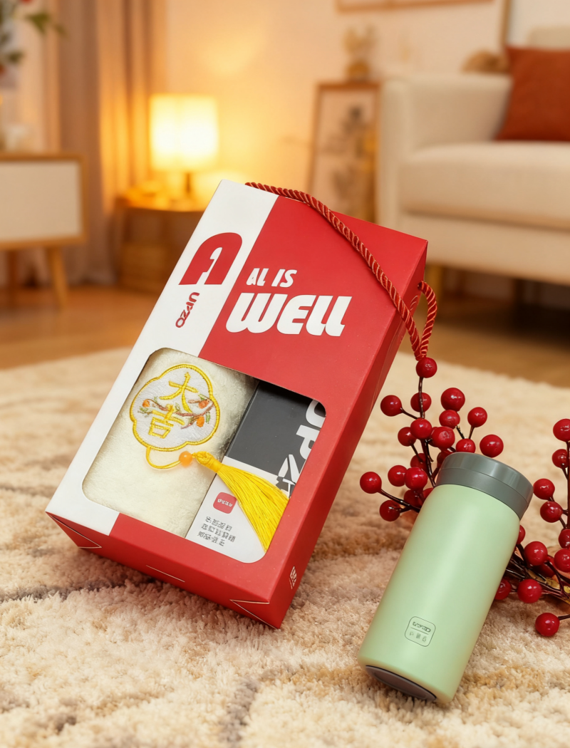 小确幸主题杯 设计融入祝福语 产品撞色搭配;微米国风毛巾 精制包边 厚实面料 结合国风刺绣 ;手提盒设计 顺遂主题融入 优质伴手礼