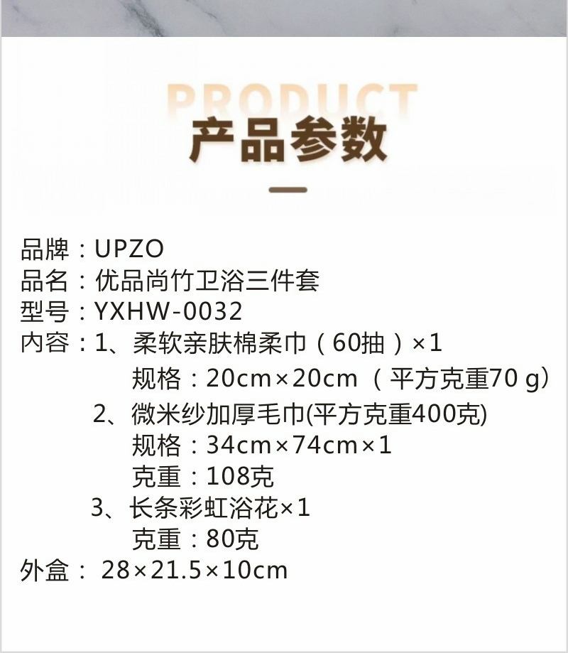 配置清单:洗脸巾*1、浴花*1、干发巾*1