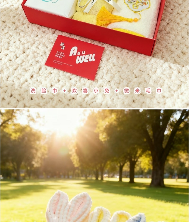 配置清单:洗脸巾*1、欢喜小兔*1、国风微米毛巾*1