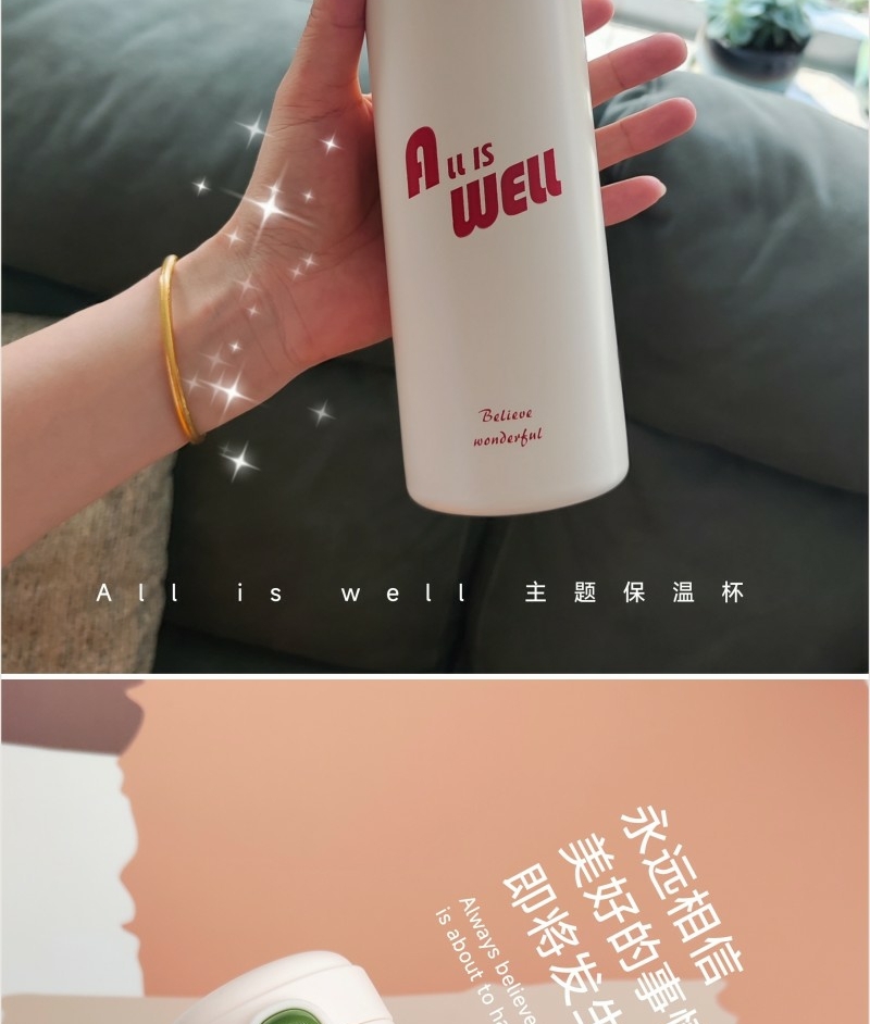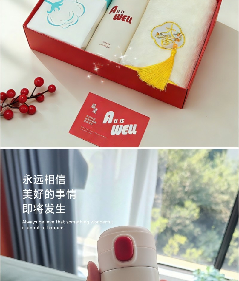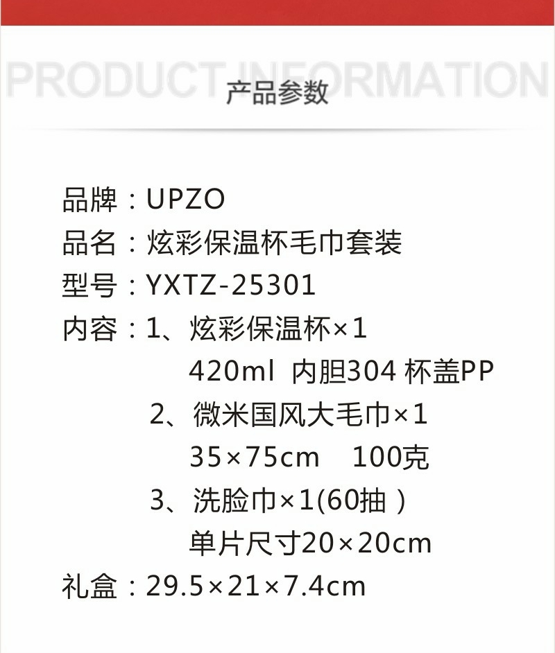 420毫升高颜值保温杯 304内胆 精美设计文案;棉柔巾60抽每包 加厚设计平方克重70克;微米国风毛巾 精制包边 厚实面料 结合国风刺绣