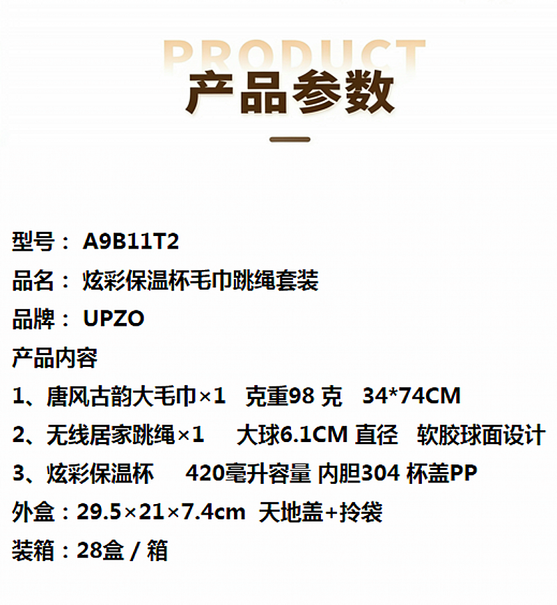 配置清单:保温杯*1、唐风毛巾*1、居家跳绳*1