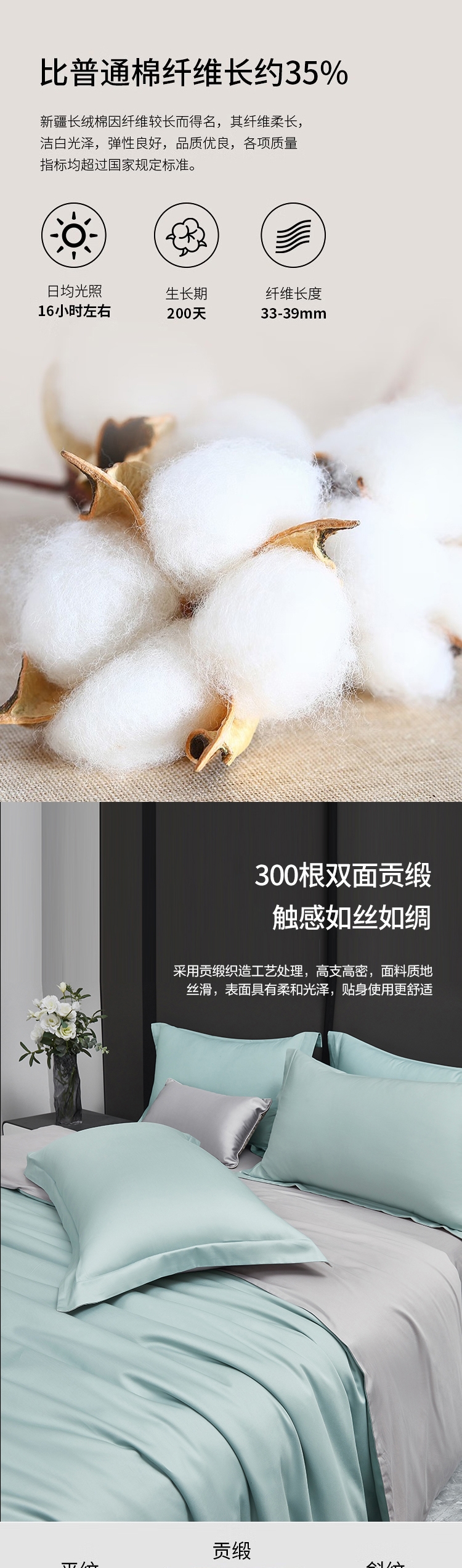 新疆长绒棉,经严格工序,梳去较短纤维;去除杂质,使棉花更有韧性,更不易起球。;面料柔软平整,亲肤细腻,透气性佳;经过超柔处理,超柔、丝滑一流手感