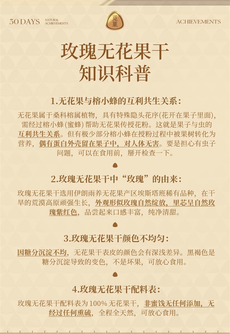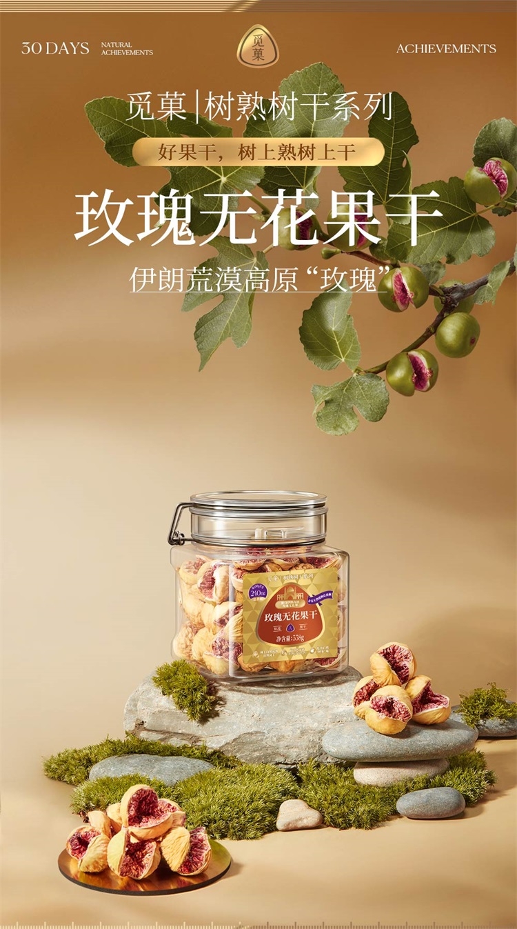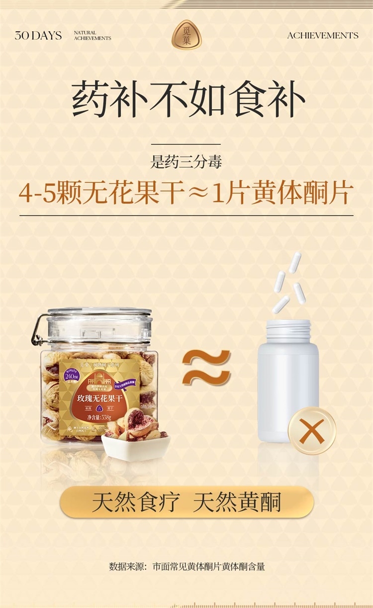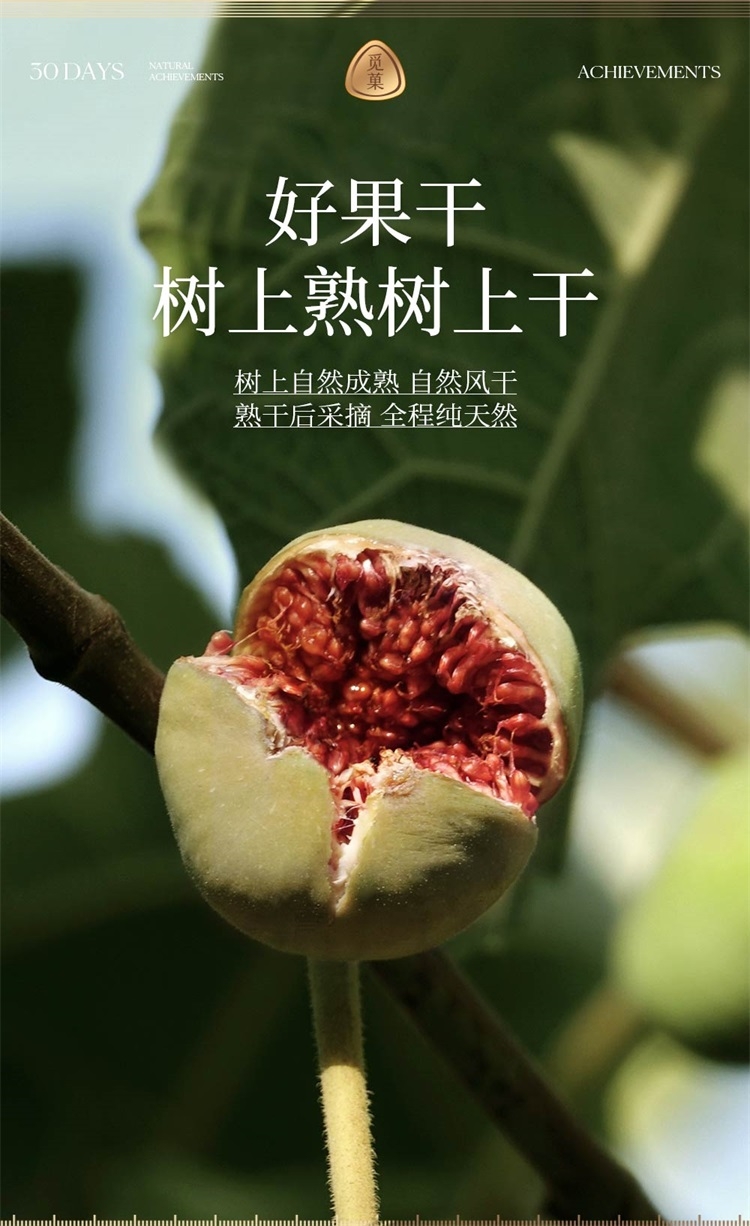 树上自然成熟 自然风干后采摘 全程纯天然;无花果干内的异黄酮 可以刺激人体 产生更多的黄体酮;3倍高钙牛奶钙含量 还富含维生素D促进钙吸收