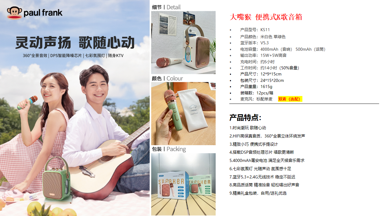 时尚潮玩 歌随心动,HIFI高保真音质;搭载DSP音频处理芯片 唱歌更清晰;4000mAh毫安电池 满足全天候音乐需求;蓝牙5.3+2.4G无线技术 稳定不延迟;精美礼盒包装,自用/送礼优选