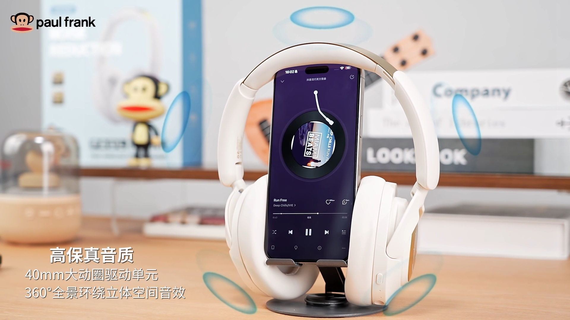 高保真音质,360°全景环绕立体空间音效,悦享佳音;40mm超感大动圈驱动单元,三频层次分明,细节尽数;ANC主动降噪,-35db深度降噪,一秒进入静逸舒;全新蓝牙6.0 传输速度更快,更稳,音质解析更强;1000毫安超大容量电池,超长续航音乐体验
