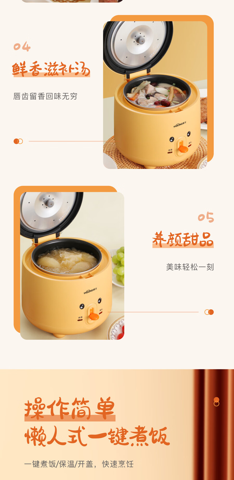 聚能内胆美食无需等待;一键操作 简单方便快捷;小巧体积外观精致轻松收纳