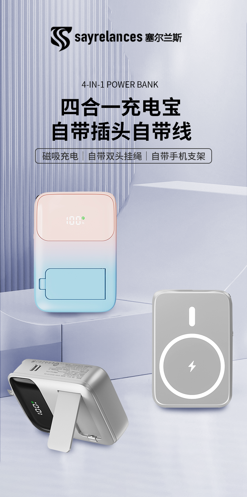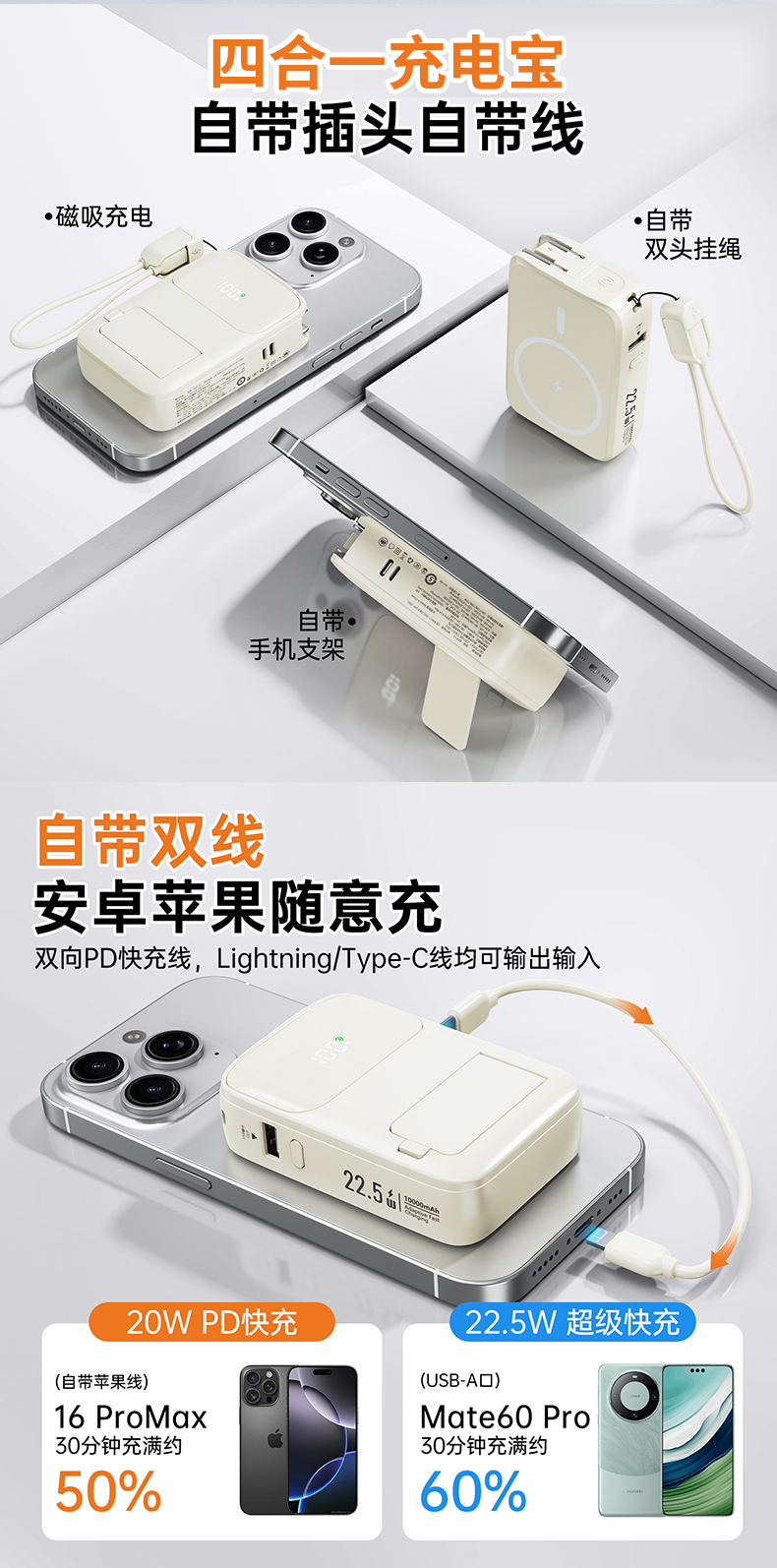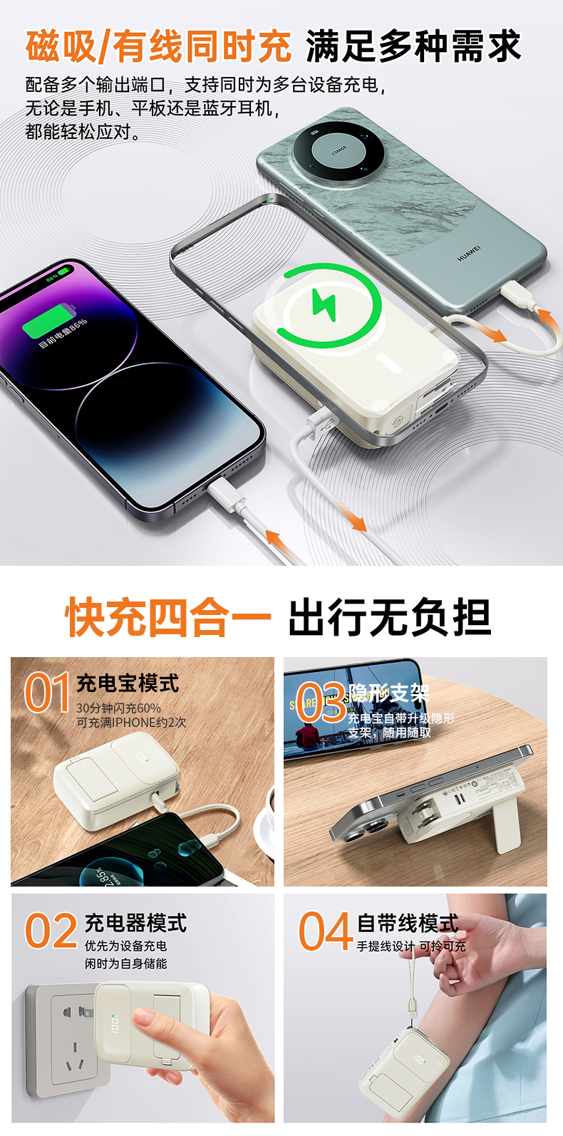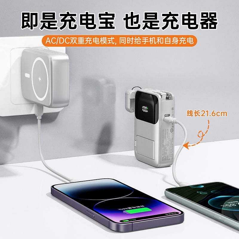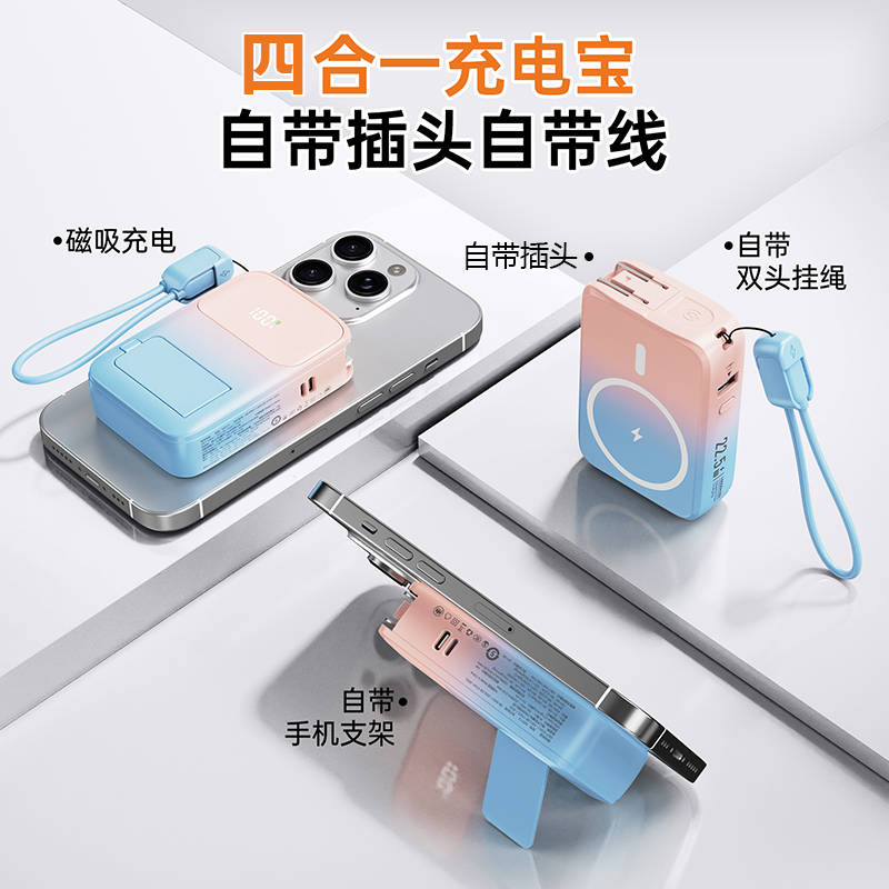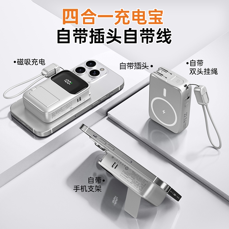 四合一充电宝自带插头、自带线、磁吸充电、自带支架;;.即是充电宝 也是充电器、AC/DC双重充电模式,;充电宝自带升级隐形支架,随用随取出门在外不再担心手