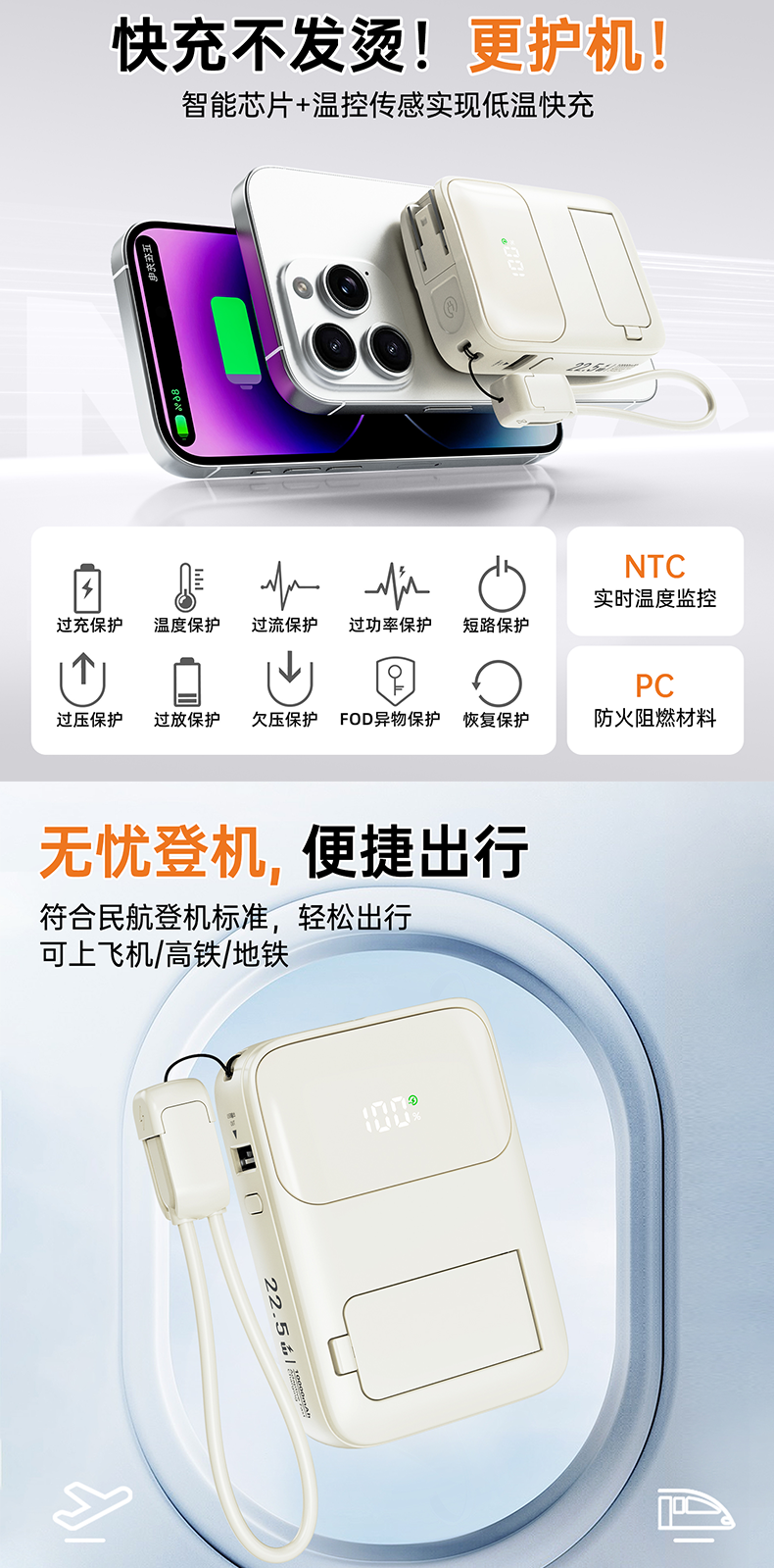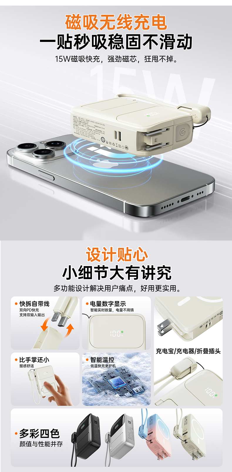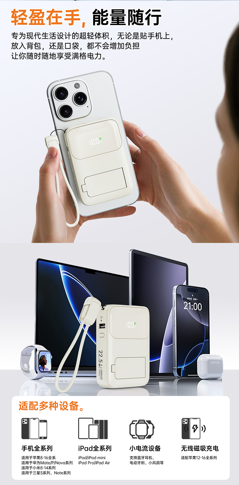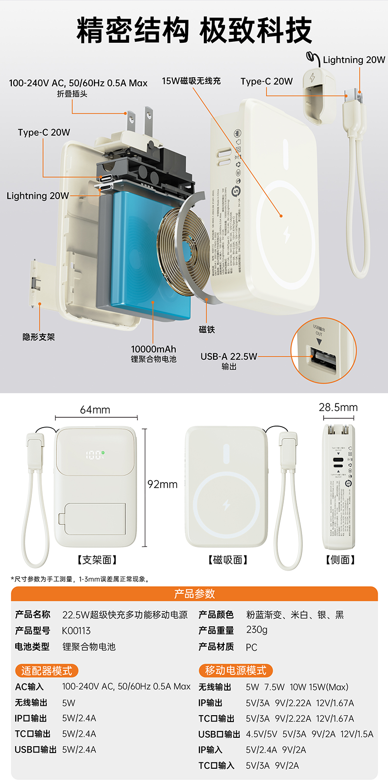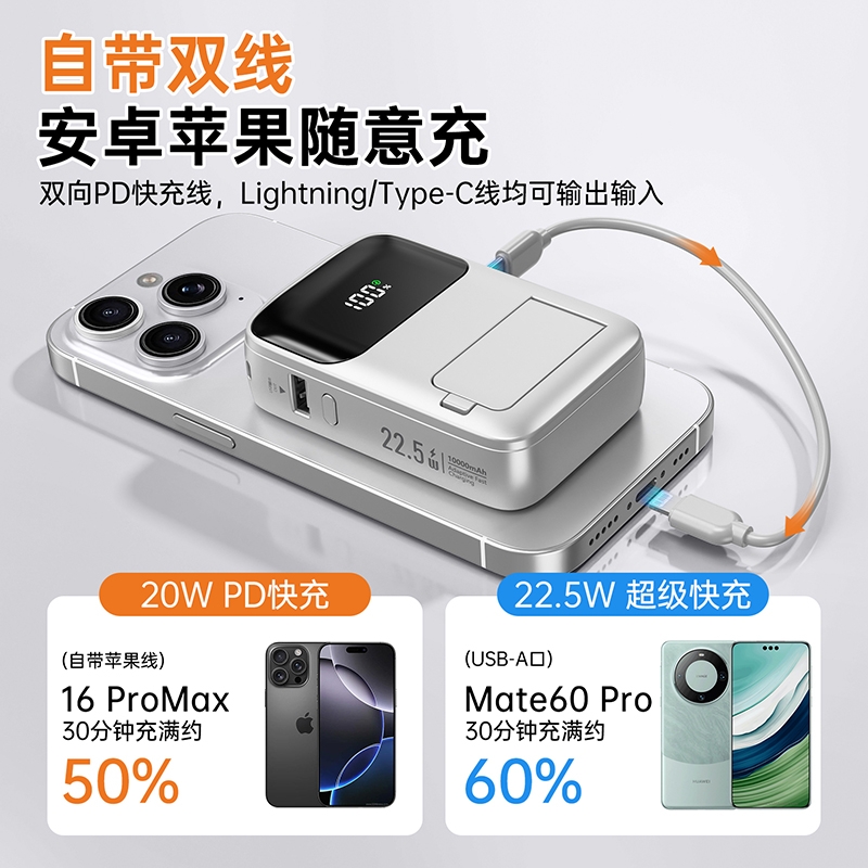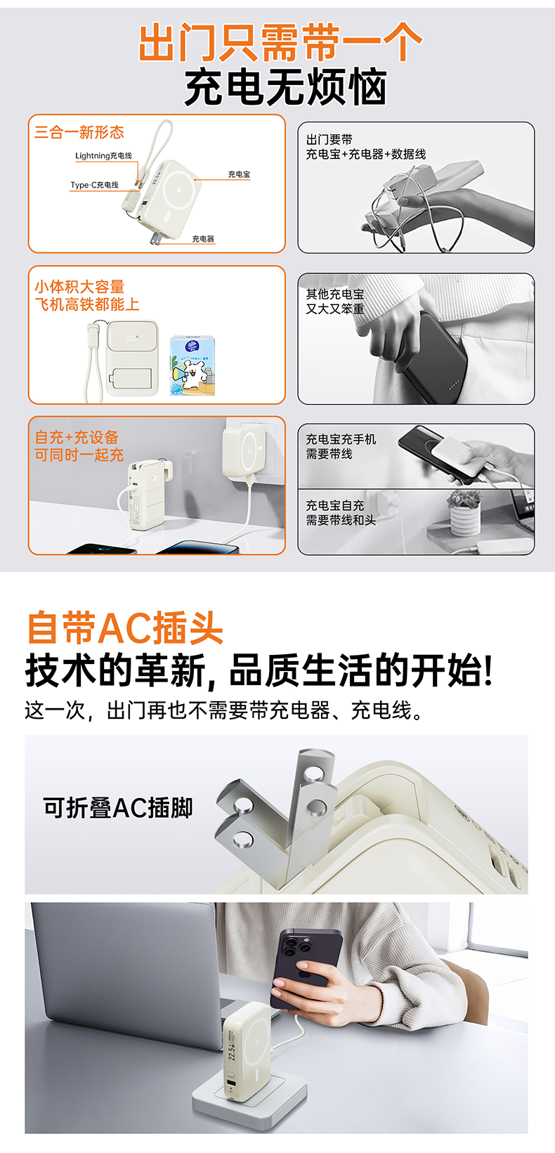 四合一充电宝自带插头、自带线、磁吸充电、自带支架;;.即是充电宝 也是充电器、AC/DC双重充电模式,;充电宝自带升级隐形支架,随用随取出门在外不再担心手