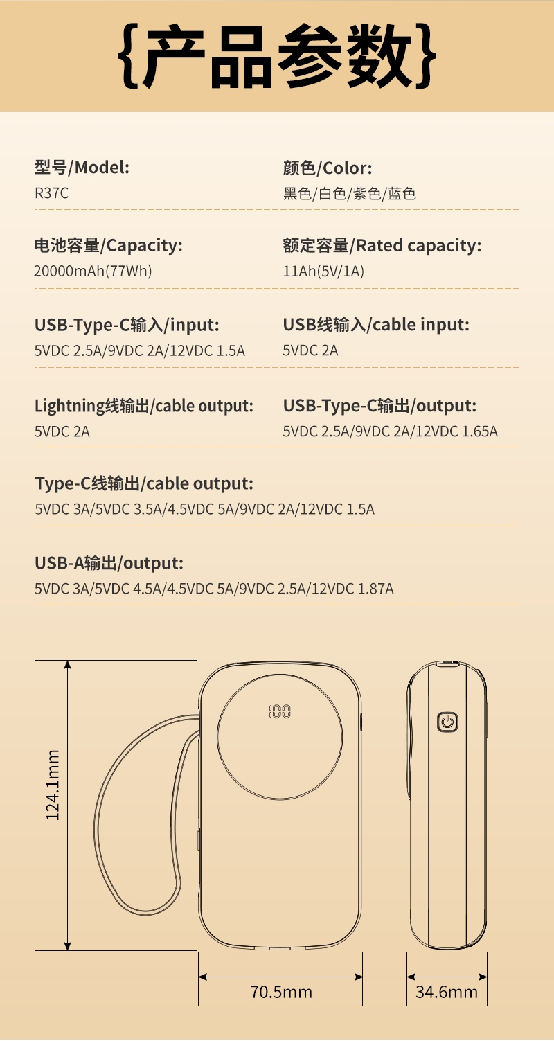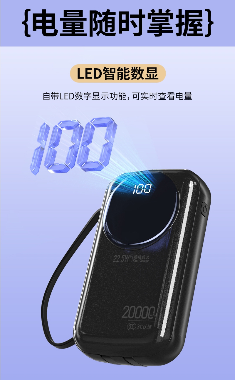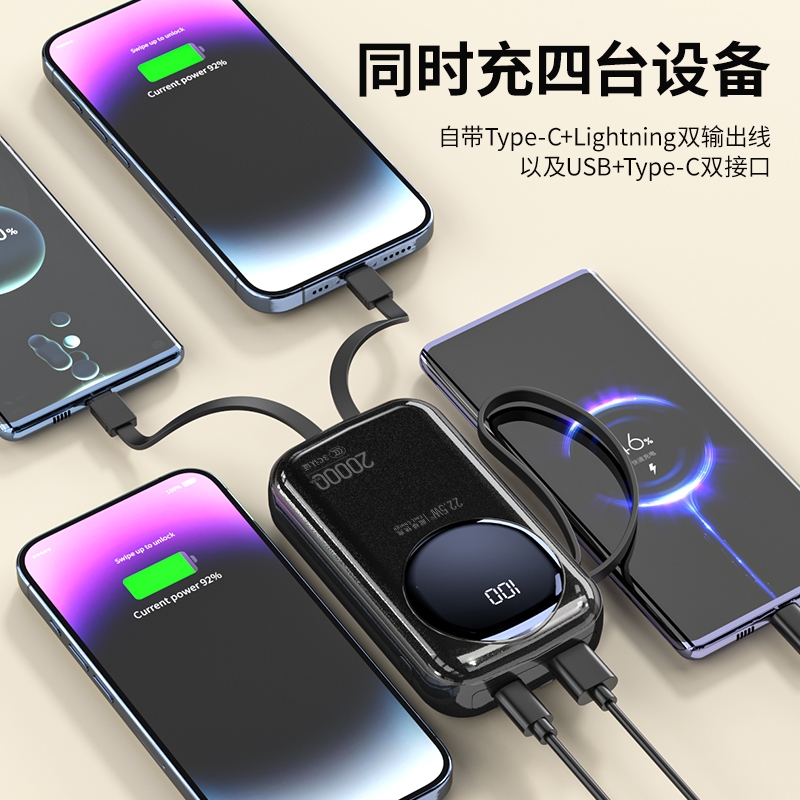 功能:多U口输出,双向快充,自带数据线,自带屏幕显示