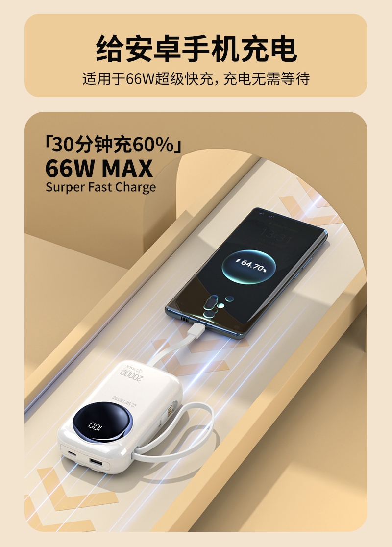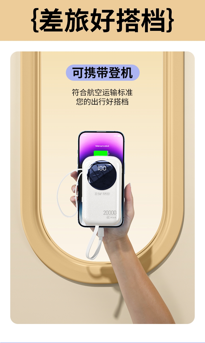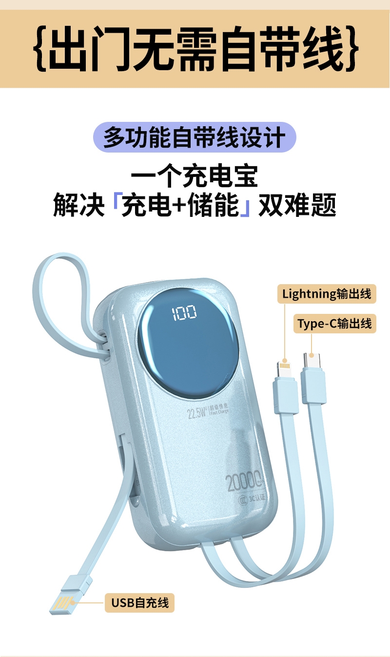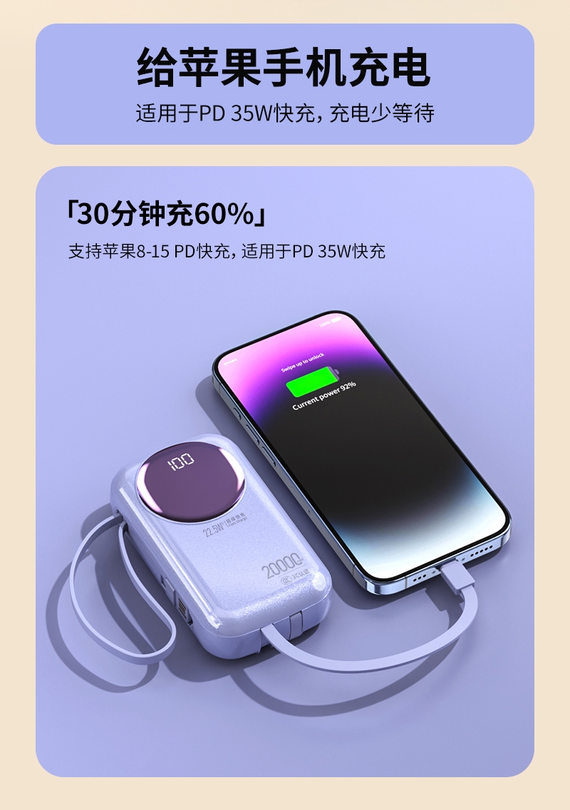 30分钟充60%支持苹果8-15 PD快充,;自带Type-C+Lightning双输出线;一线两用 方便携带,既是自充线也是手提绳;