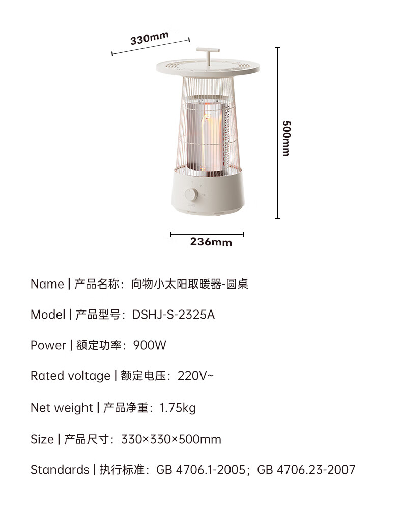 配置清单:向物-小太阳取暖器-圆桌/圆桌mini×1 说明书(保修卡)×1
