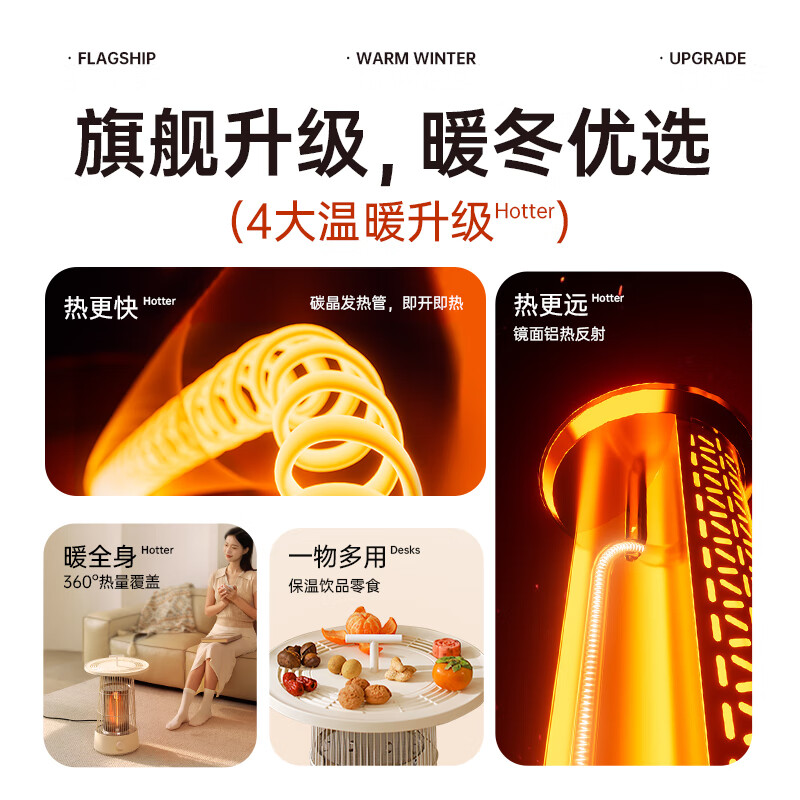 升级大桌板,加大受热网面面积,冬日围炉煮茶更惬意;倾倒断电,使用更安心,可拆卸便携提手,随处移动自由;HDPE碳素管发热,即开即热,热流瞬间包裹皮肤,寒