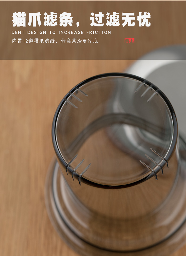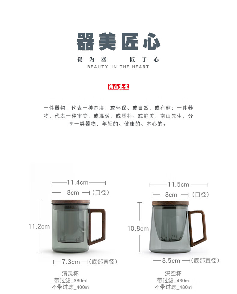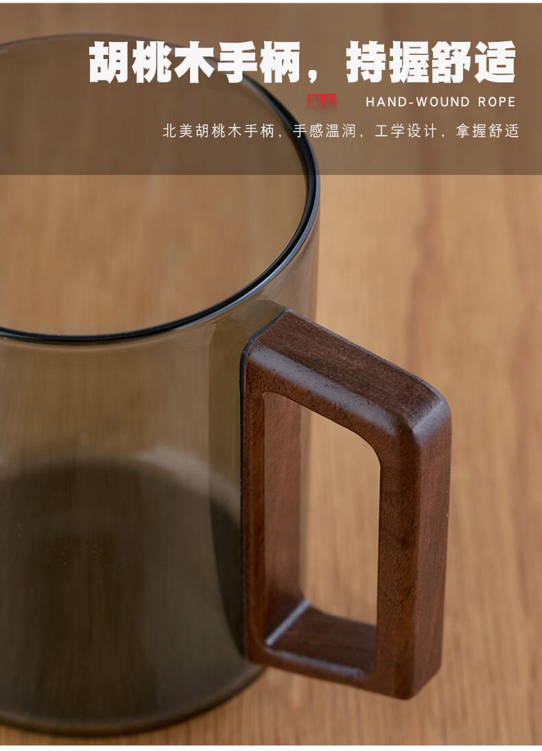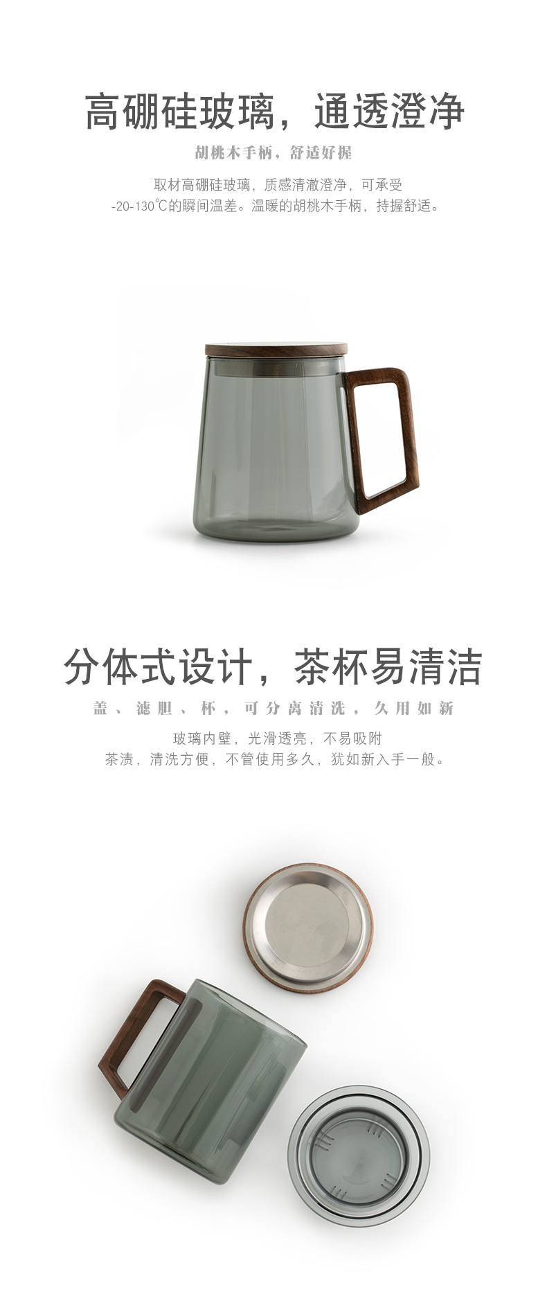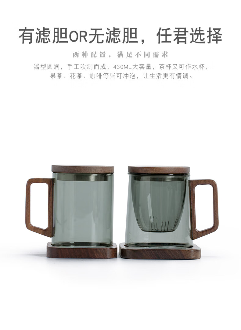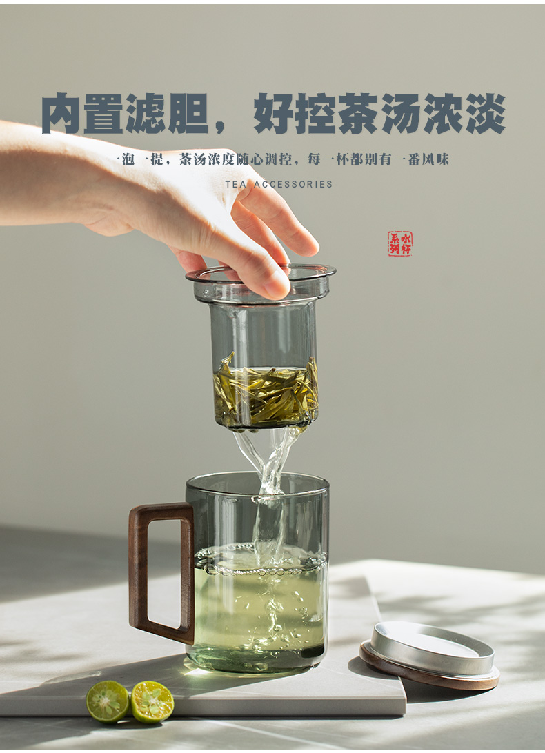 杯身雅致耐看,搭配胡桃木手柄;内置滤胆,好控茶汤浓淡;高硼硅玻璃,通透澄净