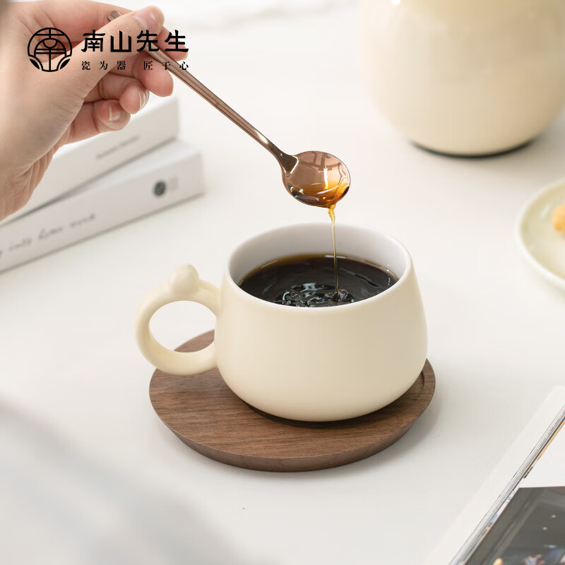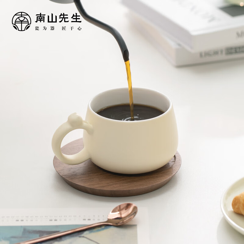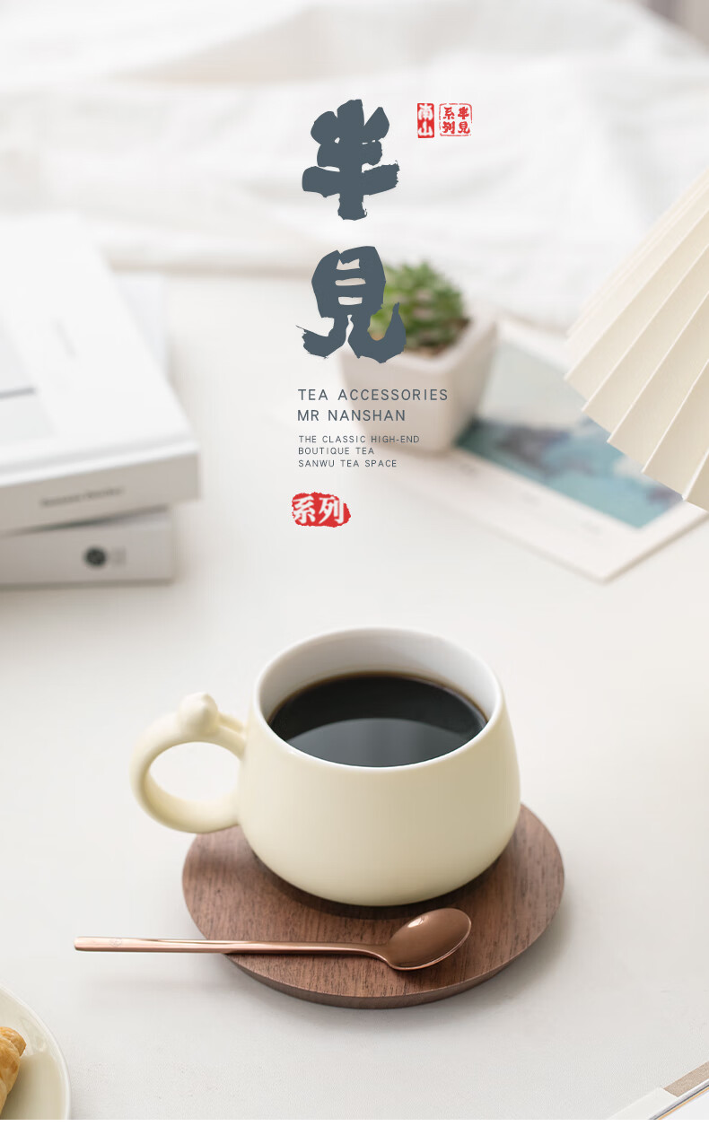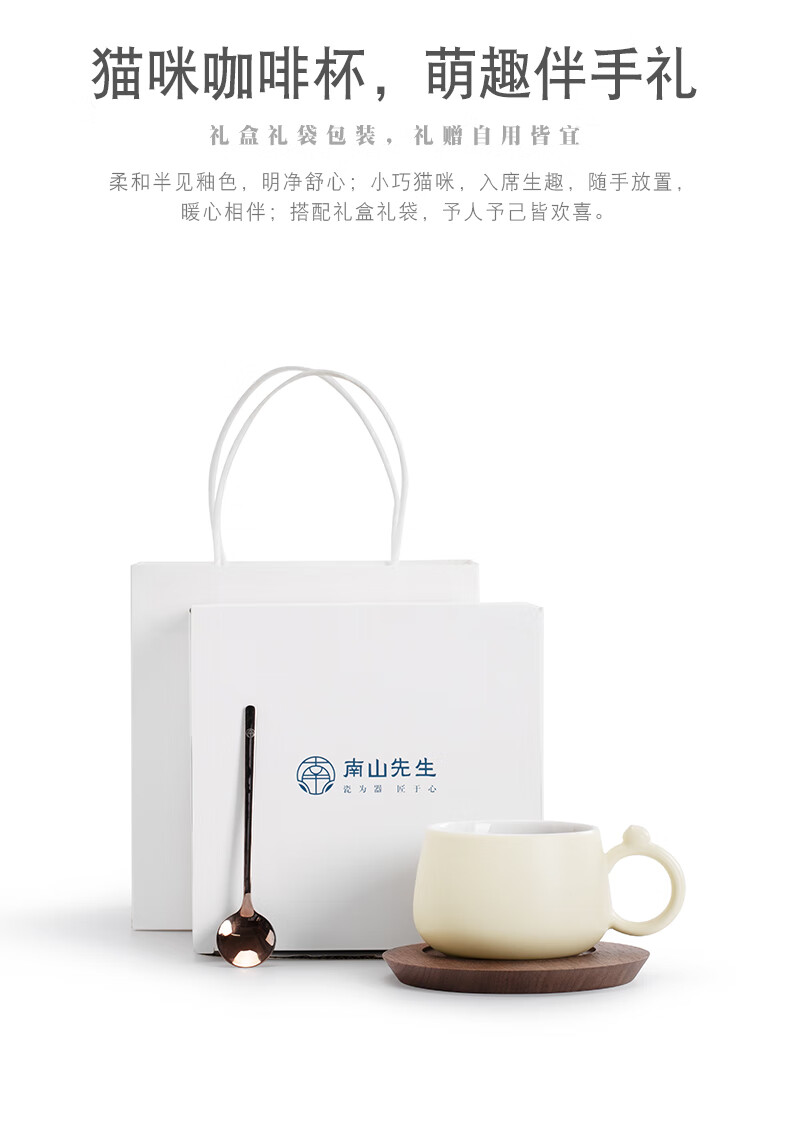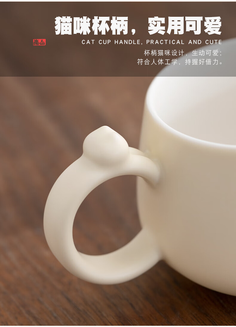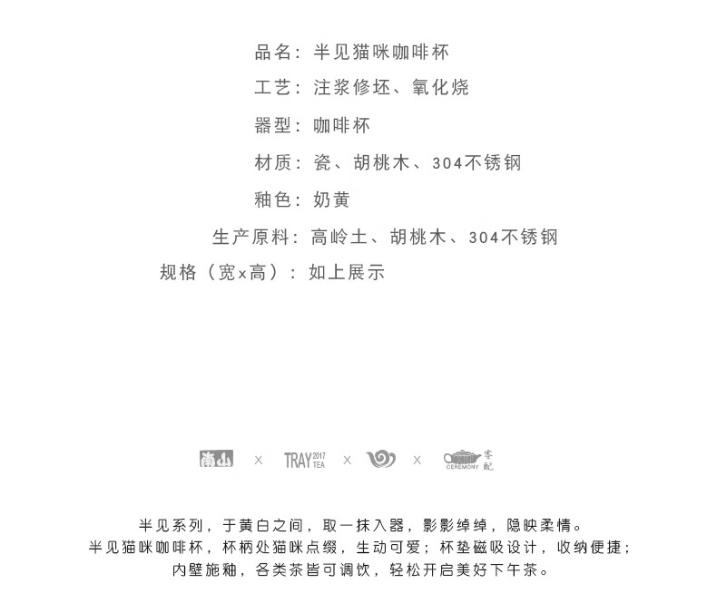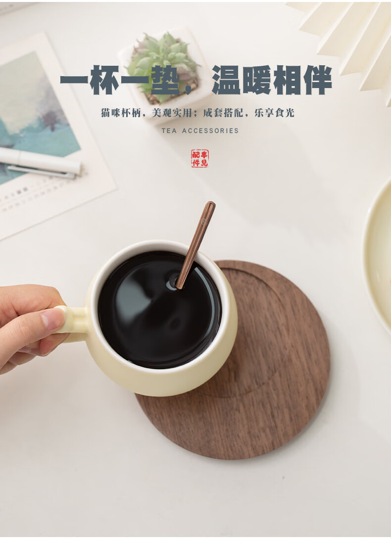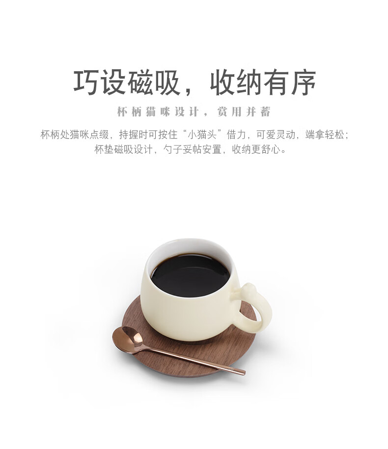 半见猫咪咖啡杯,杯柄处猫咪点缀,生动可爱;杯垫磁吸设计,收纳便捷;内壁施釉,各类茶皆可调饮,轻松开启美好下午茶