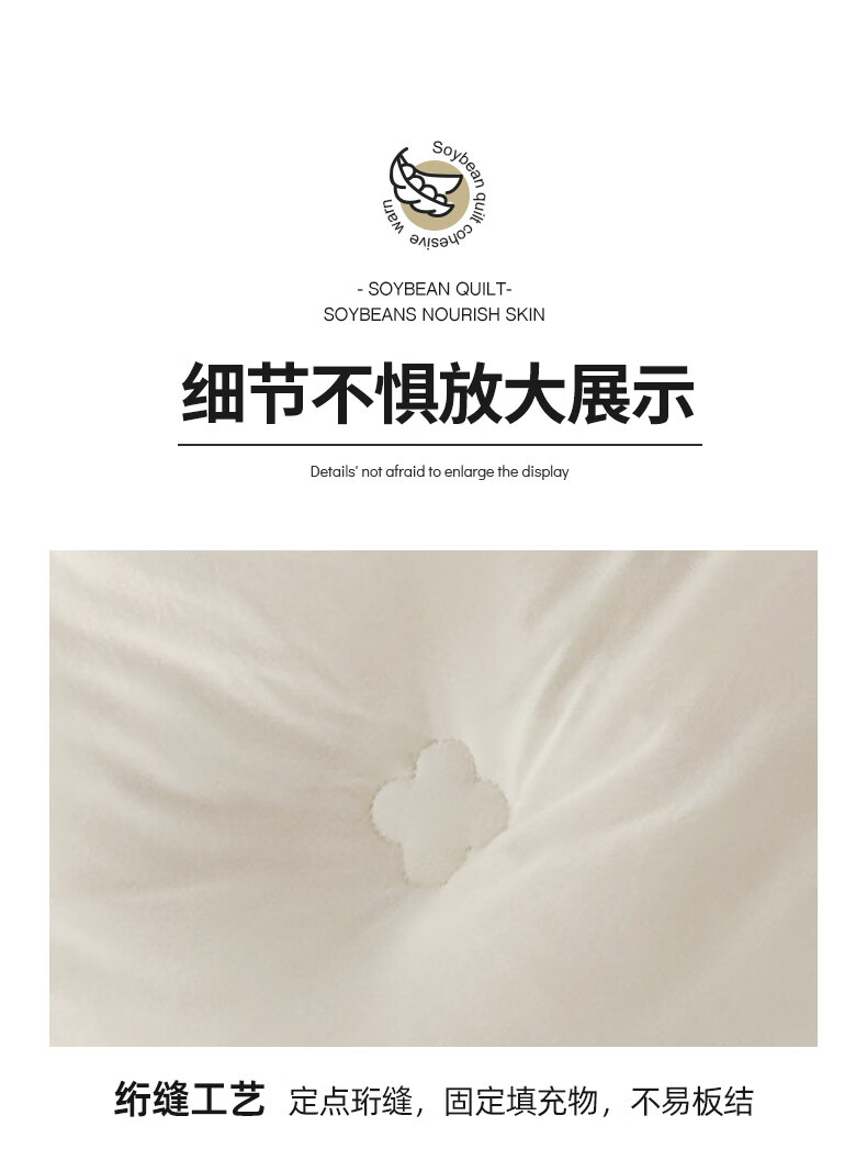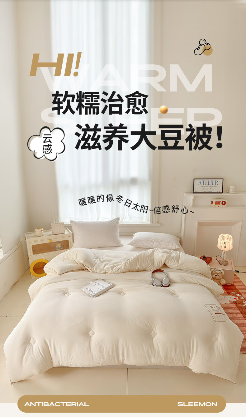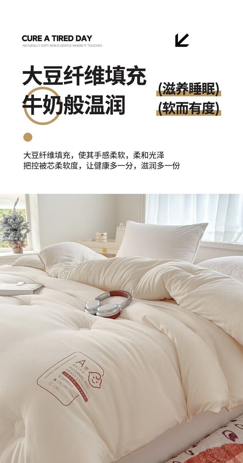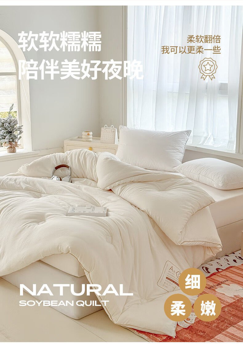 软糯治愈滋养大豆被,暖暖的像冬日太阳;纤维整张填充,牛奶般温润,透气不闷热;高克重面料,不易起球,亲肤柔软