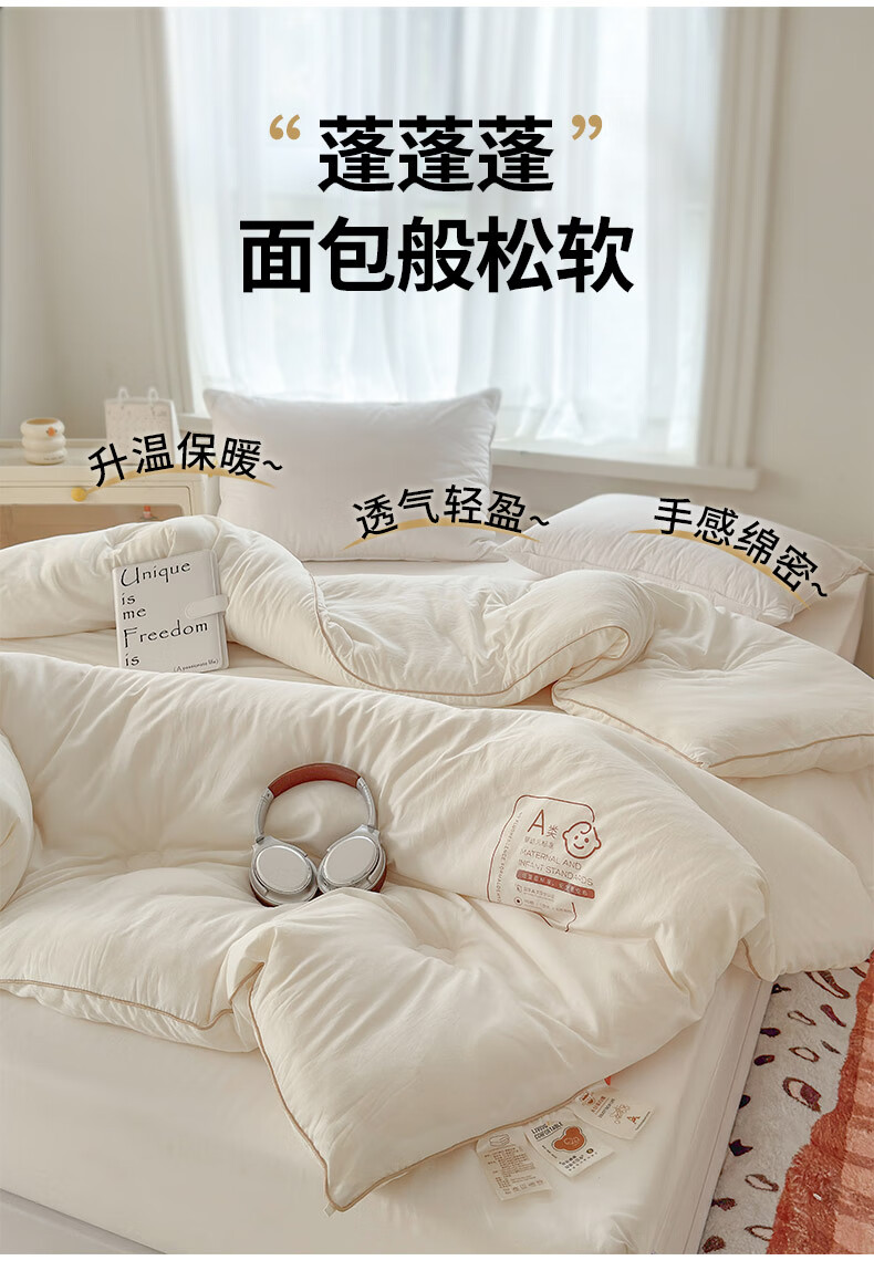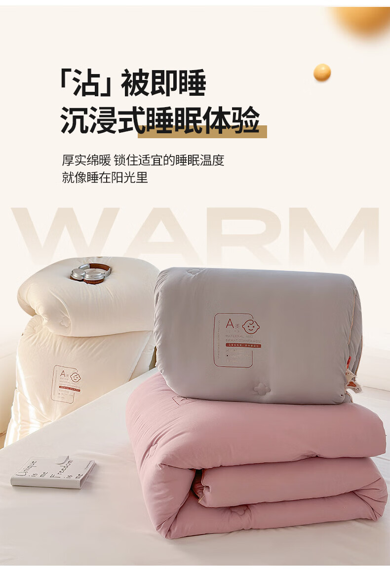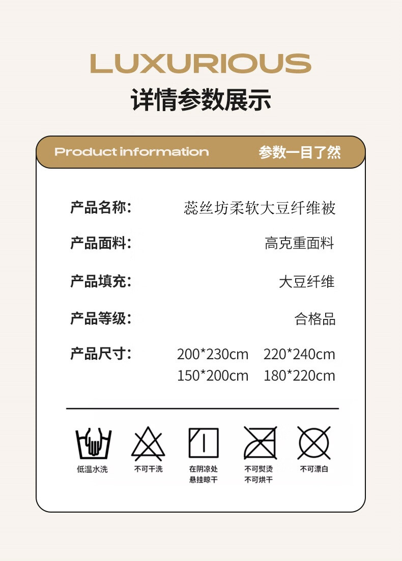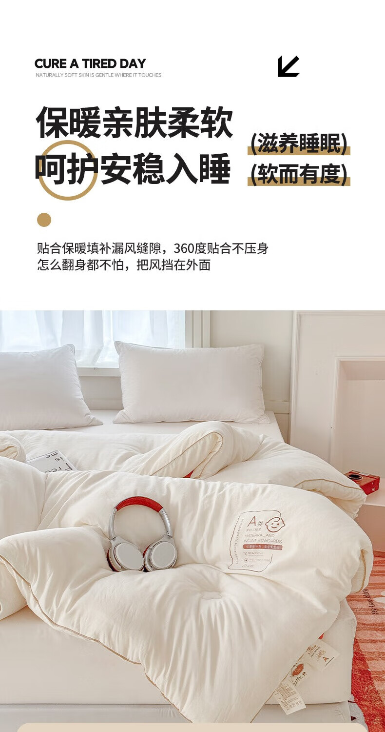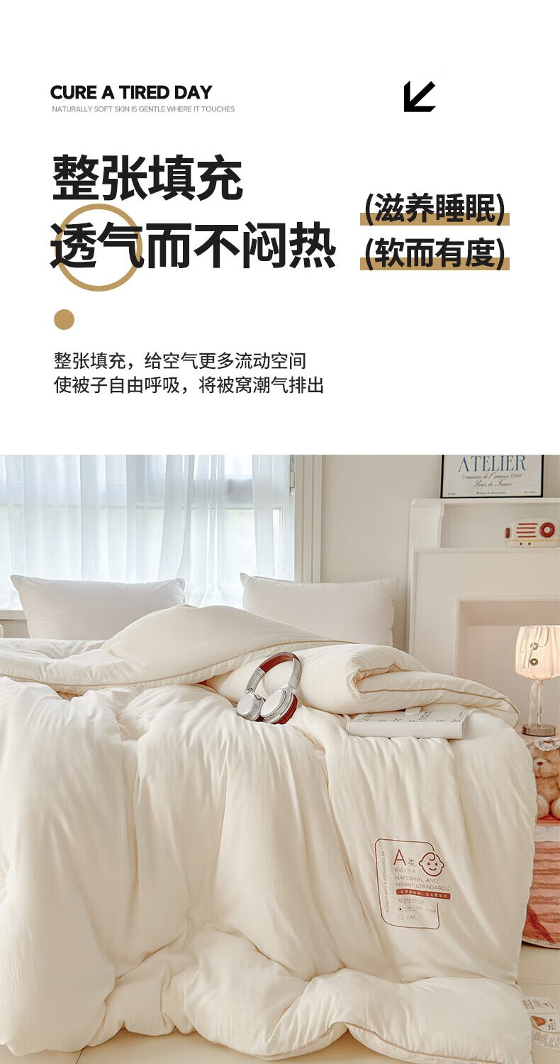 软糯治愈滋养大豆被,暖暖的像冬日太阳;纤维整张填充,牛奶般温润,透气不闷热;高克重面料,不易起球,亲肤柔软
