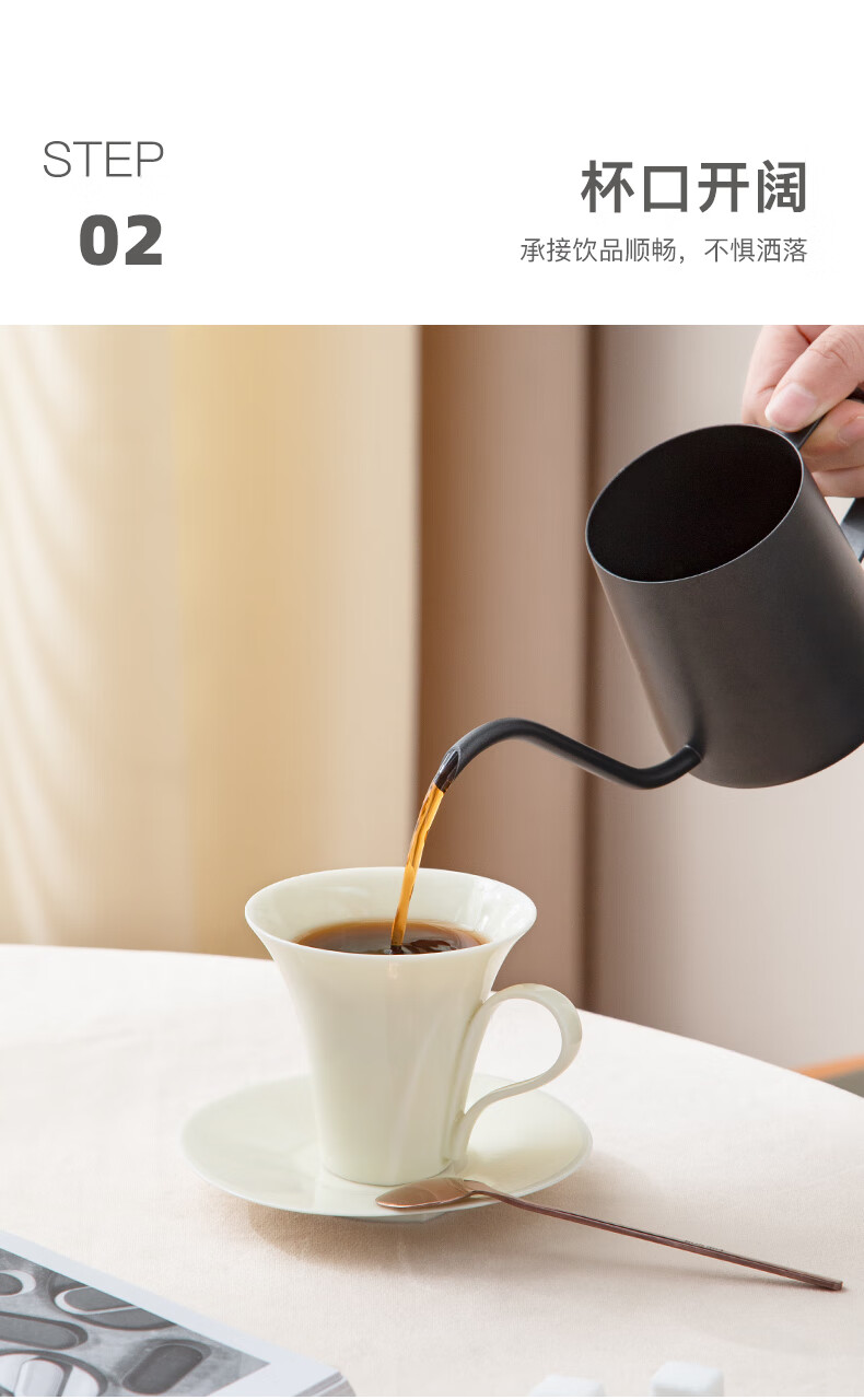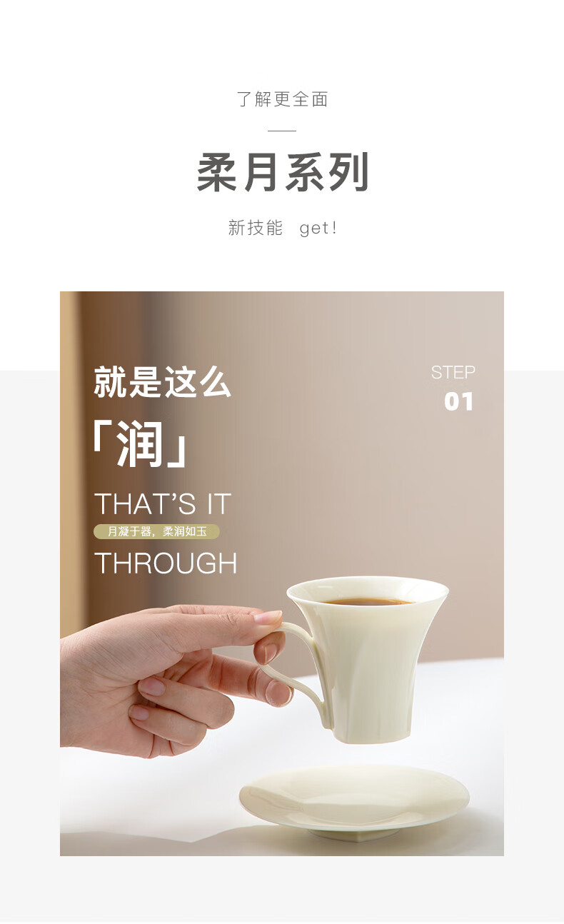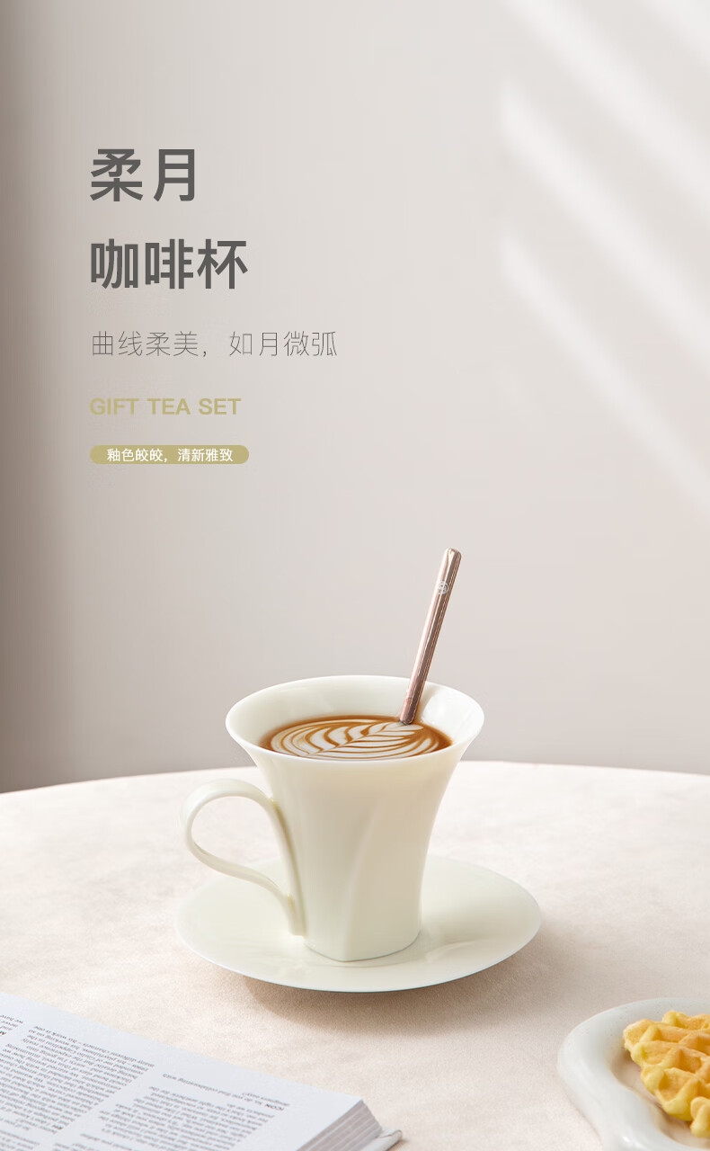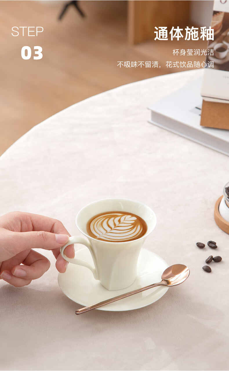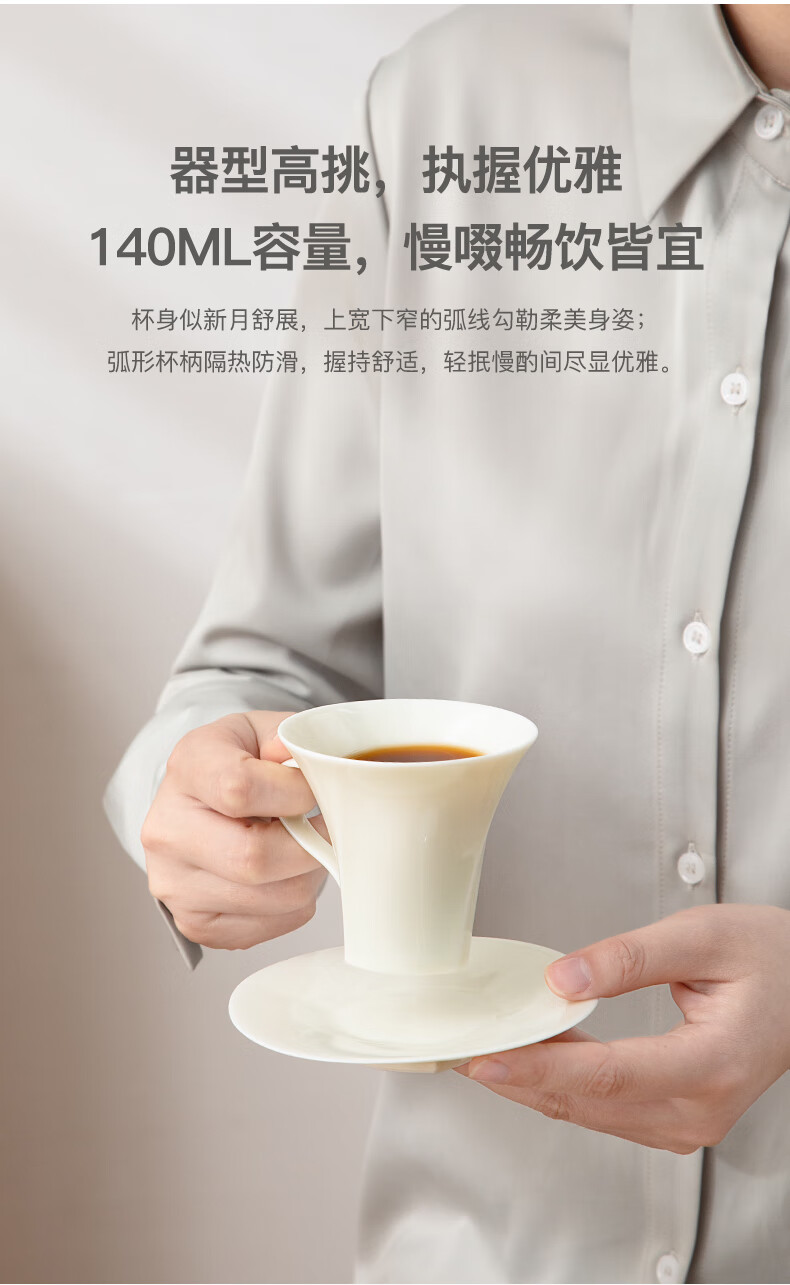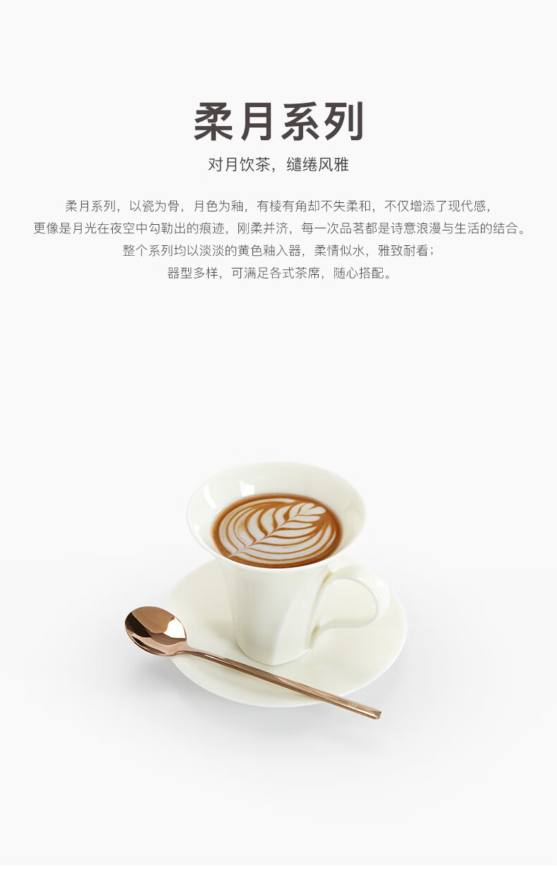 曲线柔美,如月微弧;杯口开阔 承接饮品顺畅,不惧洒落;杯身莹润光洁不吸味不留渍,花式饮品随心调