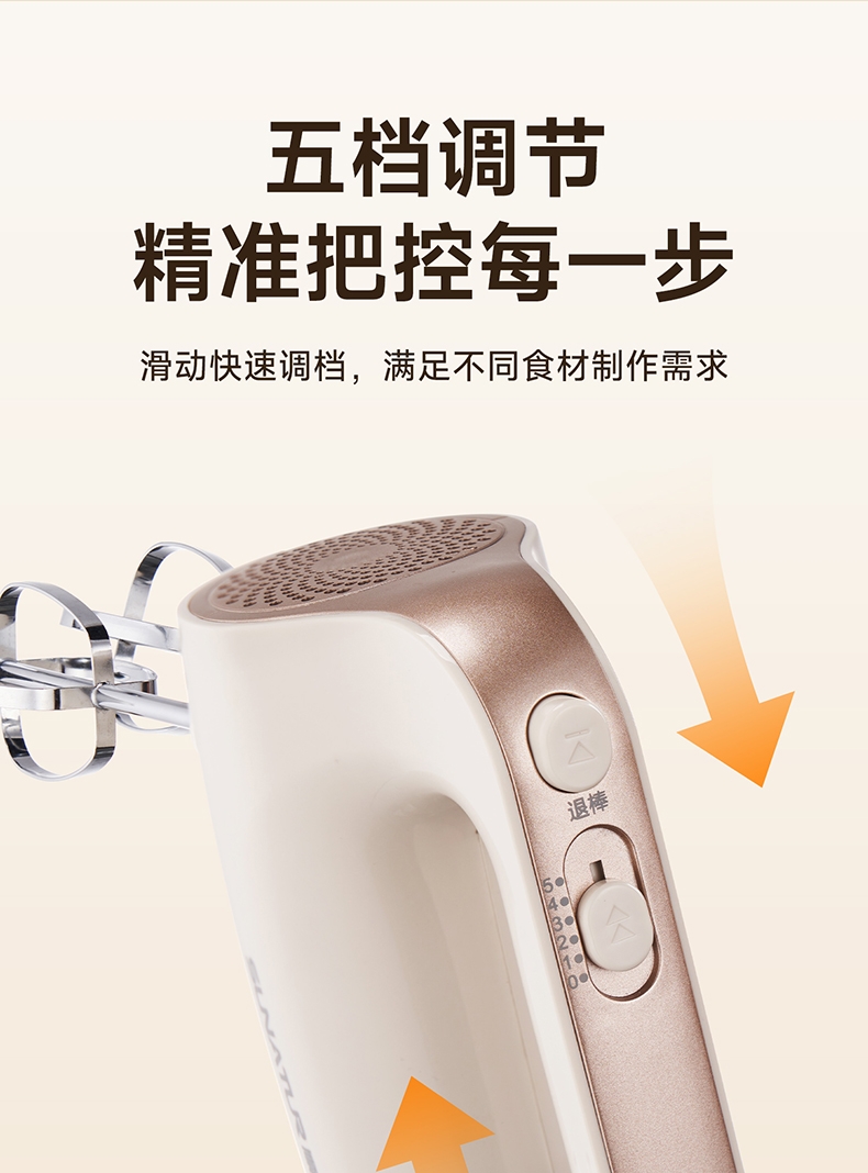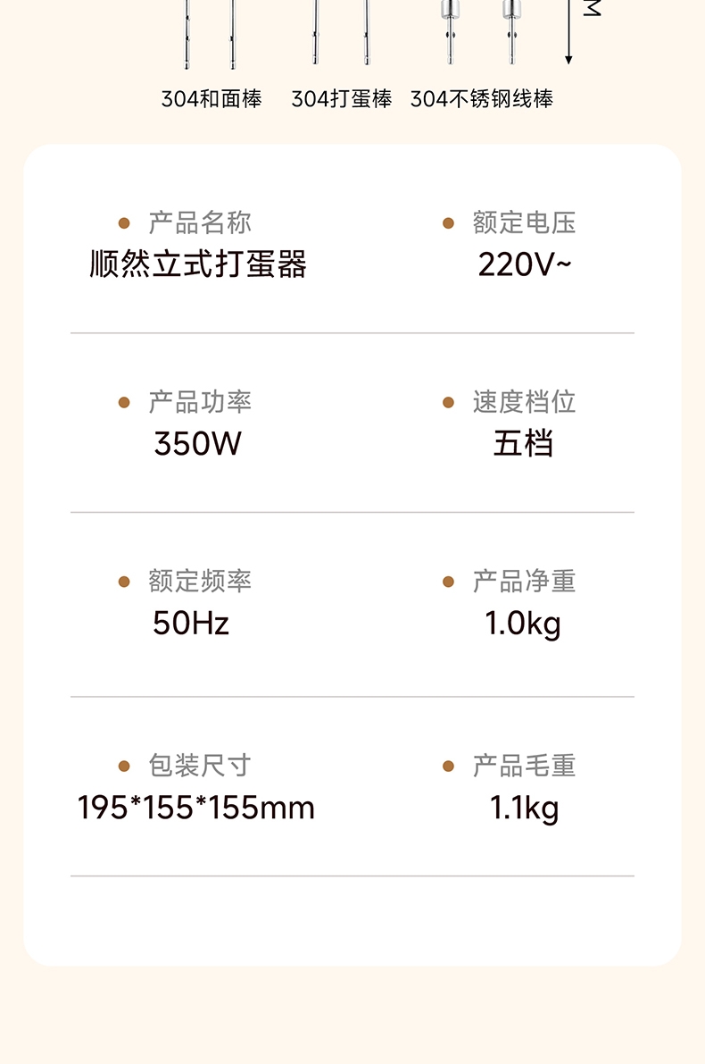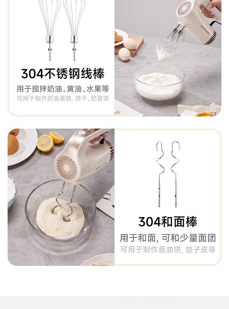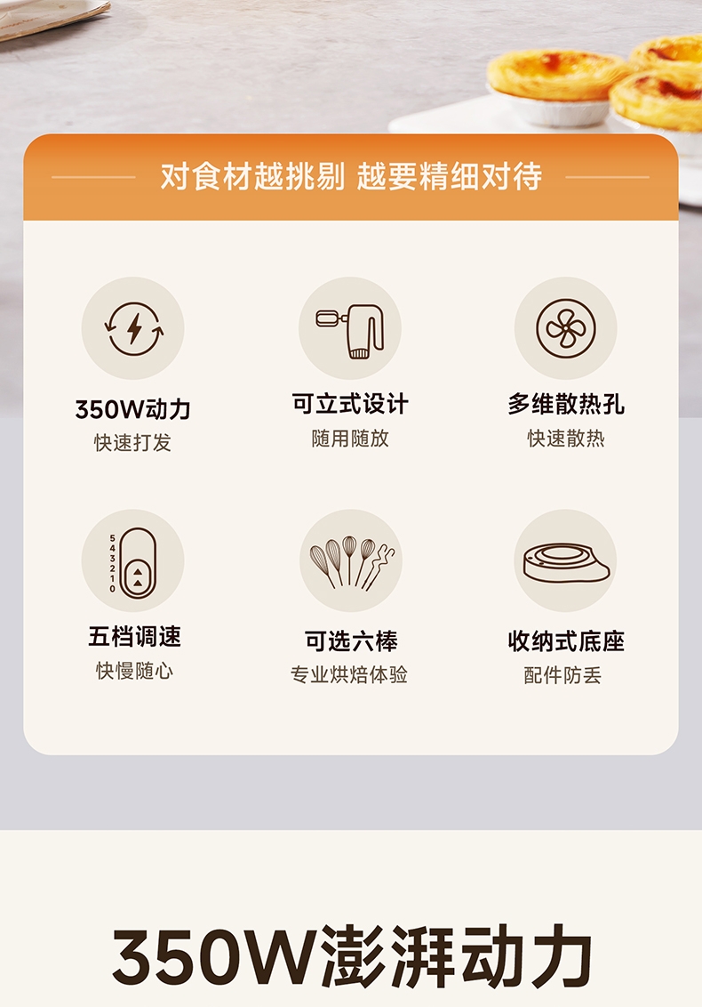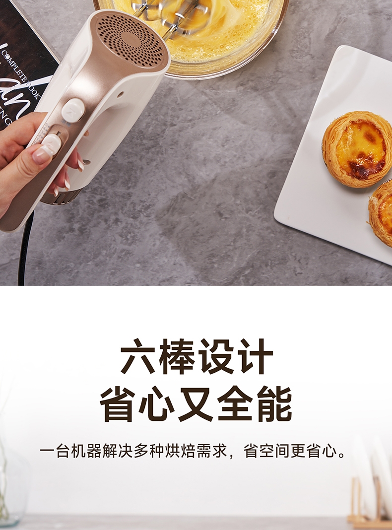 升级6棒304不锈钢材质 350w大功率纯铜电机,;5档自由调速。6棒选择,满足不同打发需求;一键快速退棒,操作方便 不脏手 透明收纳盒好收纳
