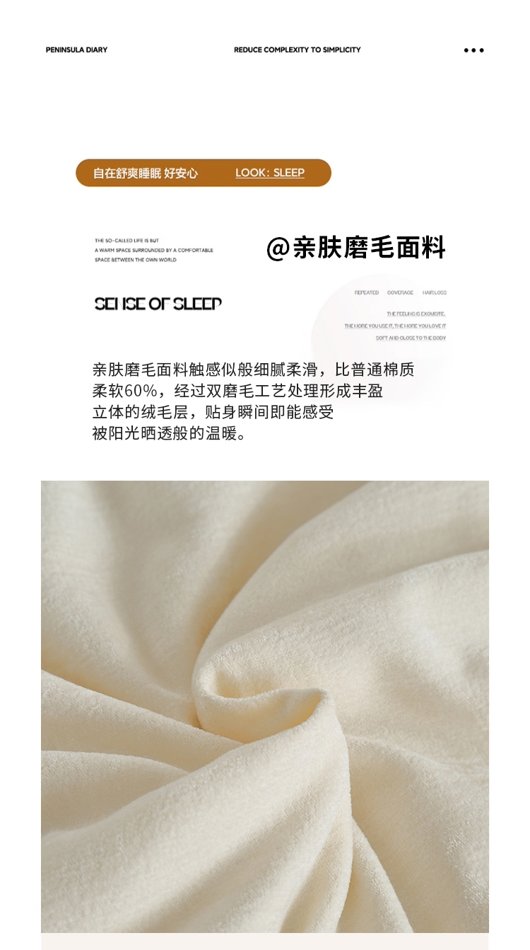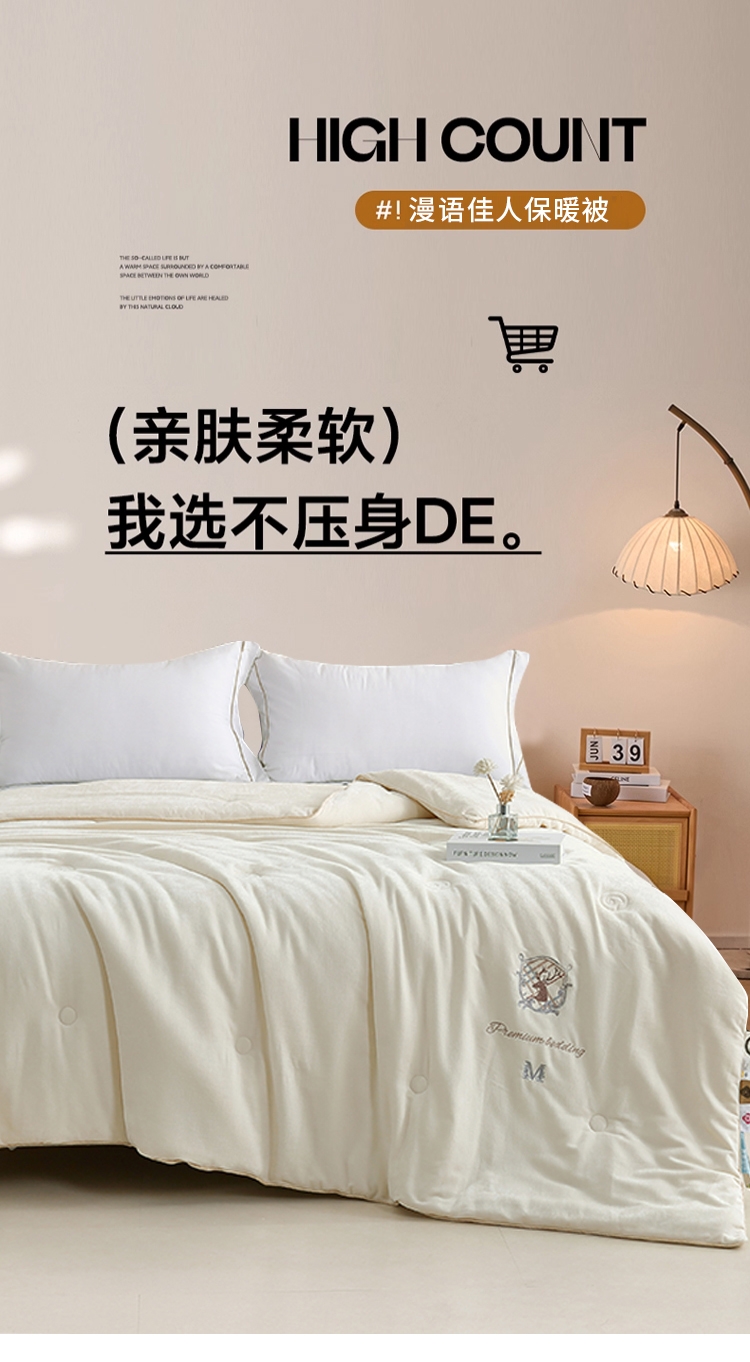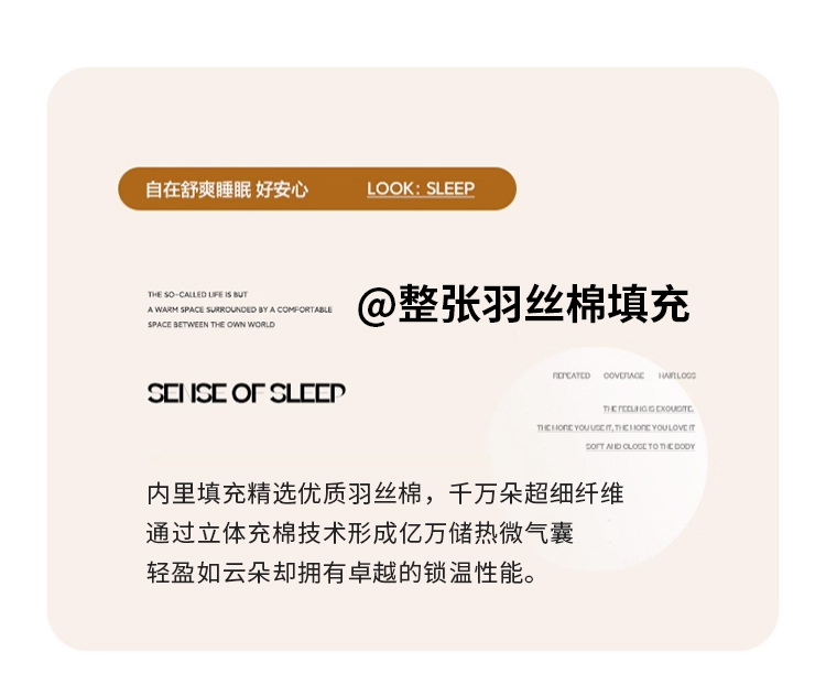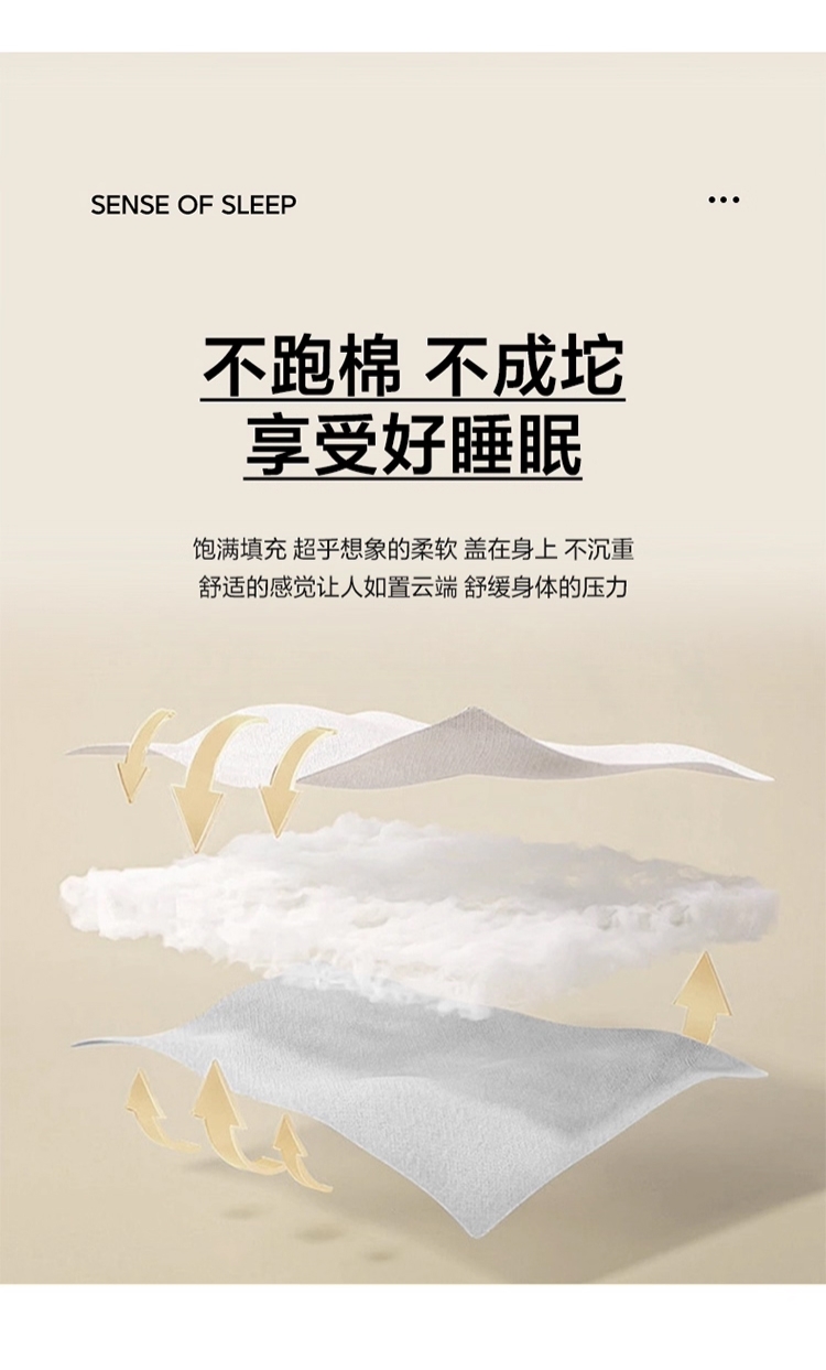 羊绒棉汲取羊绒与长绒棉的双重优势;形成丰盈立体的绒毛层,贴身瞬间即能感受被阳光晒透;内里填充精选优质羽丝棉