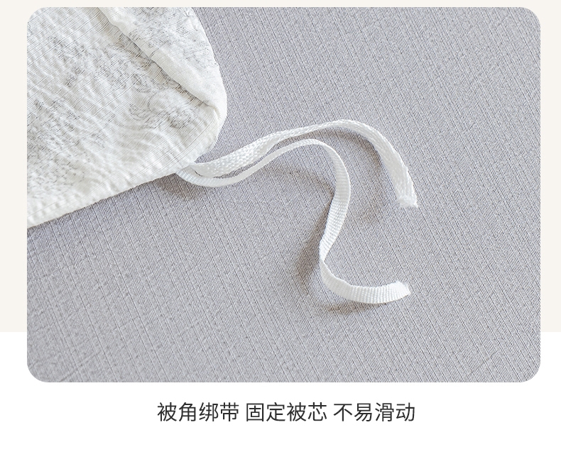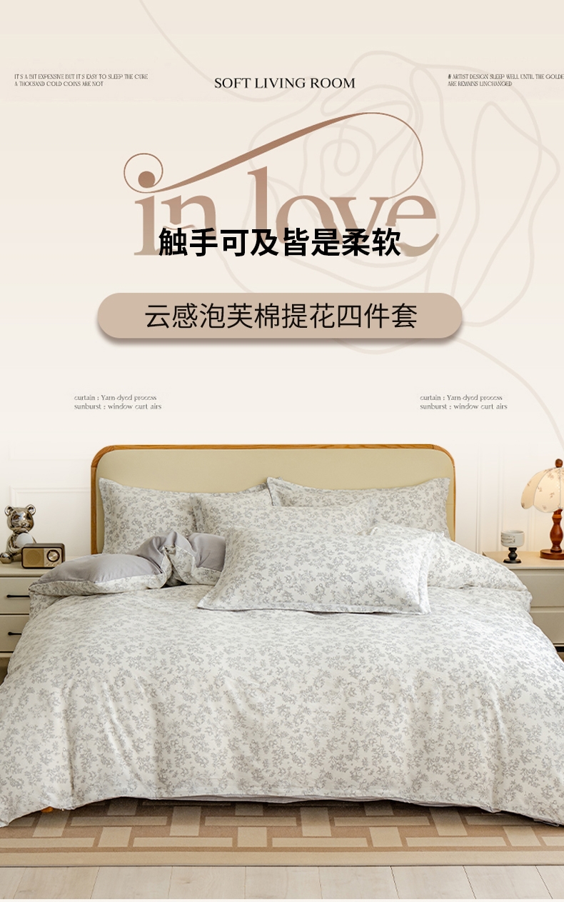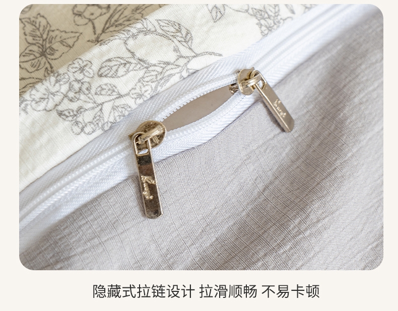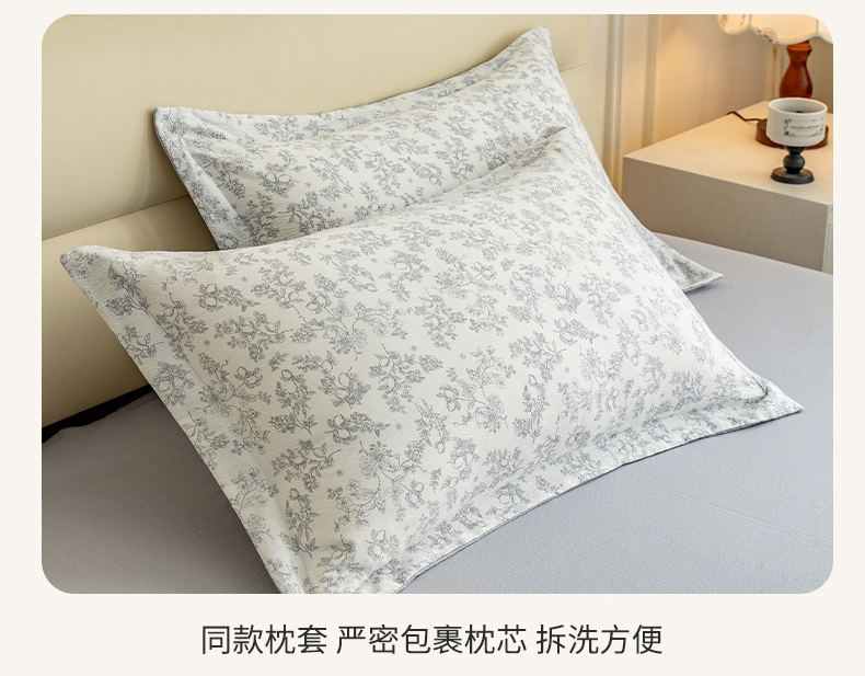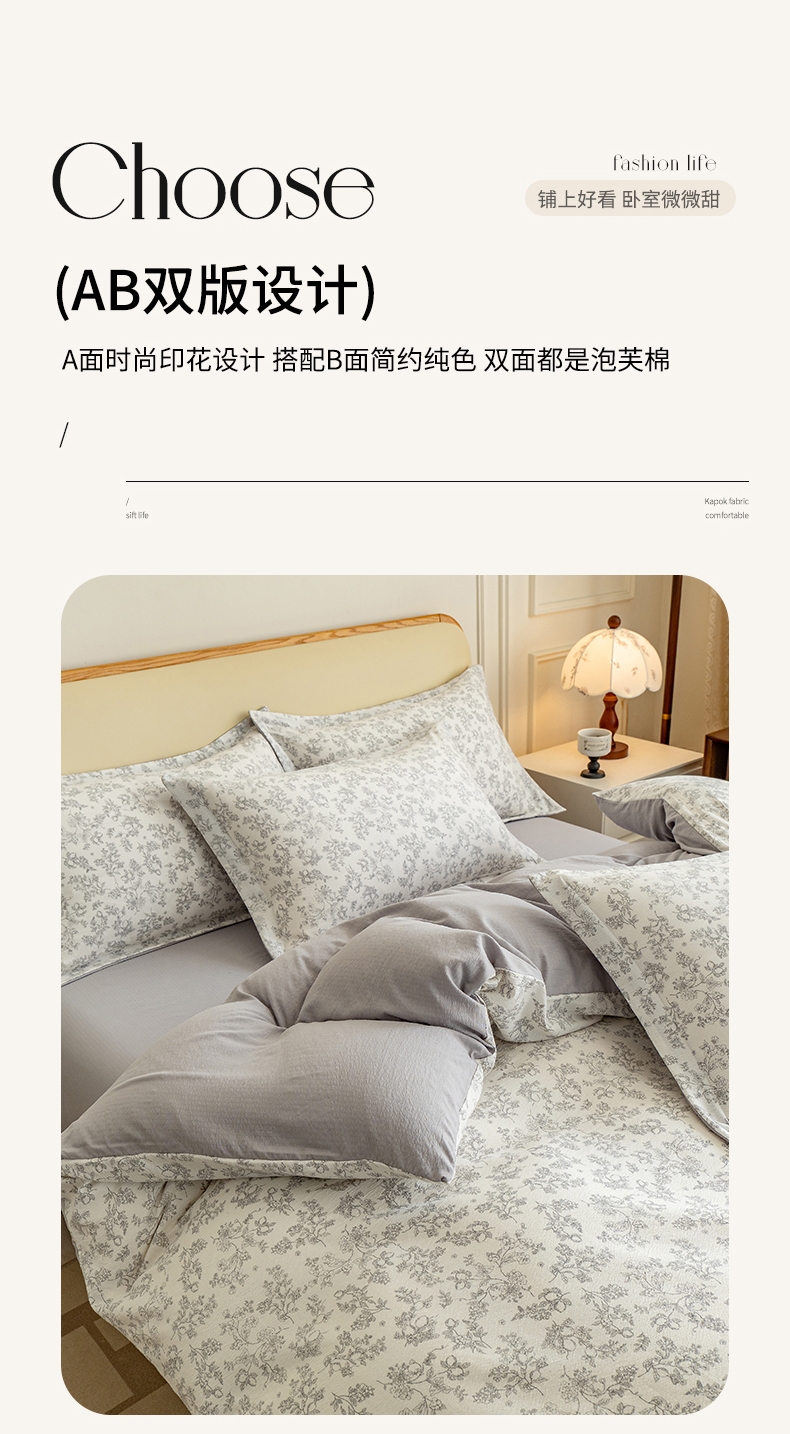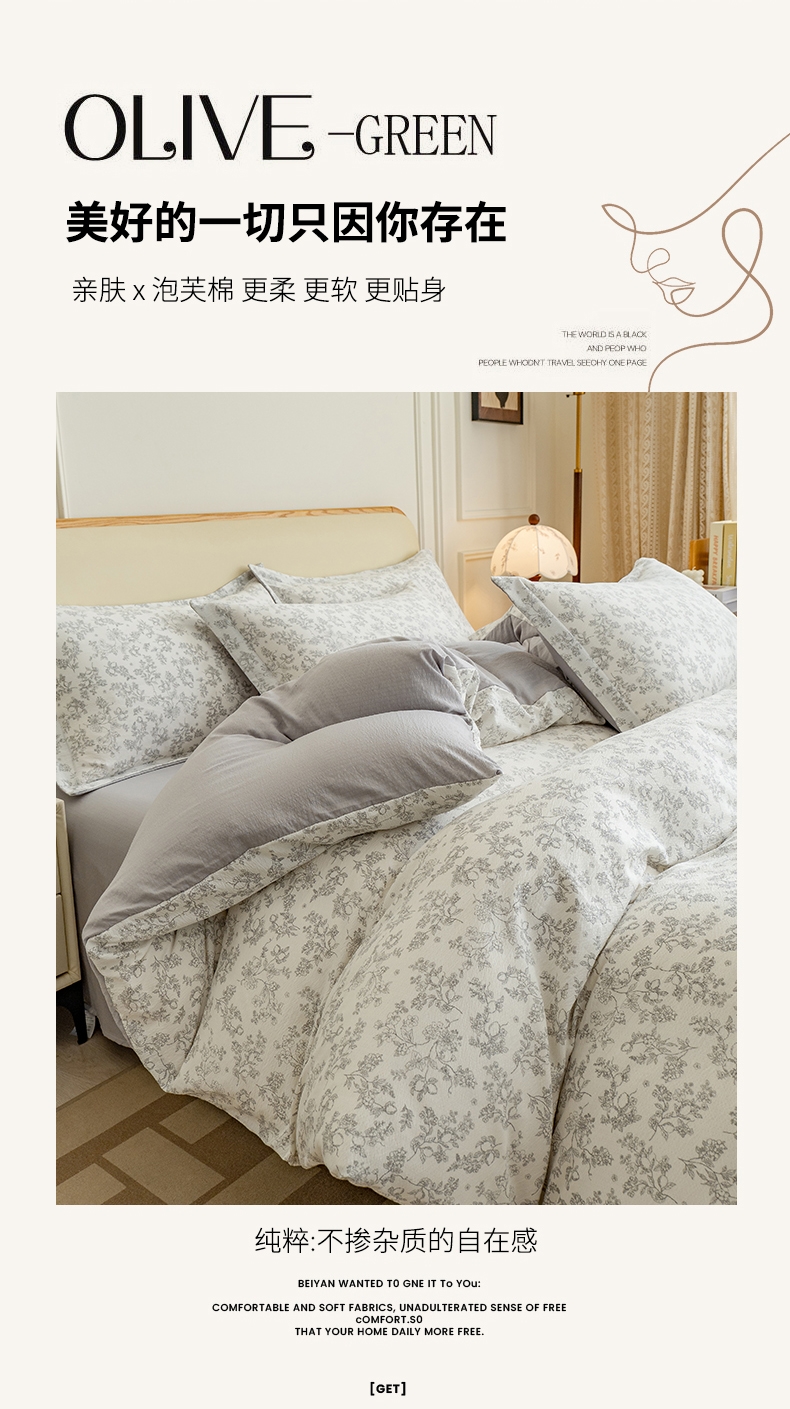 臻选泡芙棉面料,空气层针织工艺,手感平滑细腻,富有;暗合被套,圆角床单,宽边枕套,四周被角带;AB版设计,美观大方简约不简单;健康环保印染 ,可机洗水洗,不起球不掉色