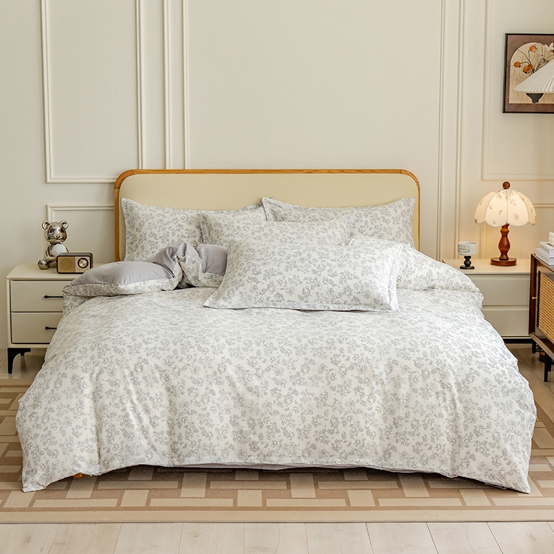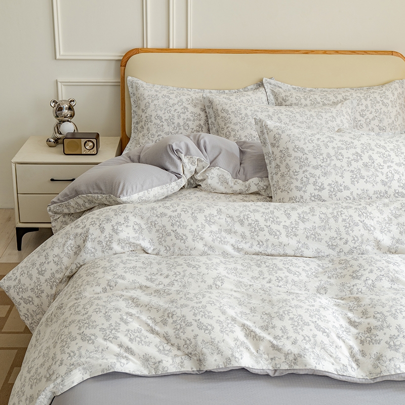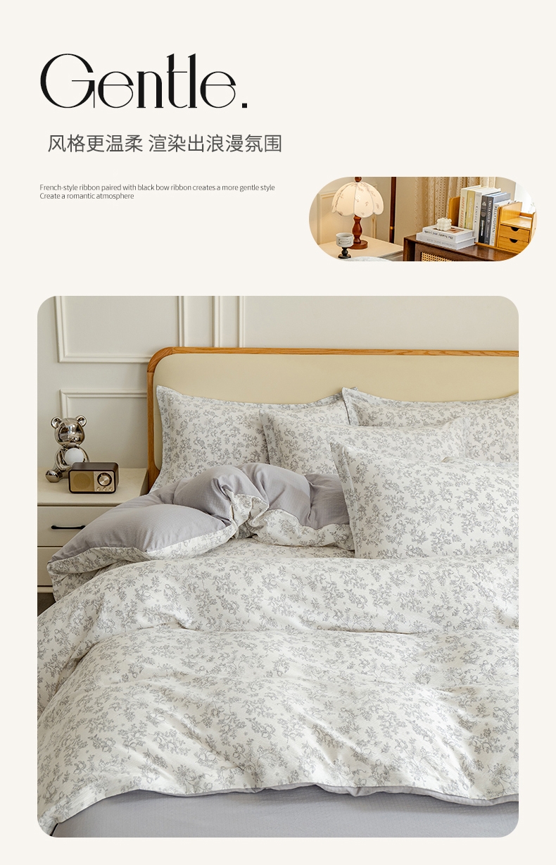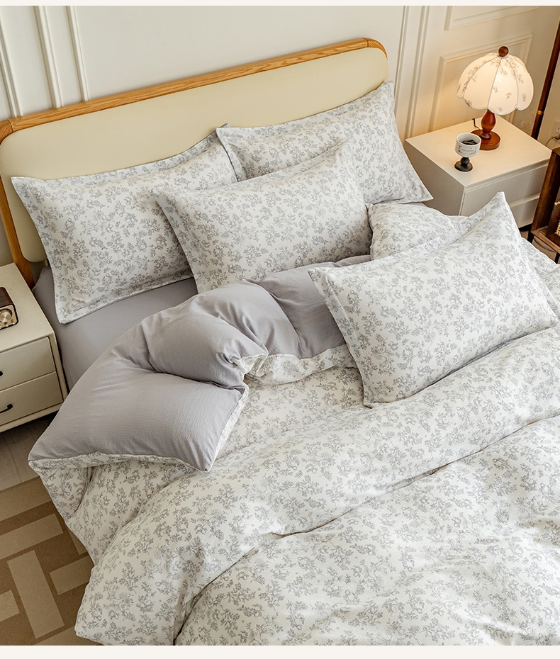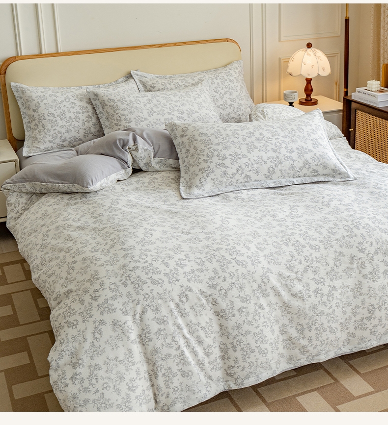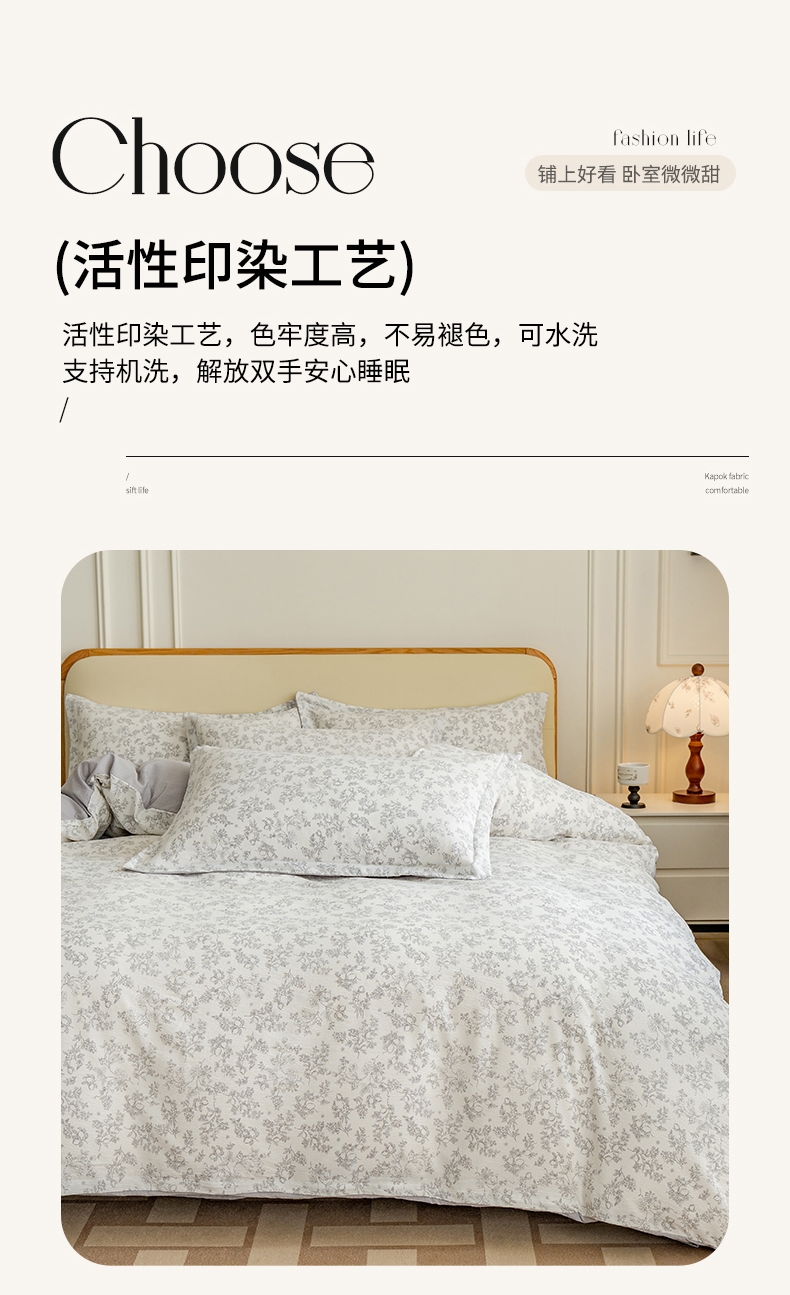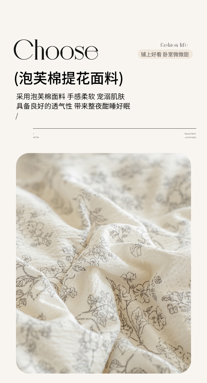 臻选泡芙棉面料,空气层针织工艺,手感平滑细腻,富有;暗合被套,圆角床单,宽边枕套,四周被角带;AB版设计,美观大方简约不简单;健康环保印染 ,可机洗水洗,不起球不掉色