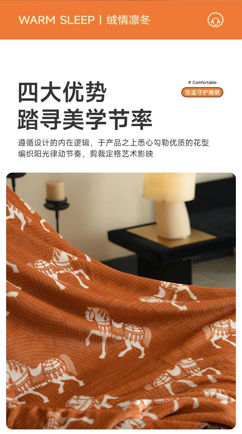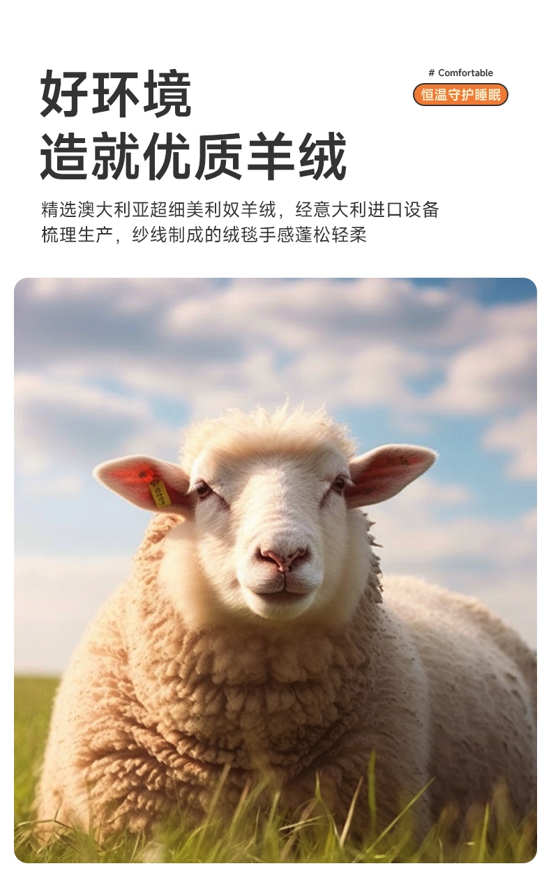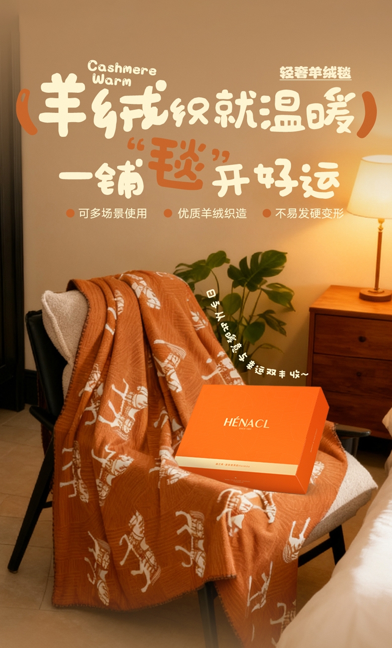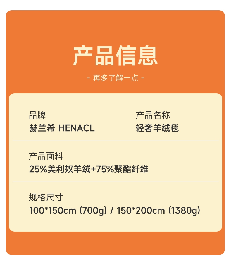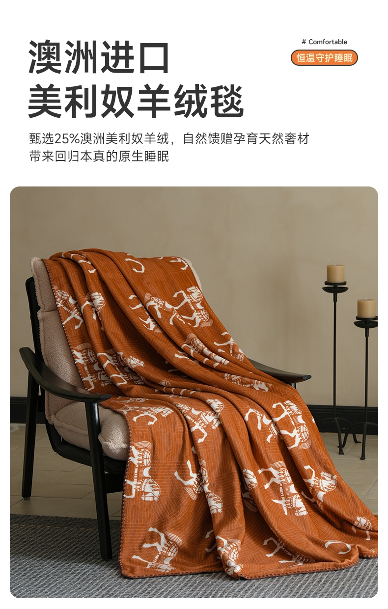 澳洲美利奴羊绒,材质柔软亲肤不起球;双层毯复合,保暖不臃肿,随时随地尽显优雅;简约轻奢花型,三角针锁边,凸显匠心工艺