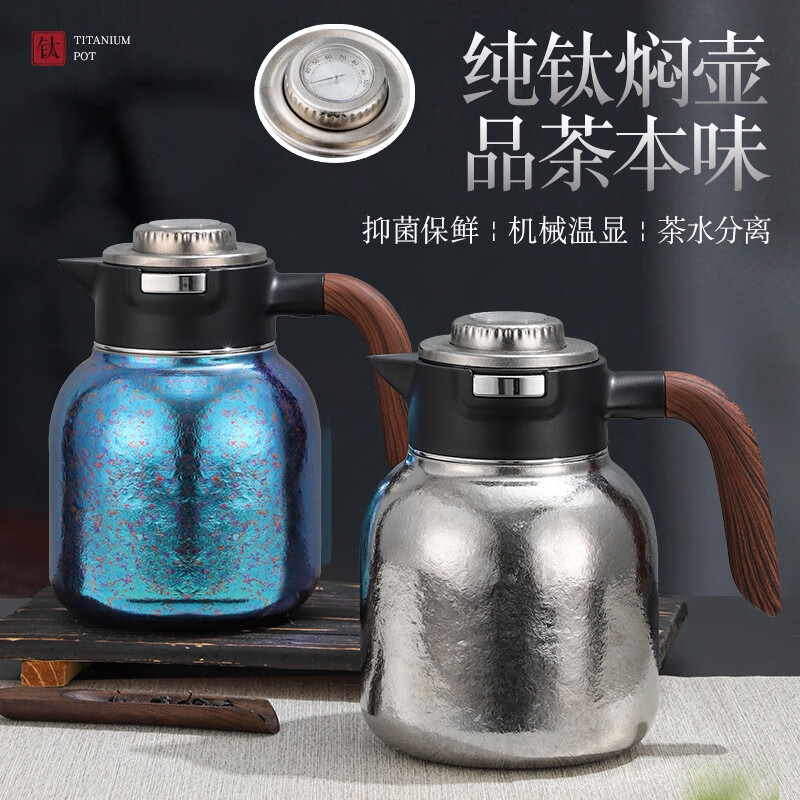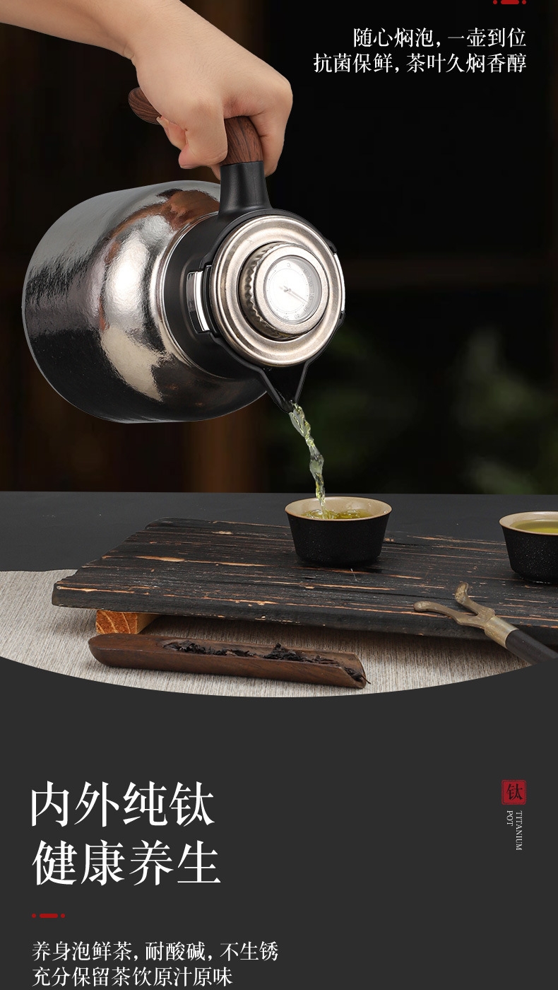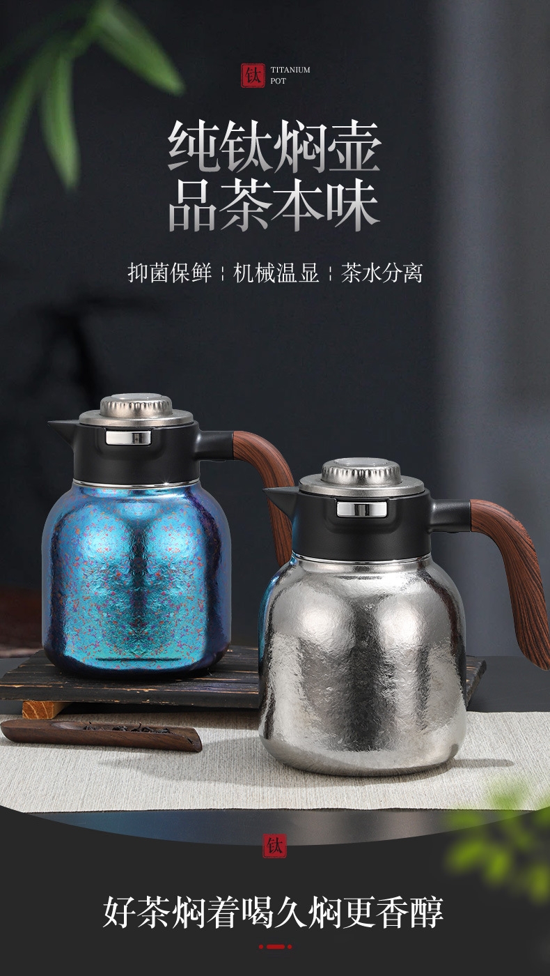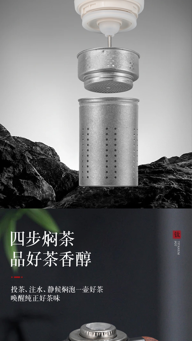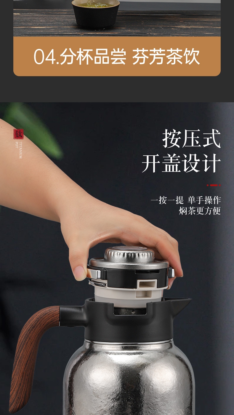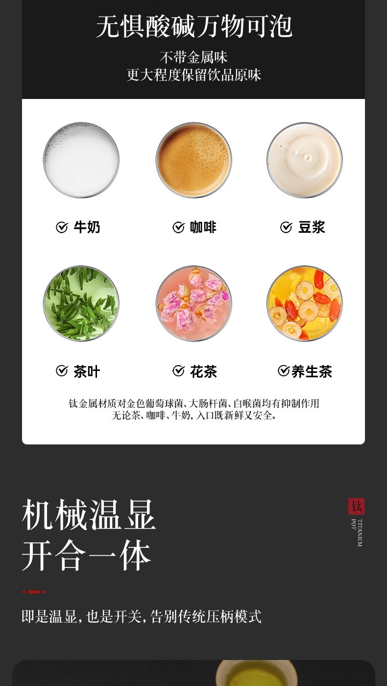 纯钛焖壶品茶本味 抑菌保鲜:机械温显:茶水分离;随心焖泡,一壶到位抗菌保鲜,茶叶久焖香醇;养身泡鲜茶,耐酸碱,不生锈充分保留茶饮原汁原味;机械温显开合一体,即是温显,也是开关,告别传统压柄;茶水分离,饮茶不吐渣,大容量加长滤网与水接触更充分