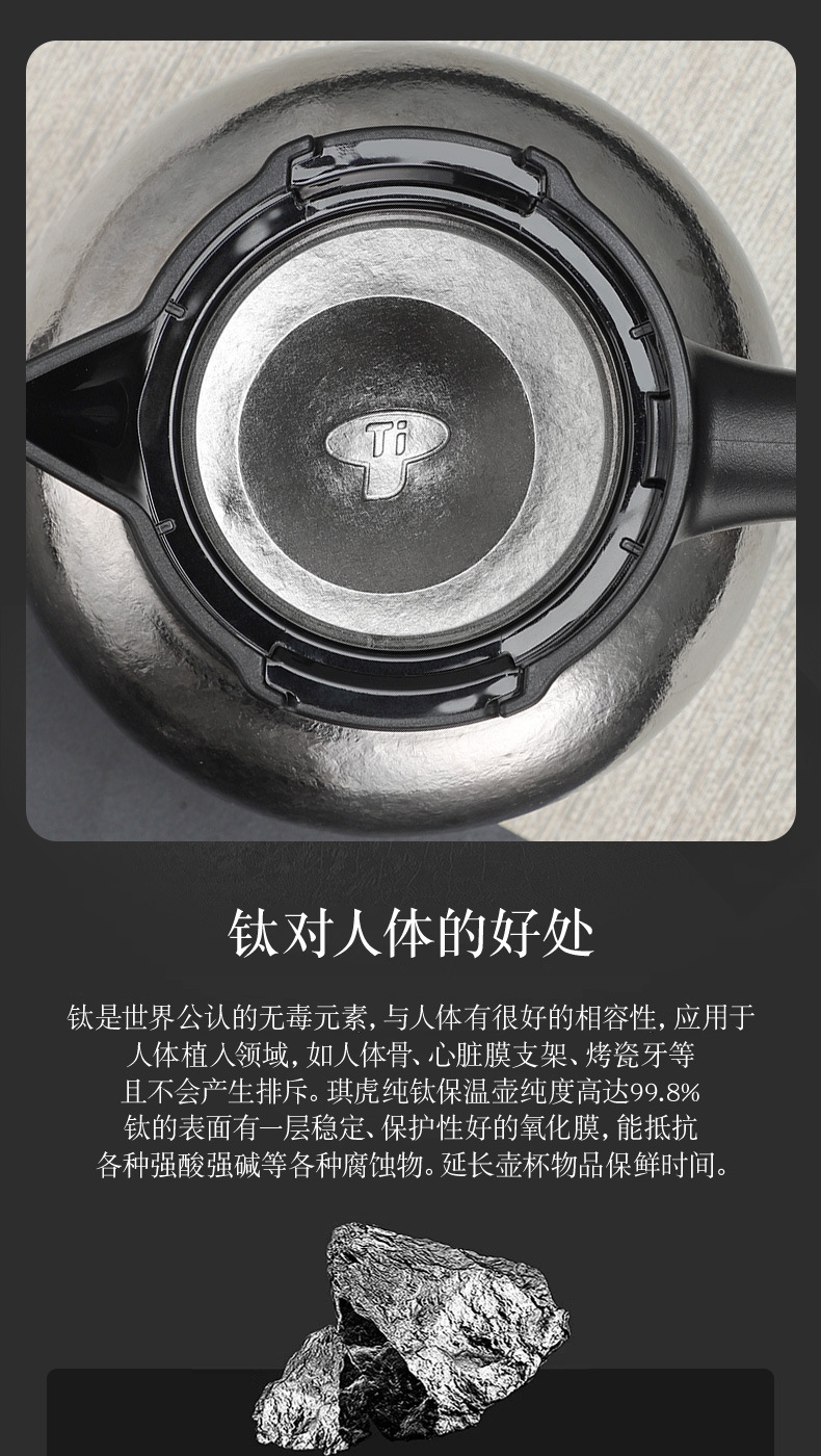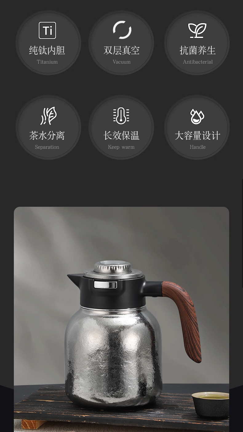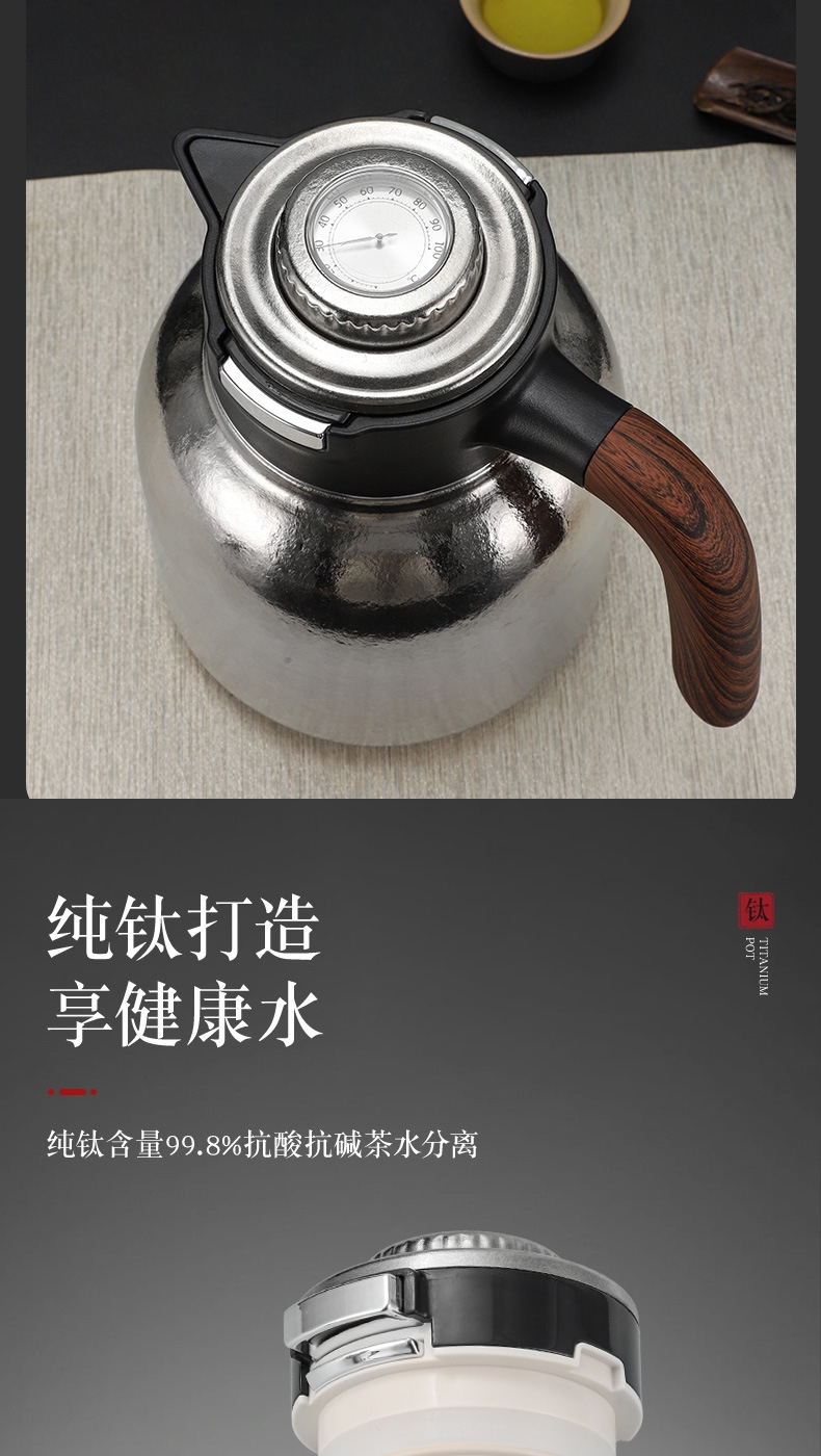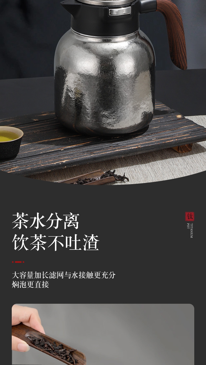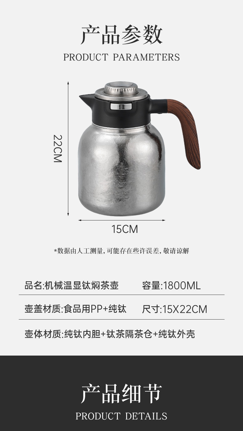 纯钛焖壶品茶本味 抑菌保鲜:机械温显:茶水分离;随心焖泡,一壶到位抗菌保鲜,茶叶久焖香醇;养身泡鲜茶,耐酸碱,不生锈充分保留茶饮原汁原味;机械温显开合一体,即是温显,也是开关,告别传统压柄;茶水分离,饮茶不吐渣,大容量加长滤网与水接触更充分
