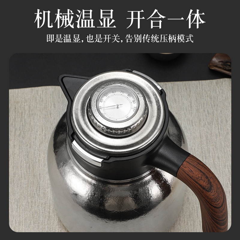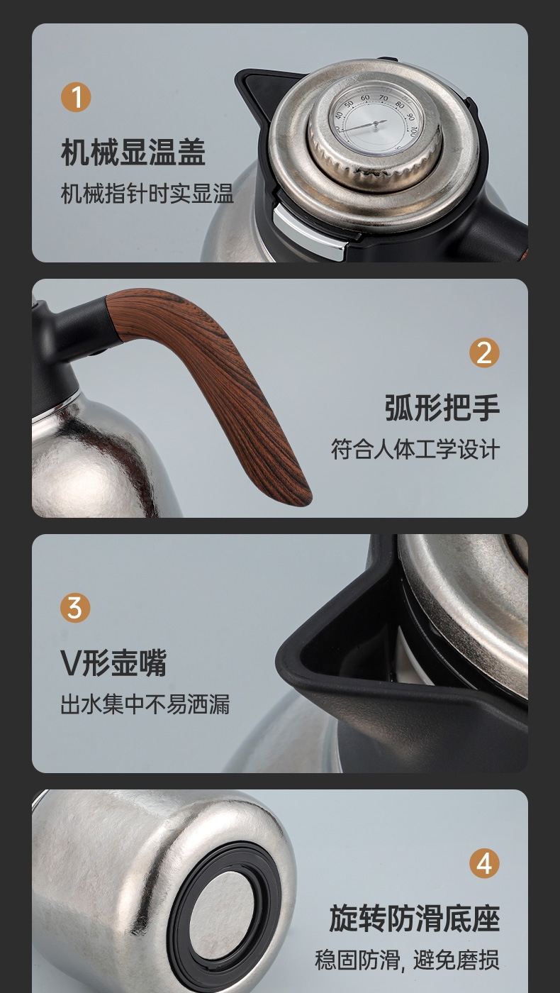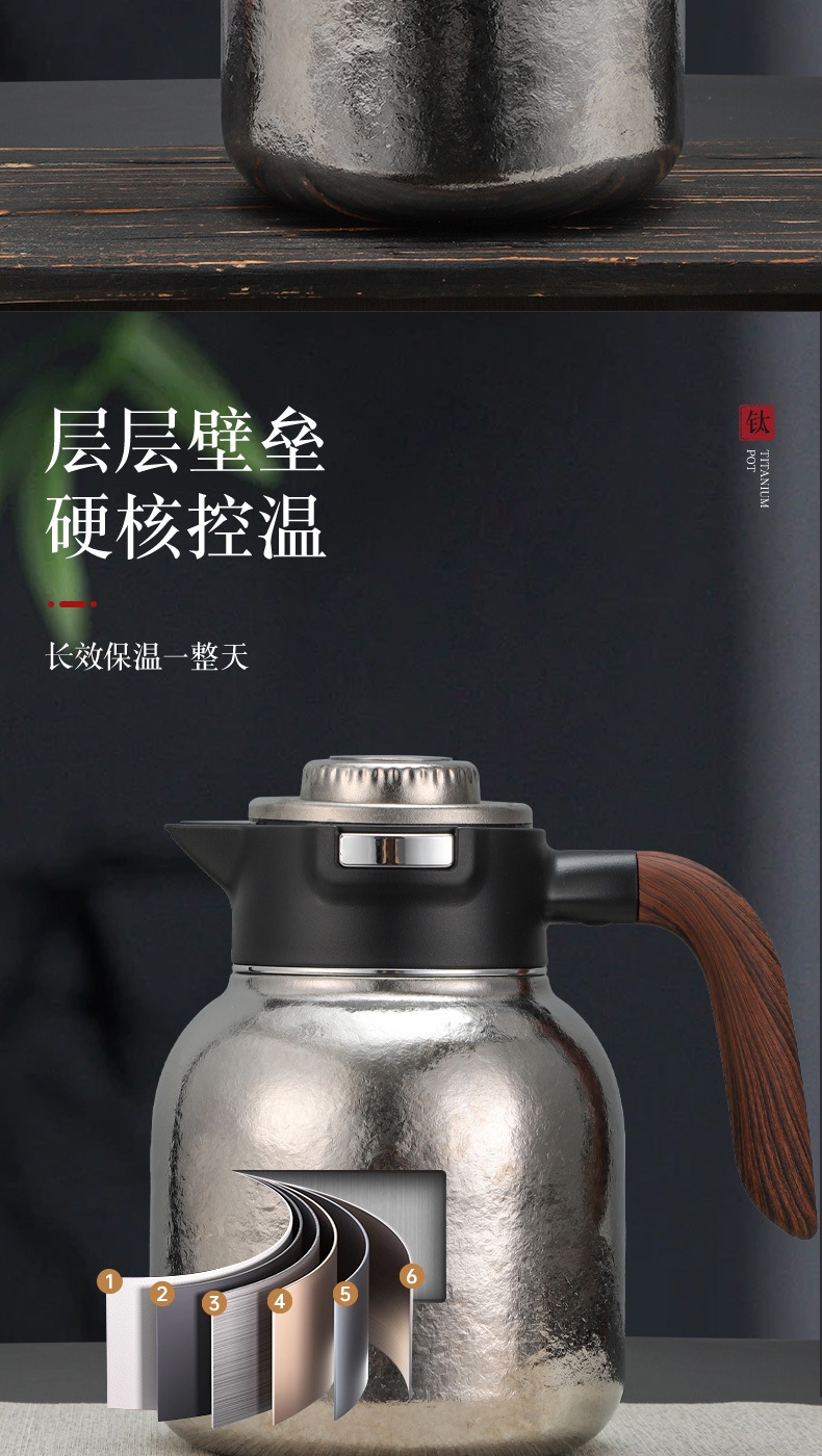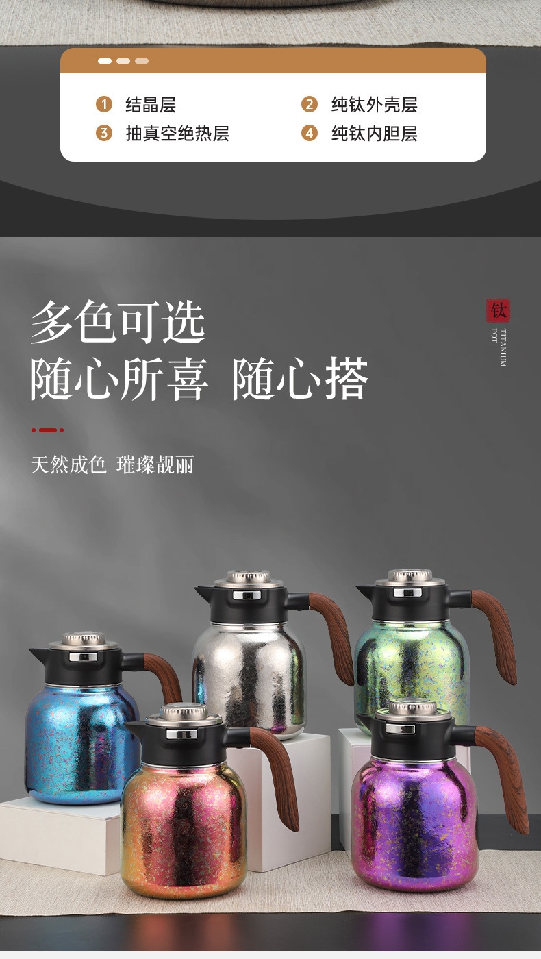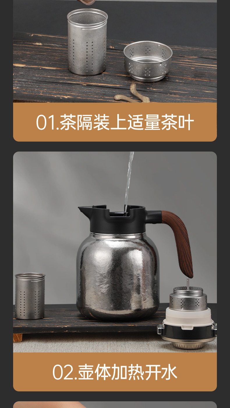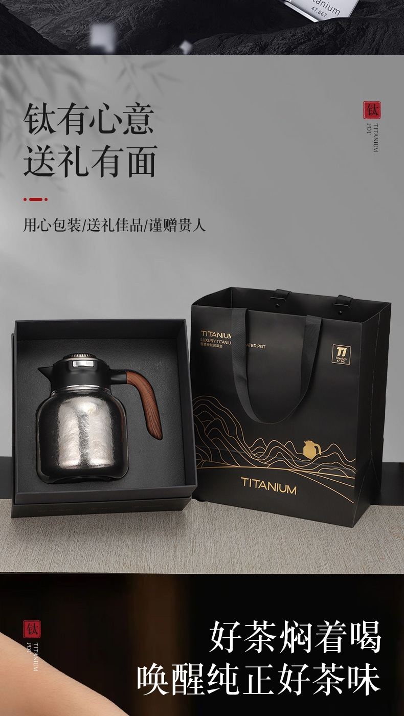 纯钛焖壶品茶本味 抑菌保鲜:机械温显:茶水分离;随心焖泡,一壶到位抗菌保鲜,茶叶久焖香醇;养身泡鲜茶,耐酸碱,不生锈充分保留茶饮原汁原味;机械温显开合一体,即是温显,也是开关,告别传统压柄;茶水分离,饮茶不吐渣,大容量加长滤网与水接触更充分
