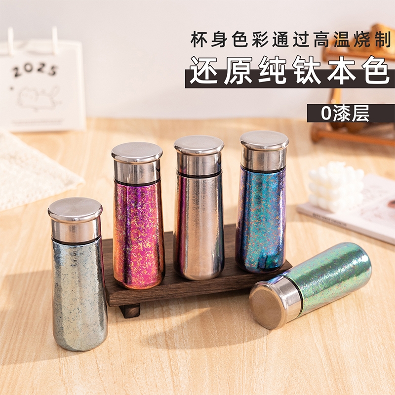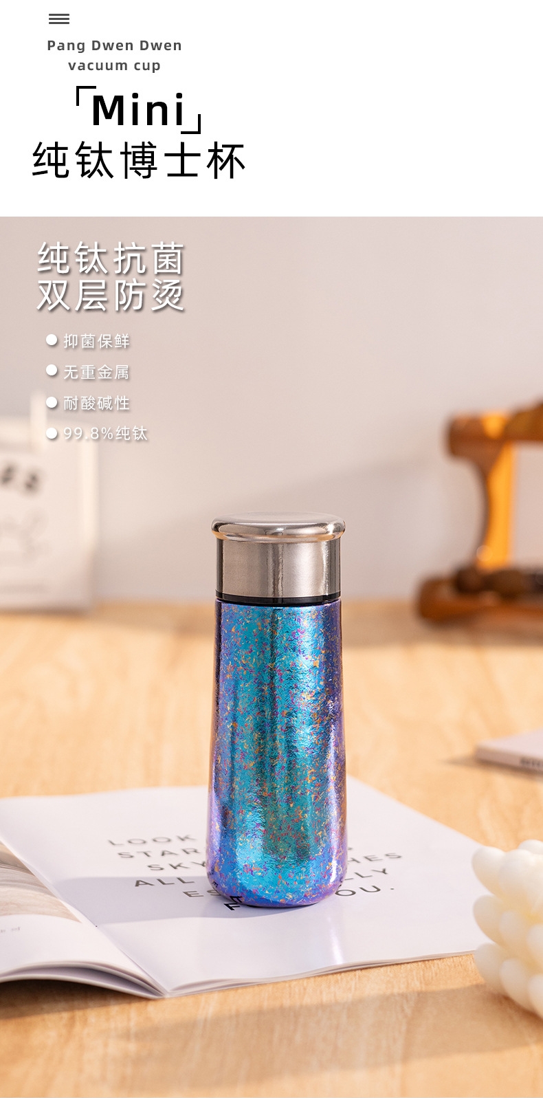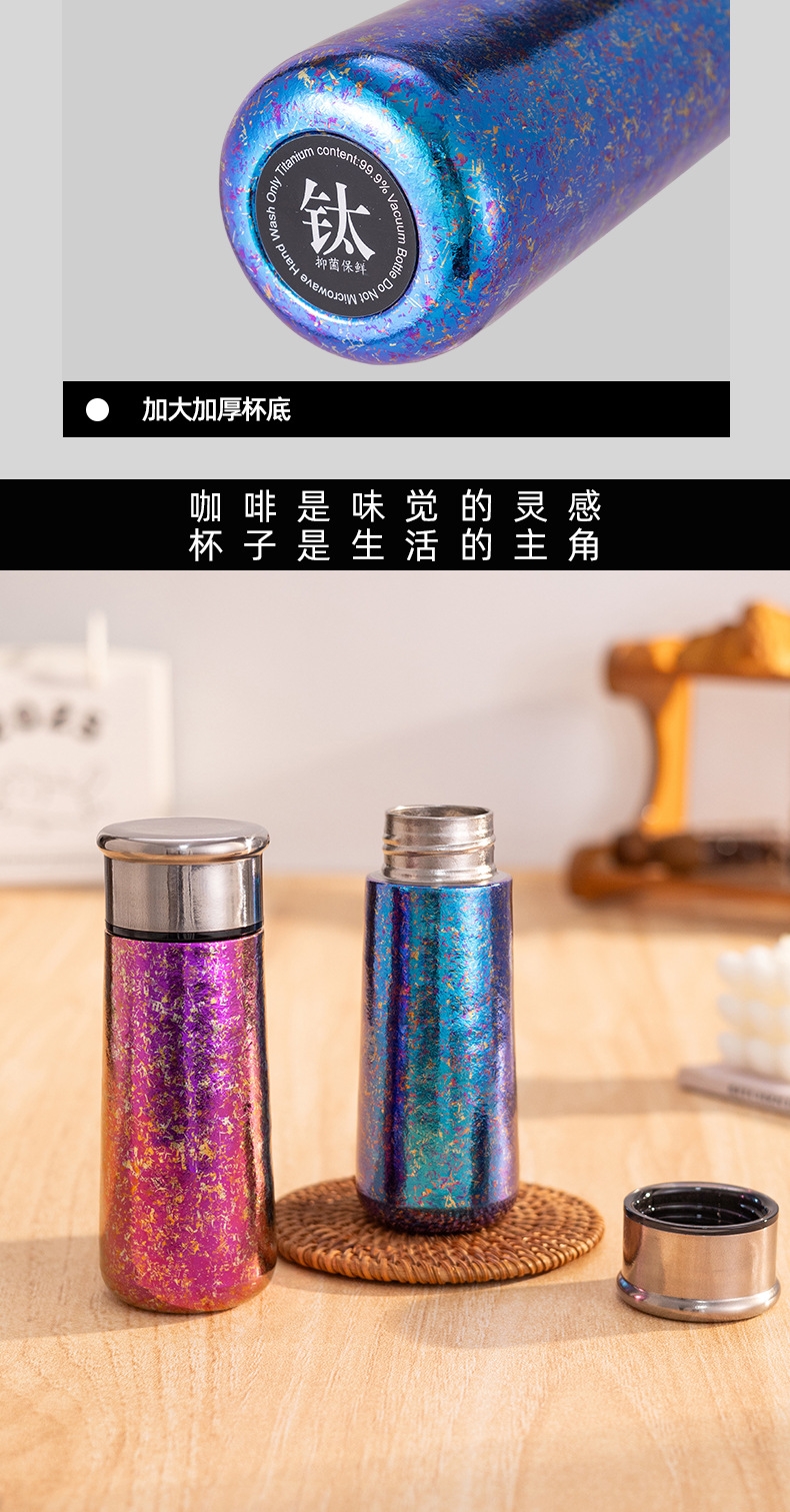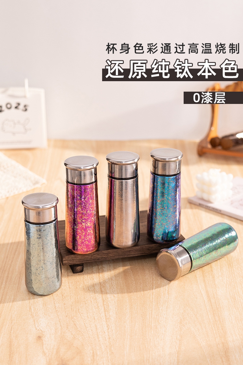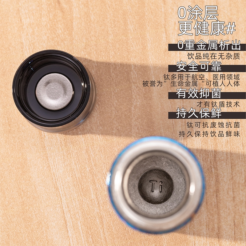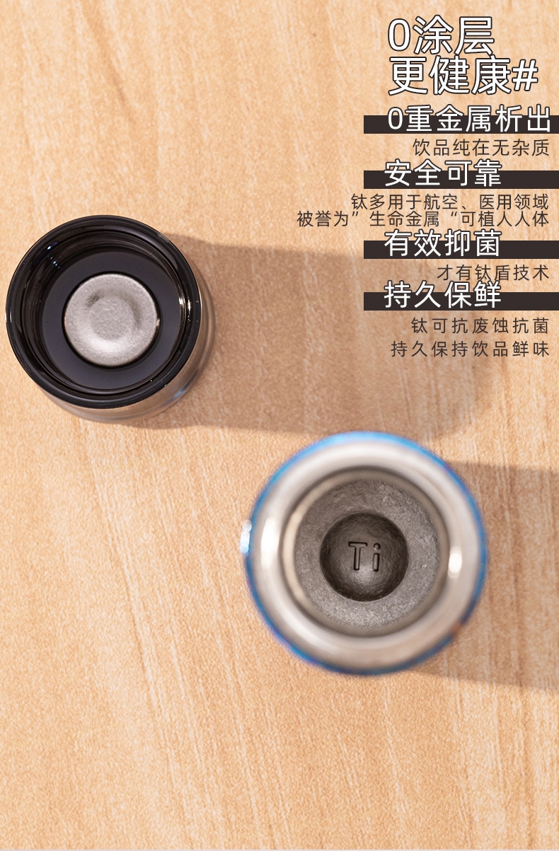 纯钛抗菌双层防烫 ●抑菌保鲜●无重金属● 耐酸碱性;冬日饮茶口袋装 灵感源于家庭温暖饮茶场景,圆润设计;我们以家的起点出发设计花卉系列在加上原钛的色系;经典螺纹 360°密封防漏 153克 真的很轻;螺纹杯口密封性好 倒置不漏水