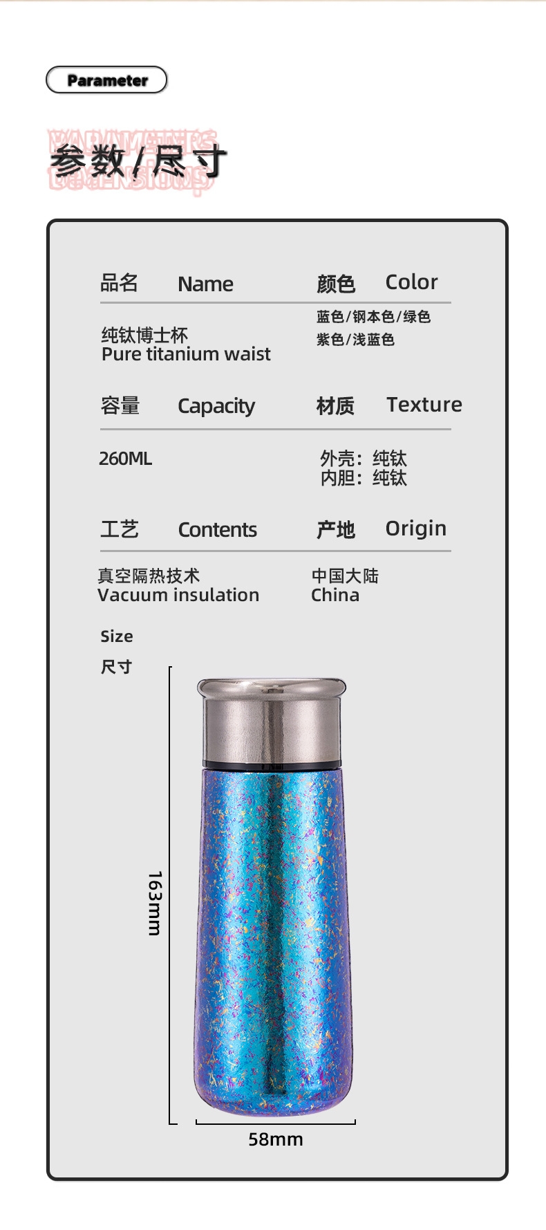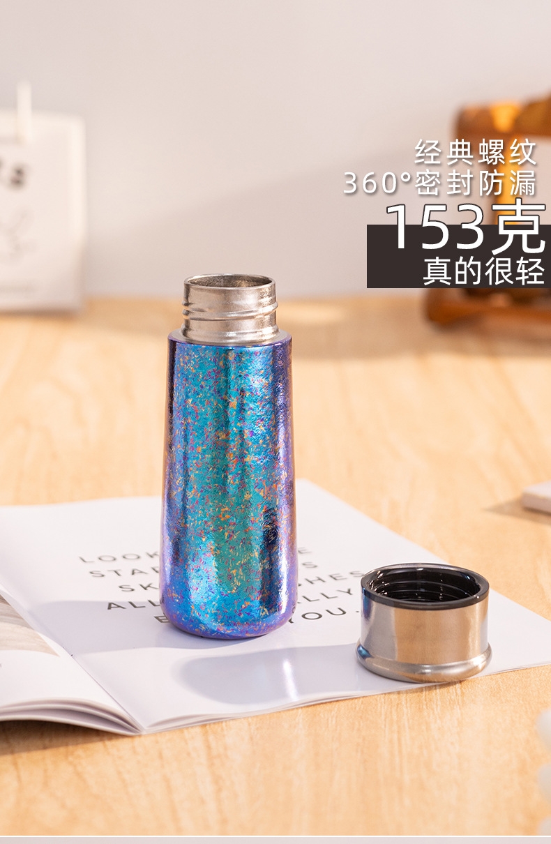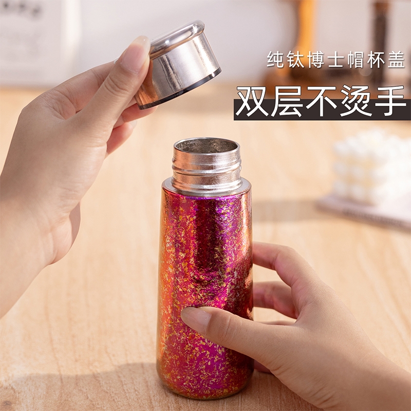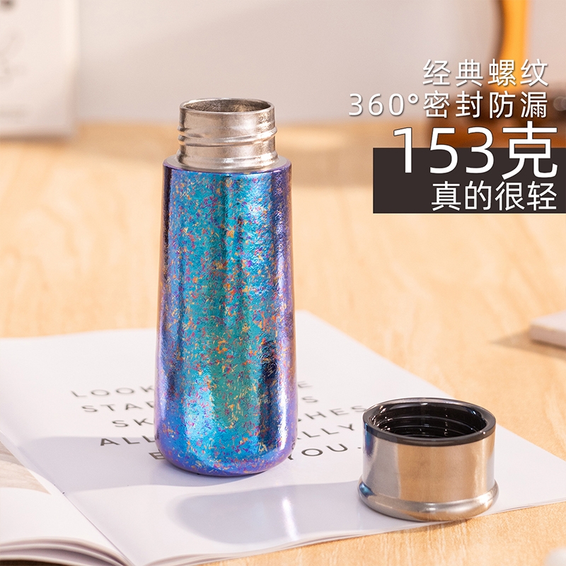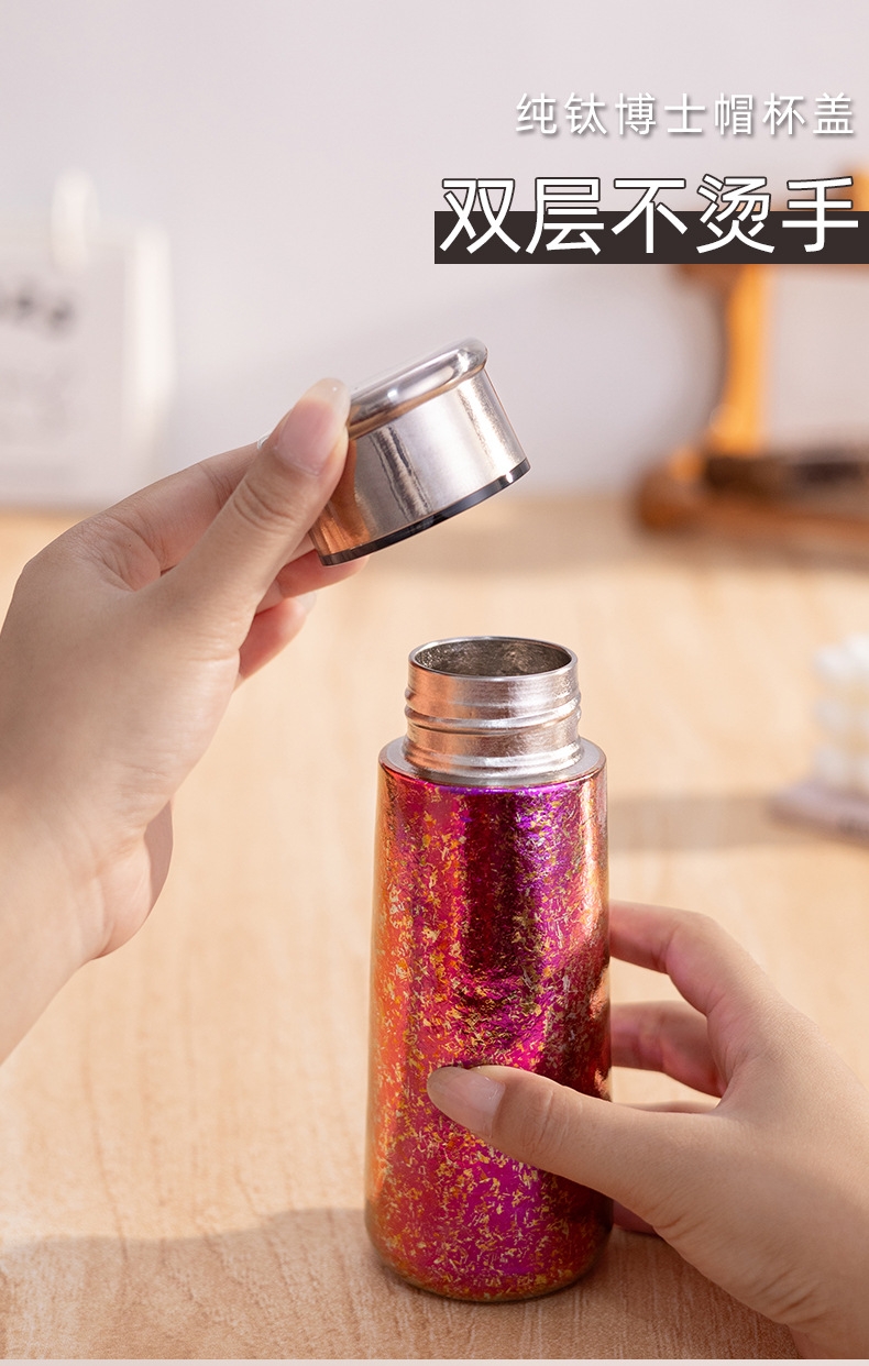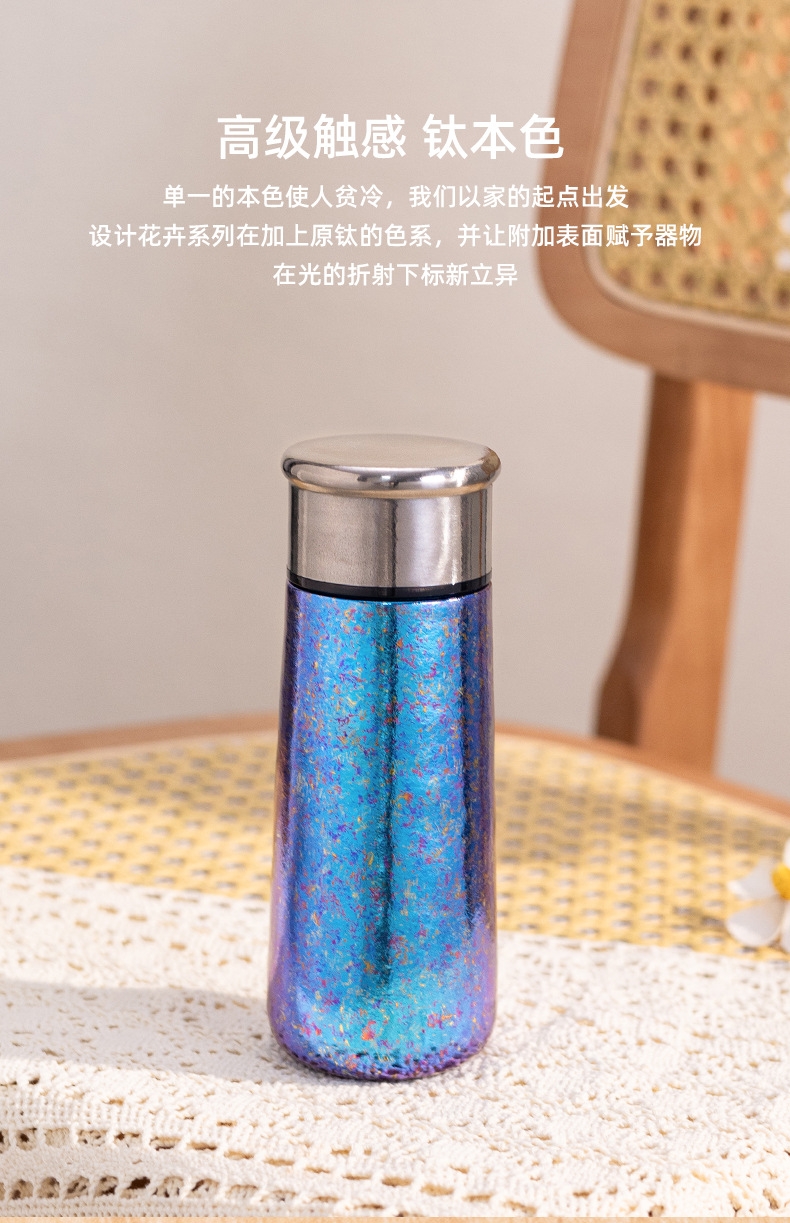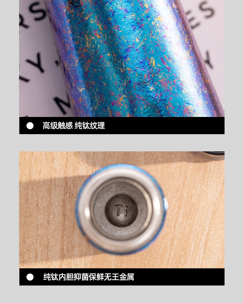 纯钛抗菌双层防烫 ●抑菌保鲜●无重金属● 耐酸碱性;冬日饮茶口袋装 灵感源于家庭温暖饮茶场景,圆润设计;我们以家的起点出发设计花卉系列在加上原钛的色系;经典螺纹 360°密封防漏 153克 真的很轻;螺纹杯口密封性好 倒置不漏水