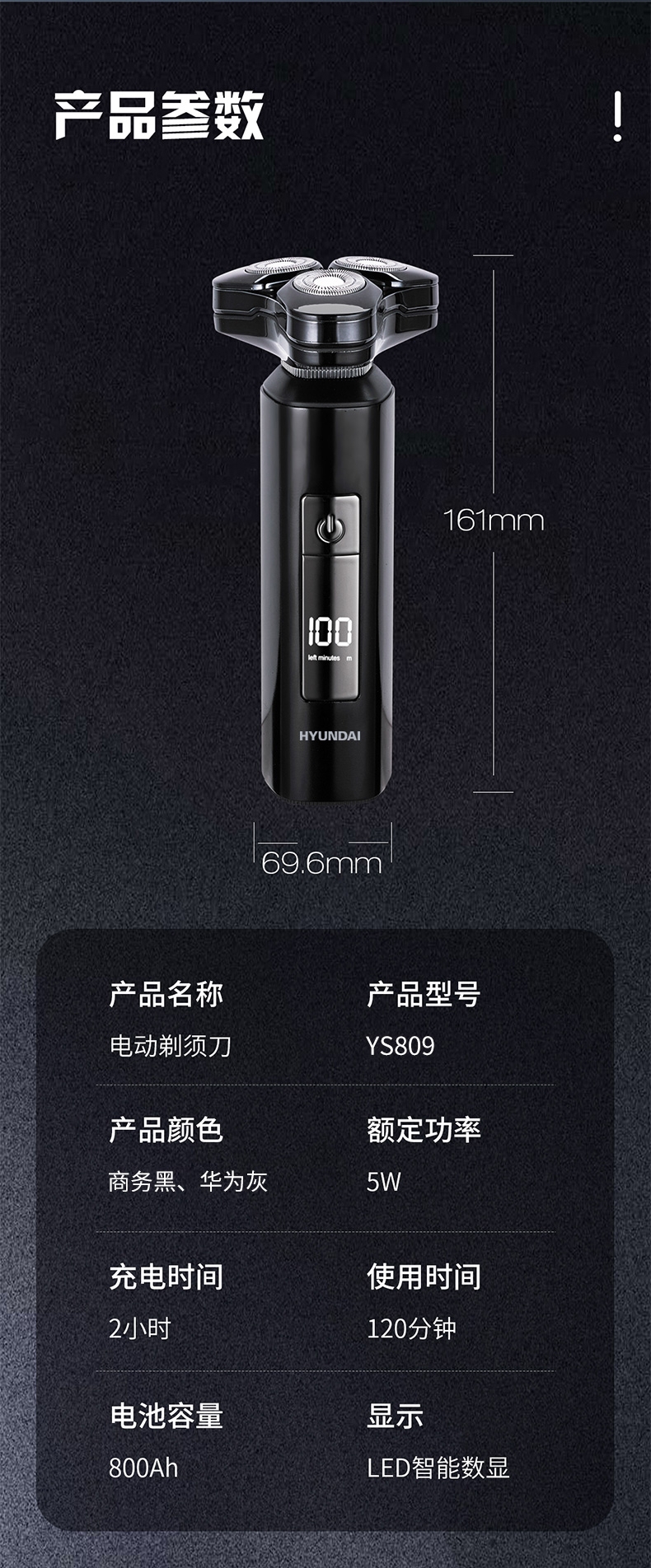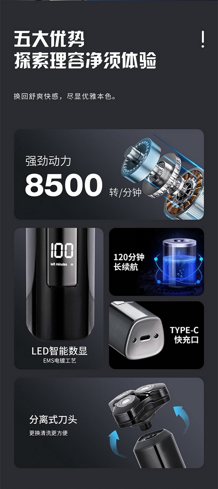 长续航60天;IPX7防水,可全身水洗;8500转速