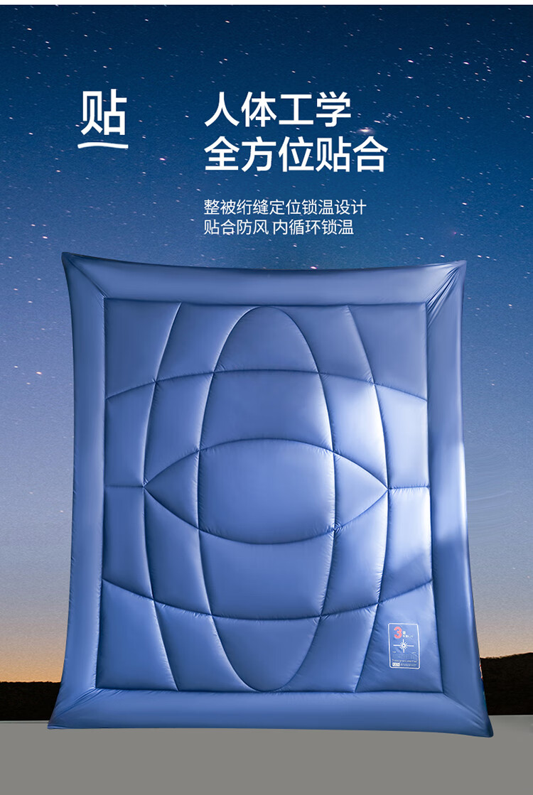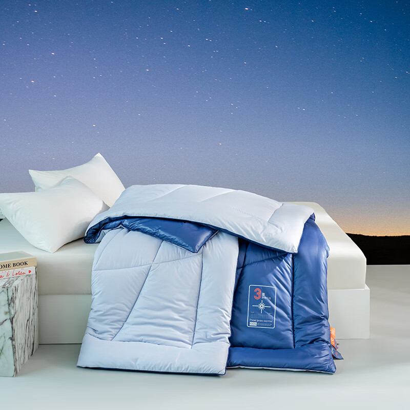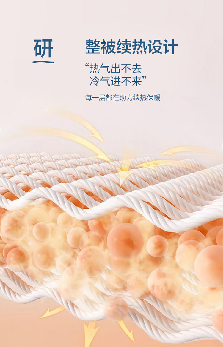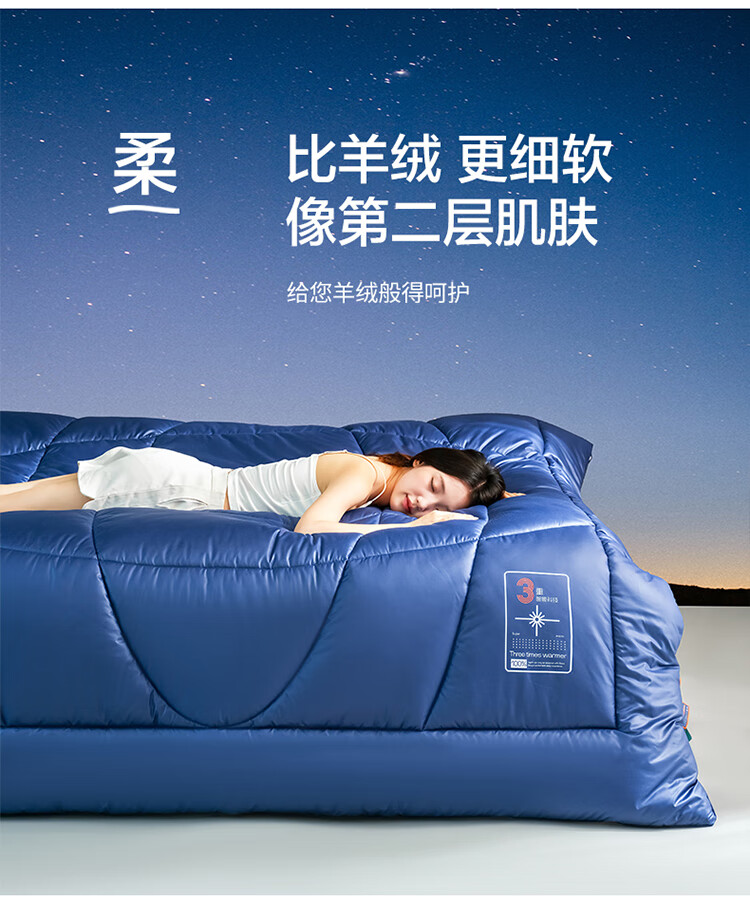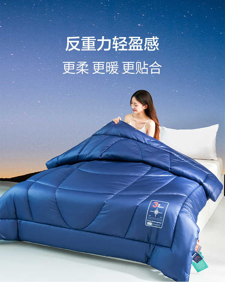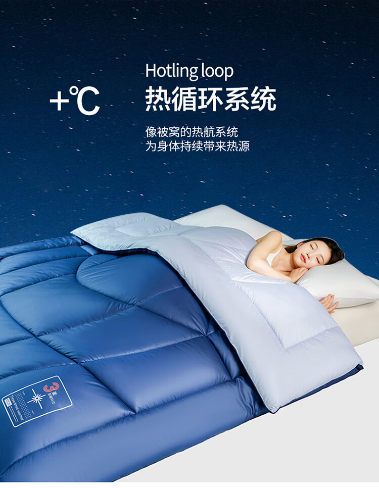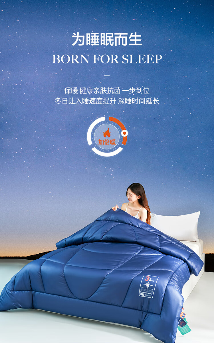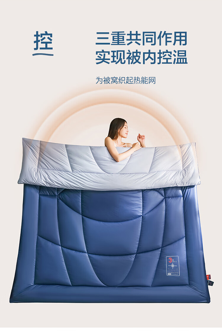 一重高效蓄热纤维可快速升温;二重细旦德绒纤维持续控温;三重三维蓬松纤维舒爽畅睡,多重智能纤维织起热能网;恒温入梦,还原理想睡眠;绗缝定位设计,固定填充,不易结团