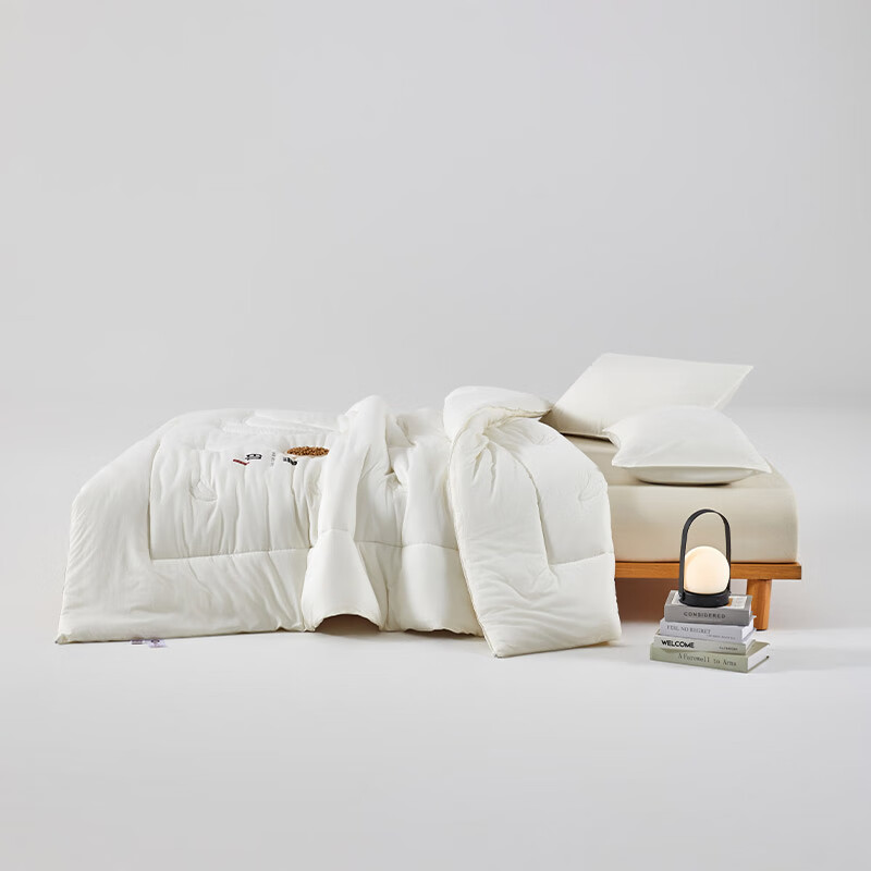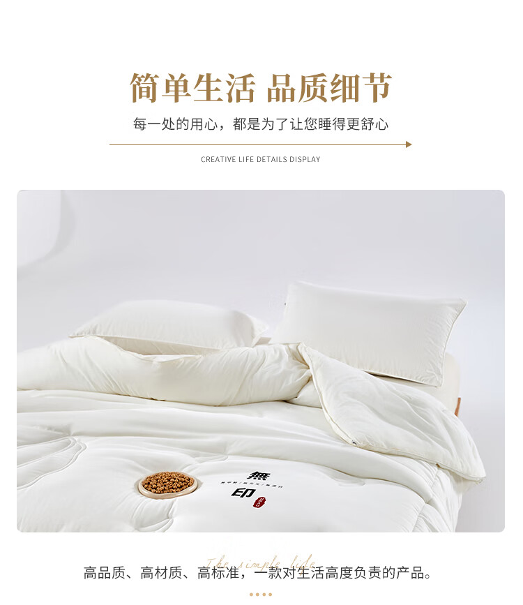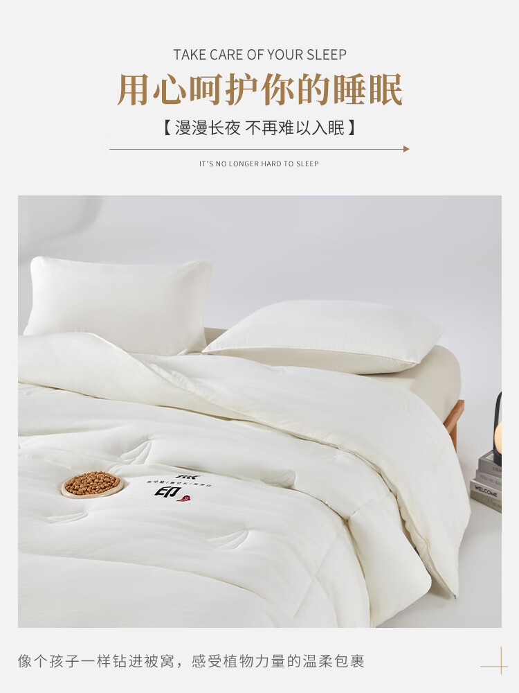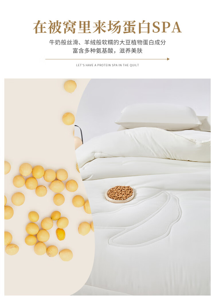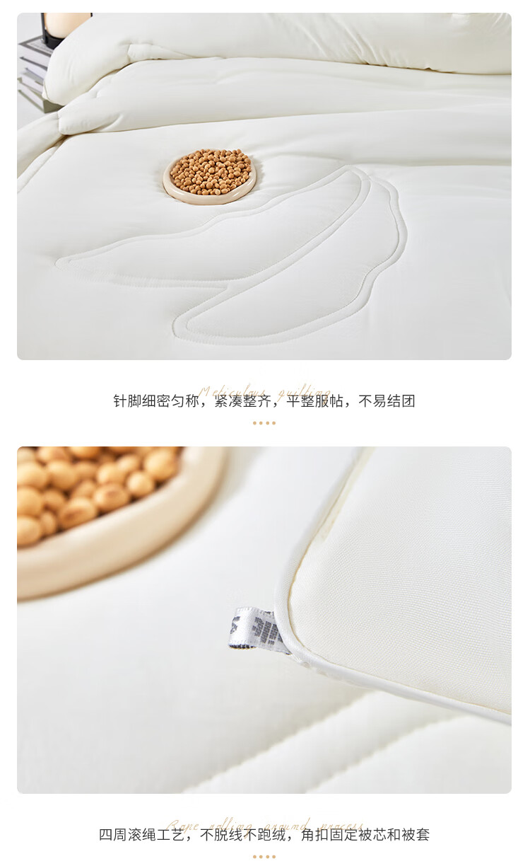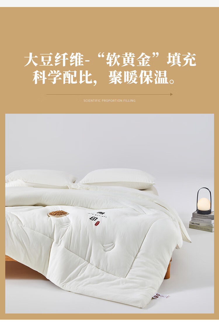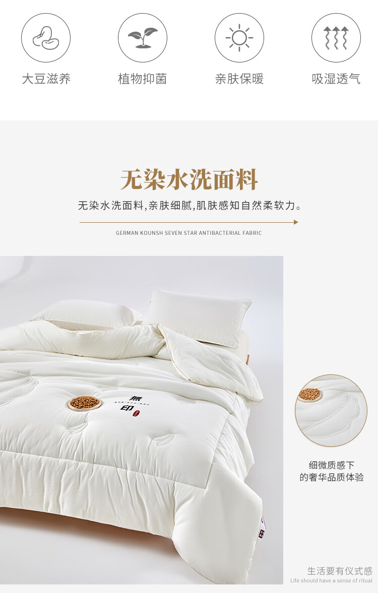 无染水洗面料,亲肤细腻,肌肤感知自然柔软力。;大豆纤维-“软黄金”填充,科学配比,聚暖保温。;高品质、高材质、高标准,一款对生活高度负责的产品。