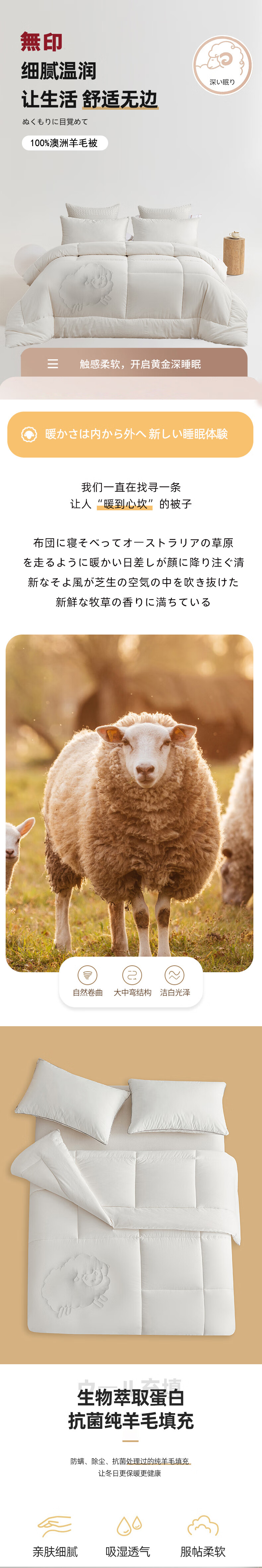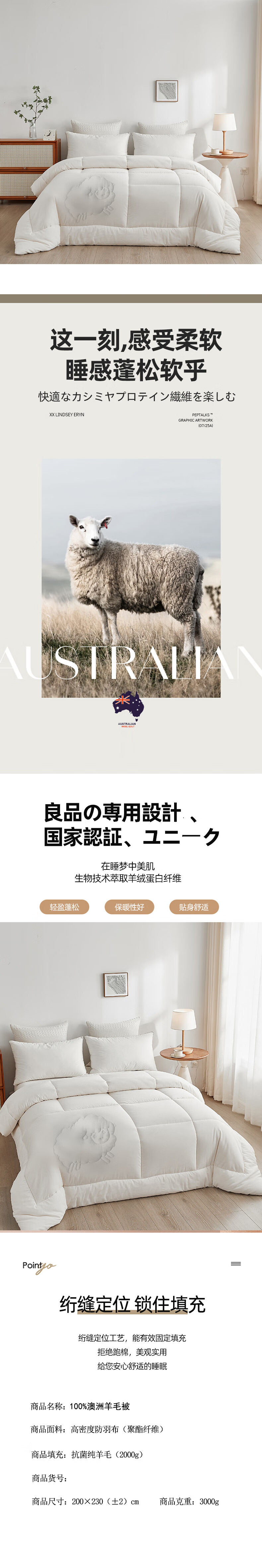 高密度/防钻毛/抗静电的高密防羽布,对绒类产品的极;防螨,除尘,抗菌处理过的纯羊毛填充,让冬日更保暖更;高品质、高材质、高标准,一款对生活高度负责的产品。