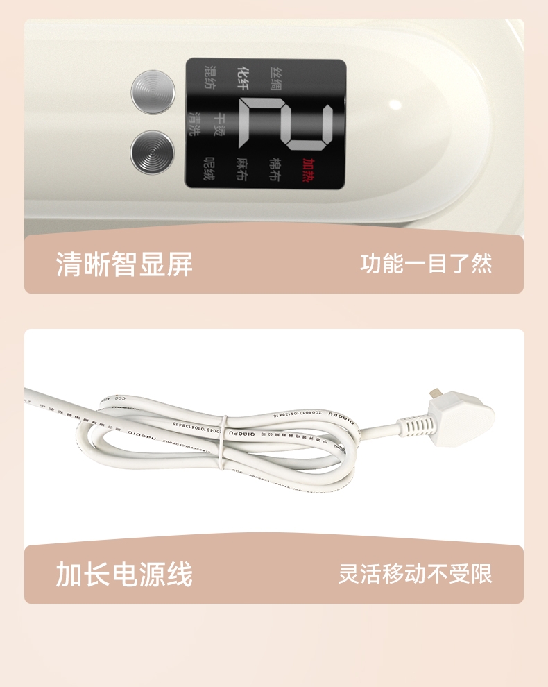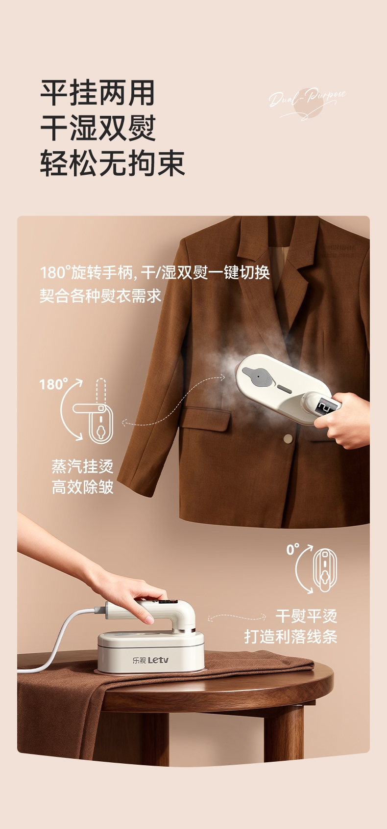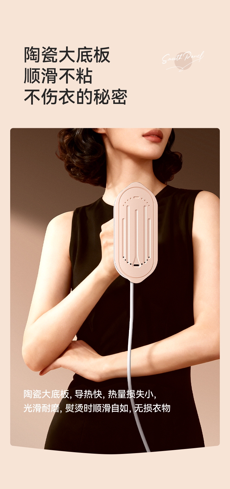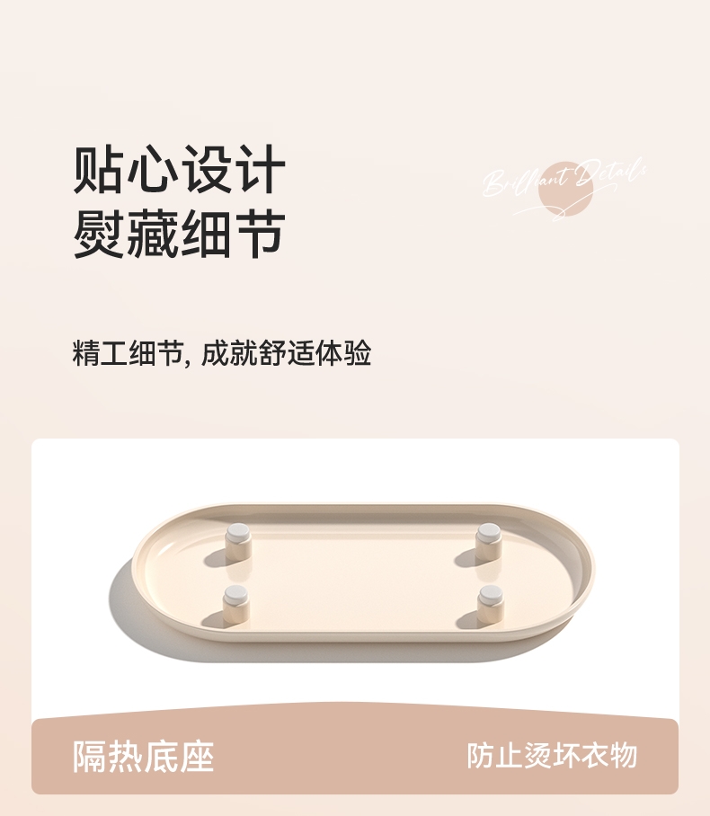 急速预热、支持垂直熨烫;双尖角设计、顺滑底板; 180°旋转手柄