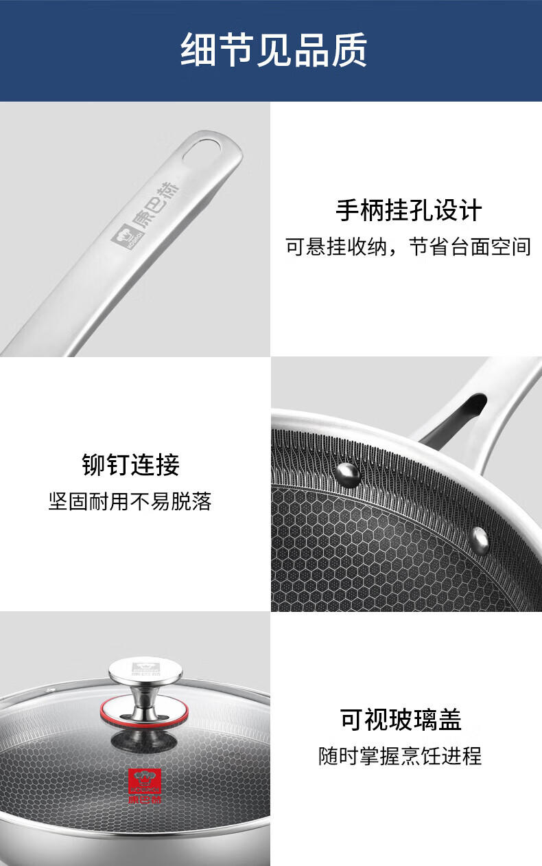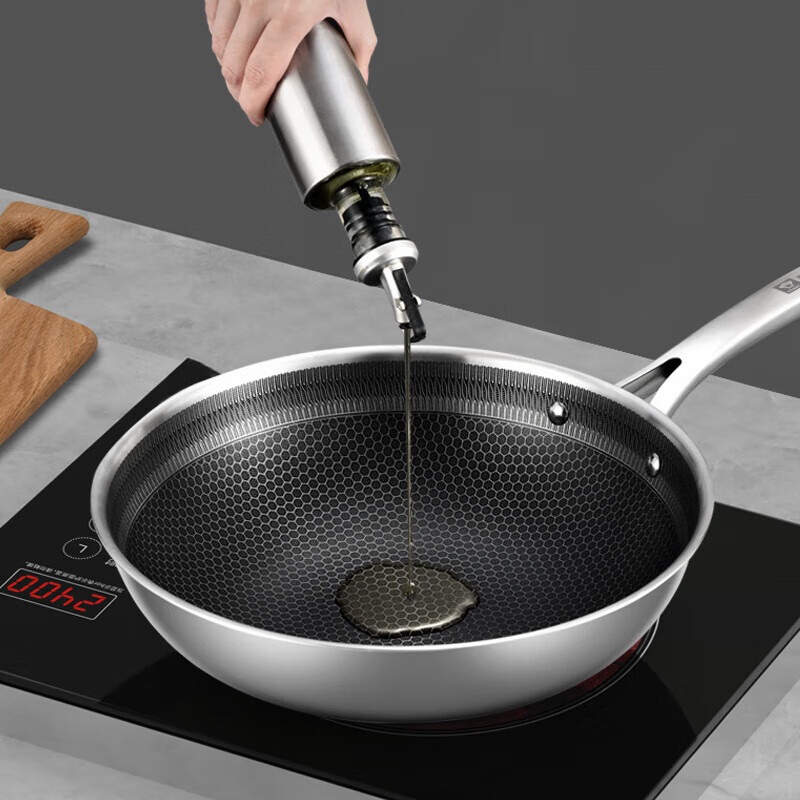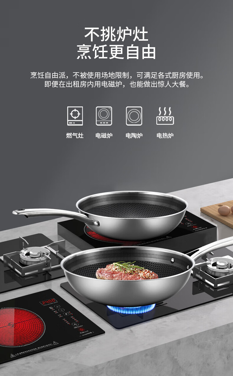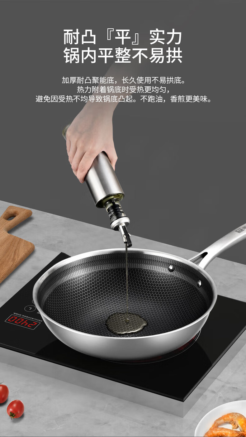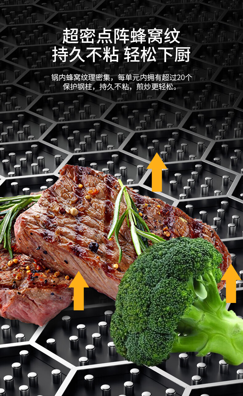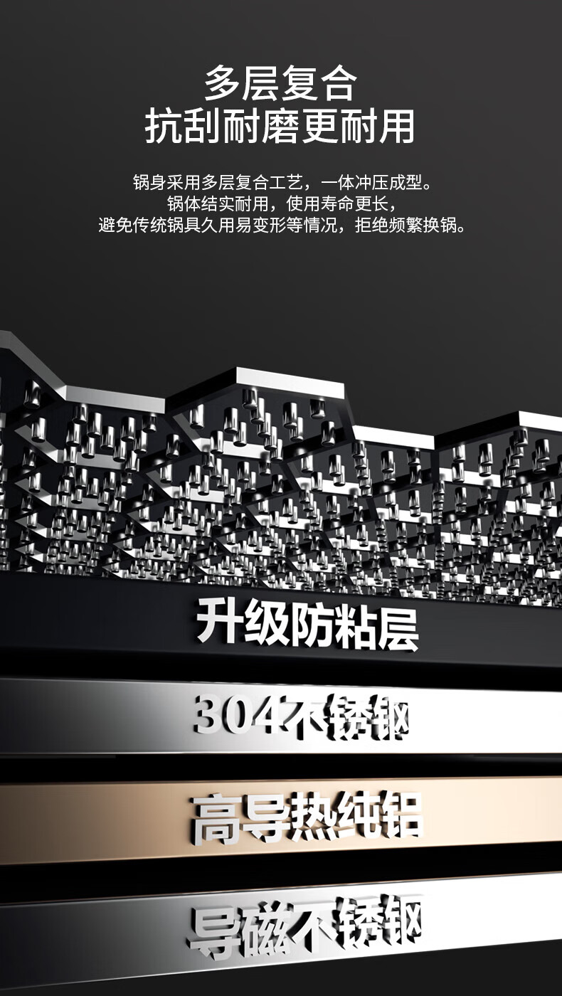 锅体采用304食品级不锈钢,材质健康;超密点阵蜂窝纹,持久不粘 轻松下厨;锅身采用多层复合工艺,一体冲压成型