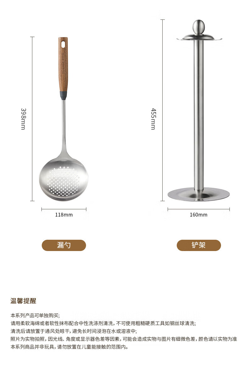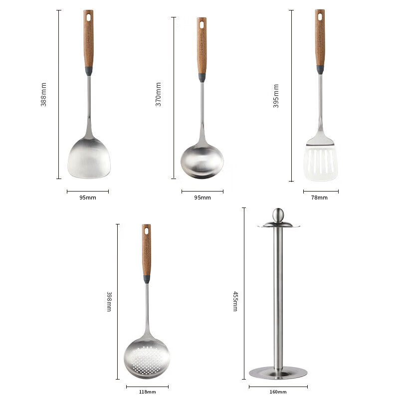 尺寸:锅铲9.5cm*38.8cm 煎铲7.8cm*39.5cm 汤勺9.5cm*39.8cm漏勺12cm*39.8cm线漏16cm*45cm