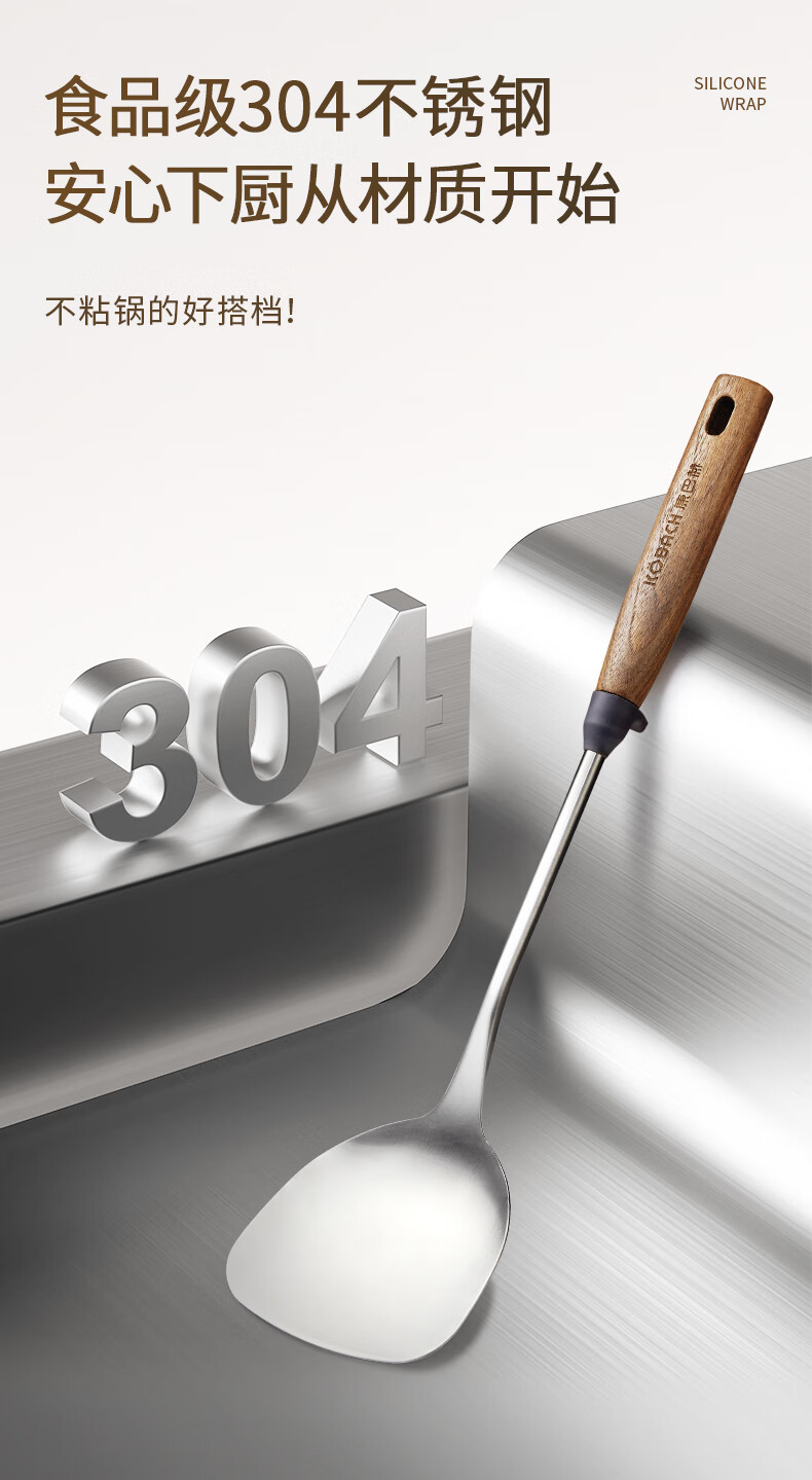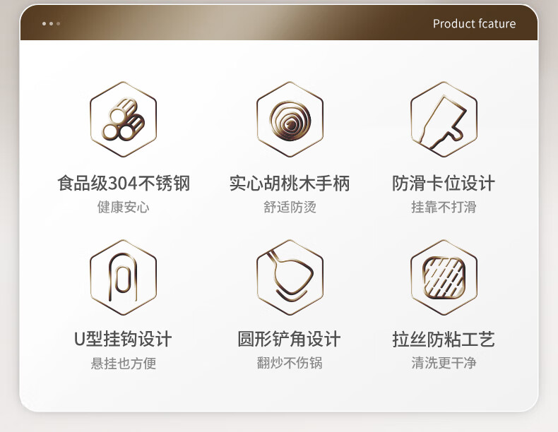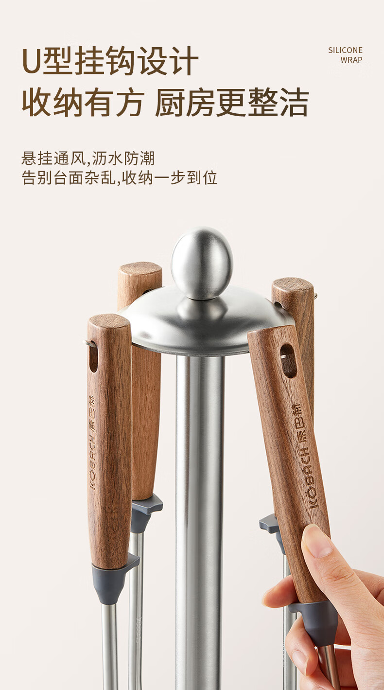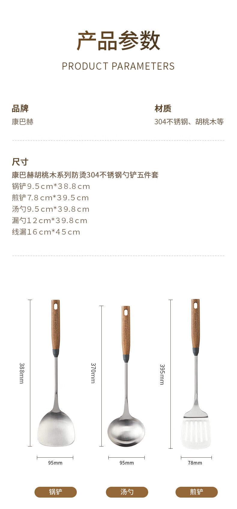 304不锈钢材质,食品级材质接触更放心;实心胡桃木手柄,隔热防烫美观耐用;U型挂钩设计,悬挂收纳通风沥水