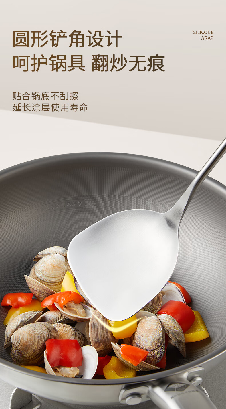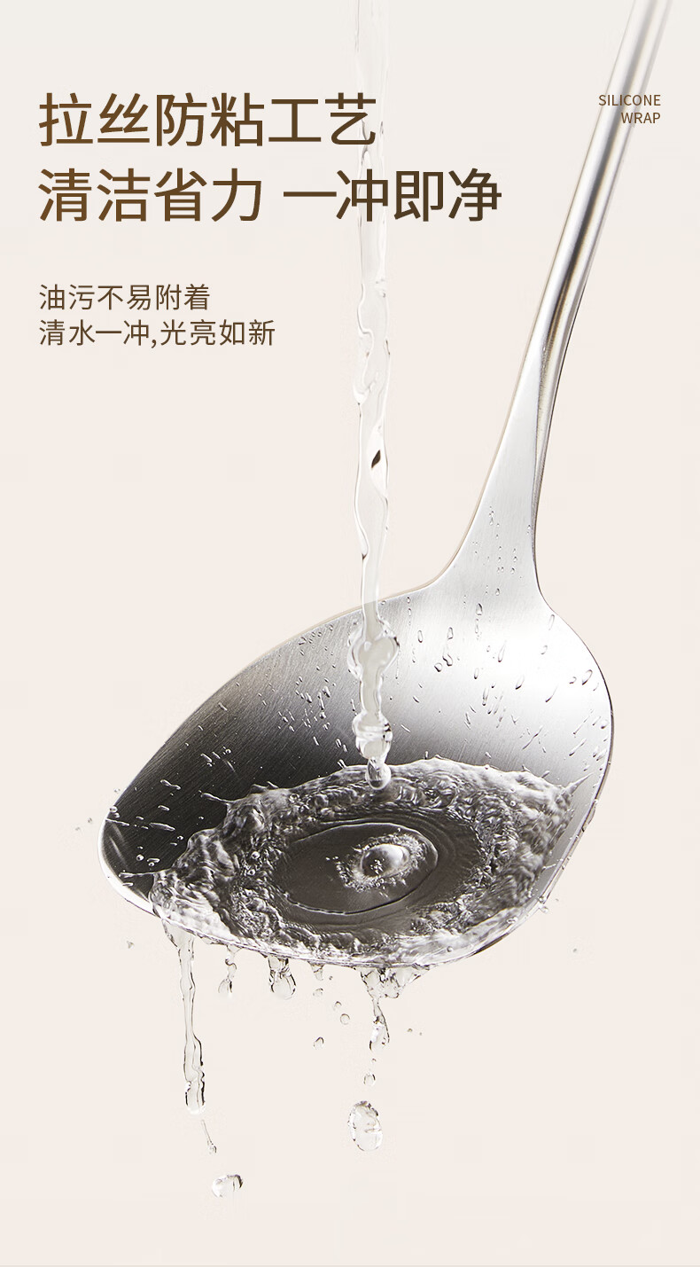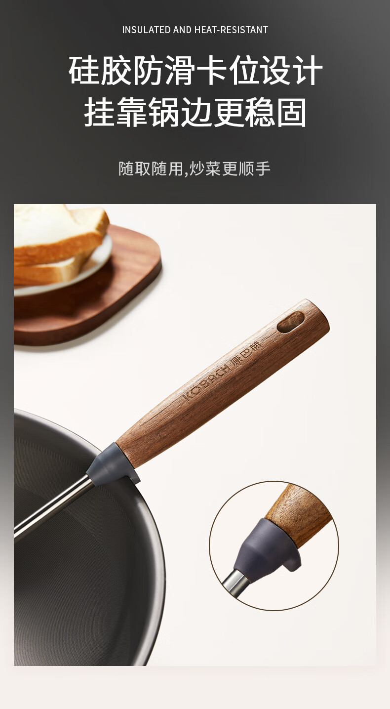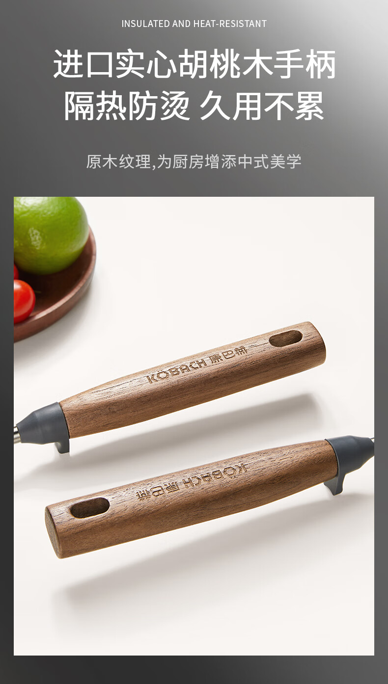 304不锈钢材质,食品级材质接触更放心;实心胡桃木手柄,隔热防烫美观耐用;U型挂钩设计,悬挂收纳通风沥水