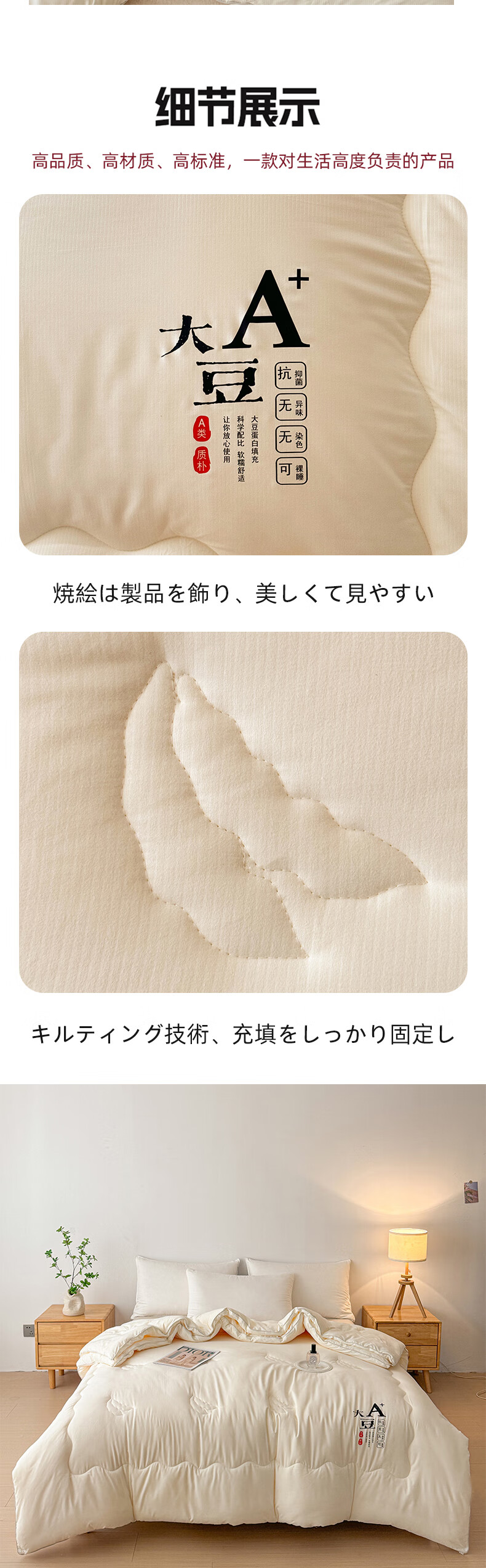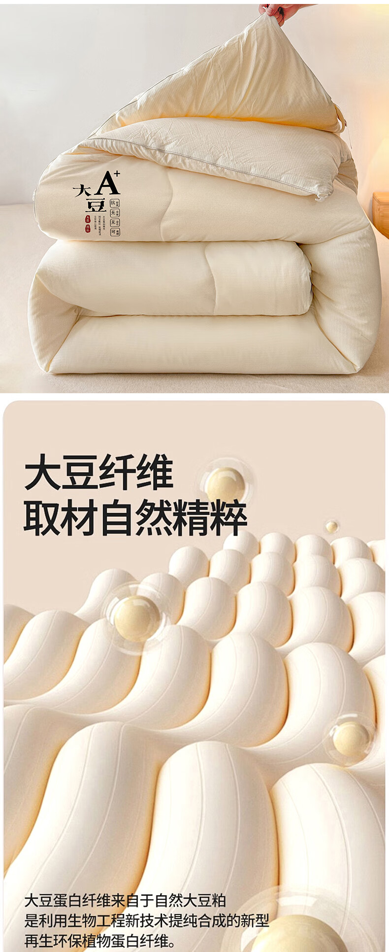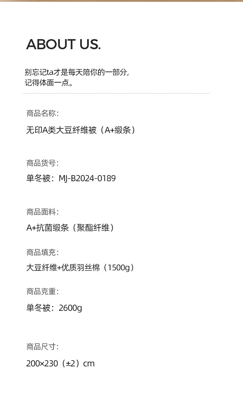A+抗菌/抑菌面料,贡缎织造,亲肤细腻,肌肤感知自;大豆纤维-“软黄金”填充,科学配比,聚暖保温。;高品质、高材质、高标准,一款对生活高度负责的产品。